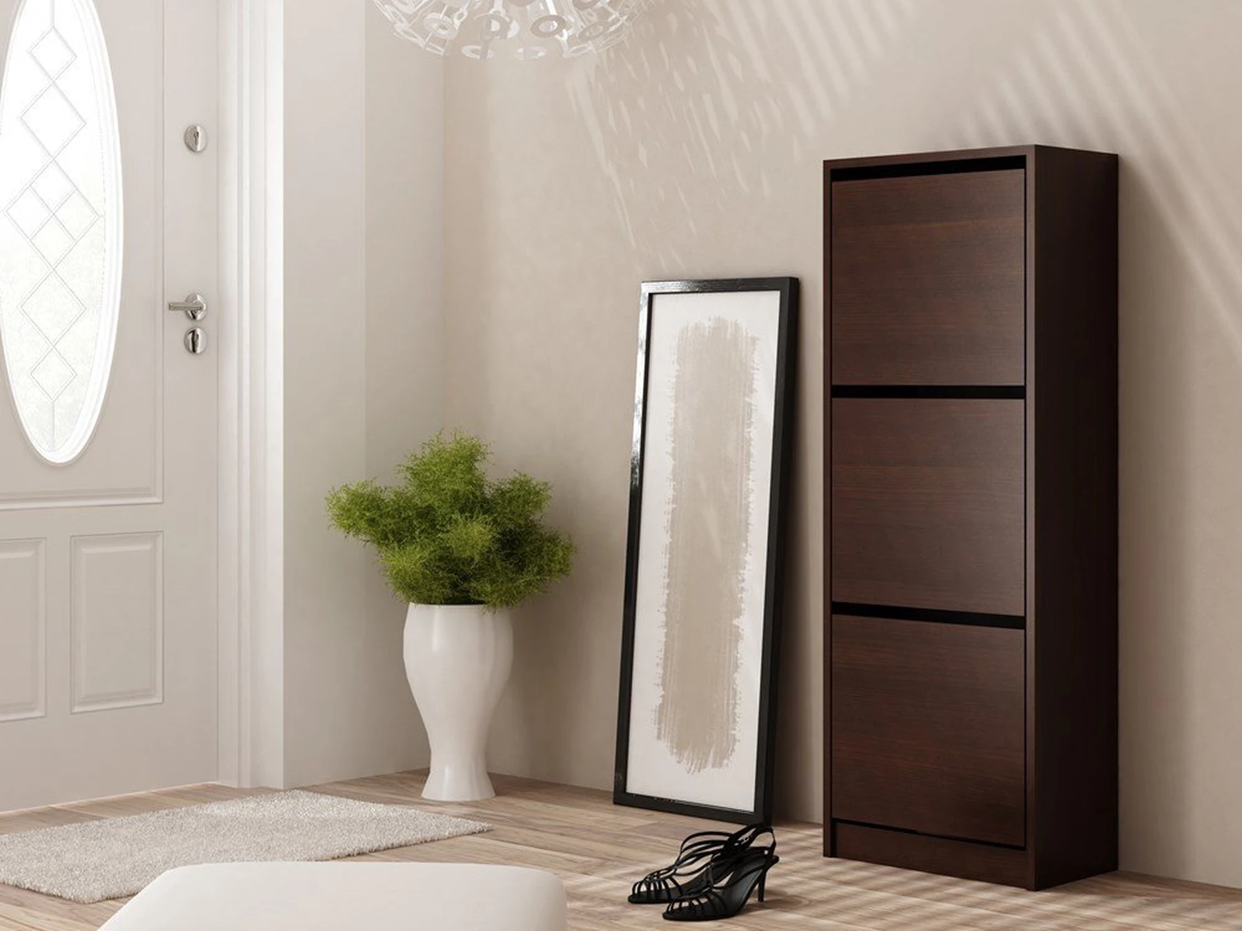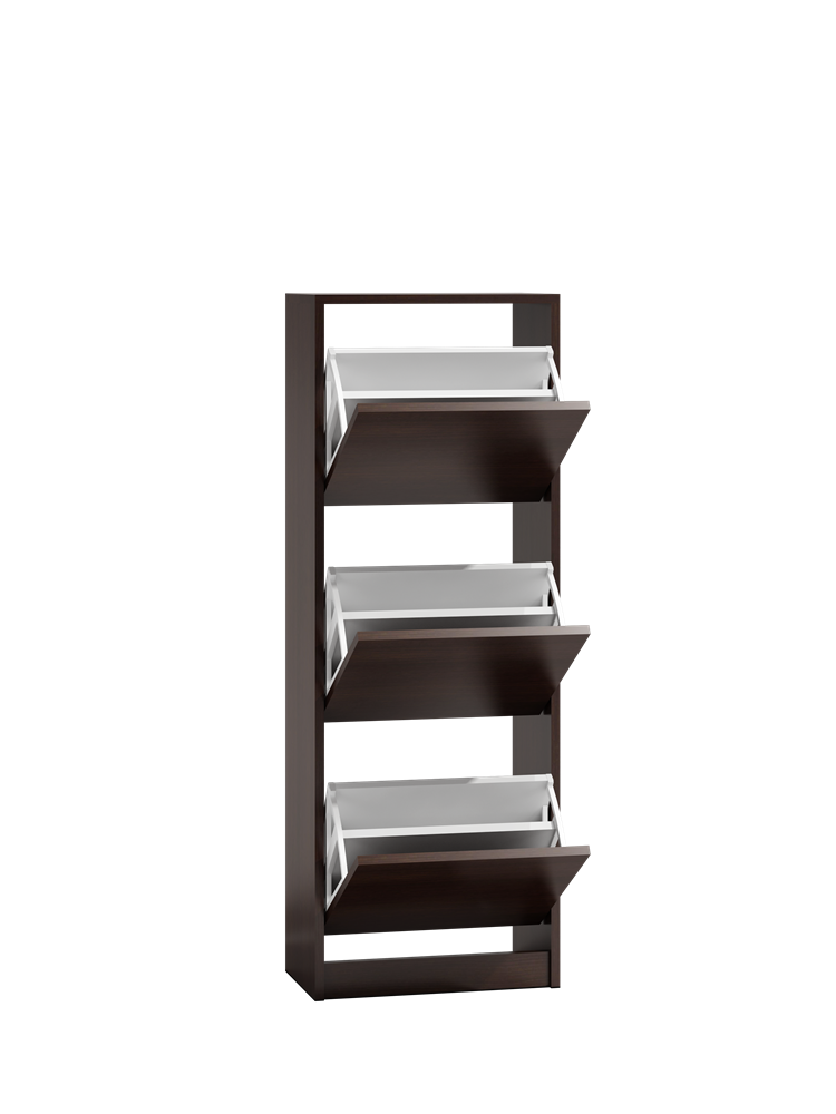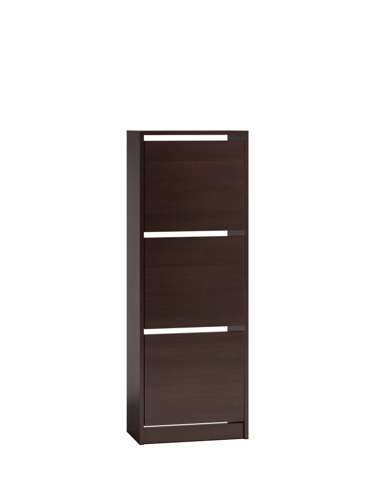 Trijų durelių spintelė batams sudėti;Durelės atsidaro žemyn;Korpusas ir fasadas pagaminti iš 18 mm storio laminuotos medžio drožlių plokštės (MDP);Spintelės kraštai dengti mechaminiam ir cheminiams pažeidimams atsparia PVC danga;Lengvai valomas, atsparus įbrėžimams paviršius;Spintelės išmatavimai: aukštis – 136 cm, plotis – 49 cm, gylis – 28 cm; Spintelės spalva: tamsiai ruda (wenge);Spintelės stalčiaus viduje: dviejų eilių plastikinis krepšys;