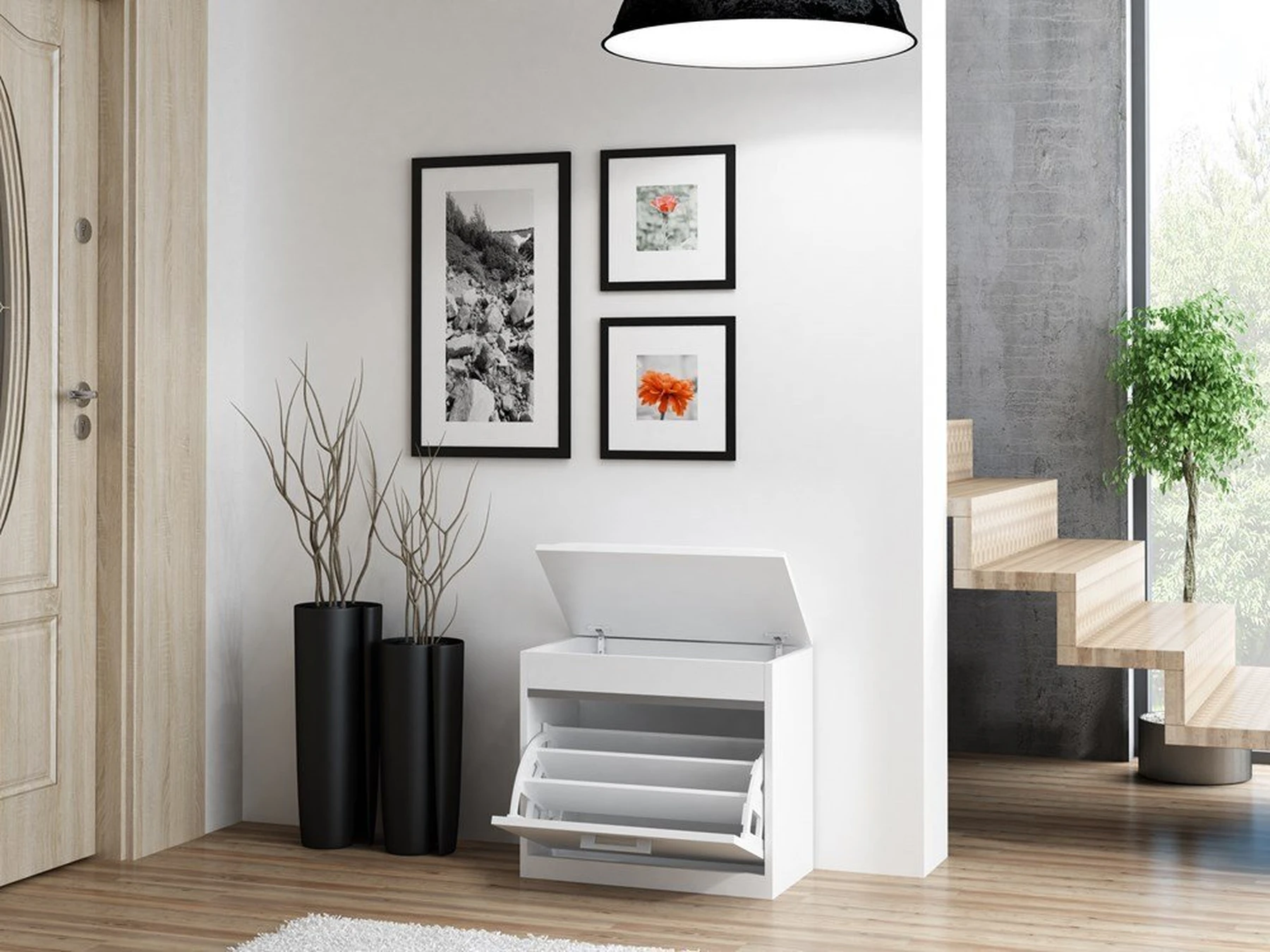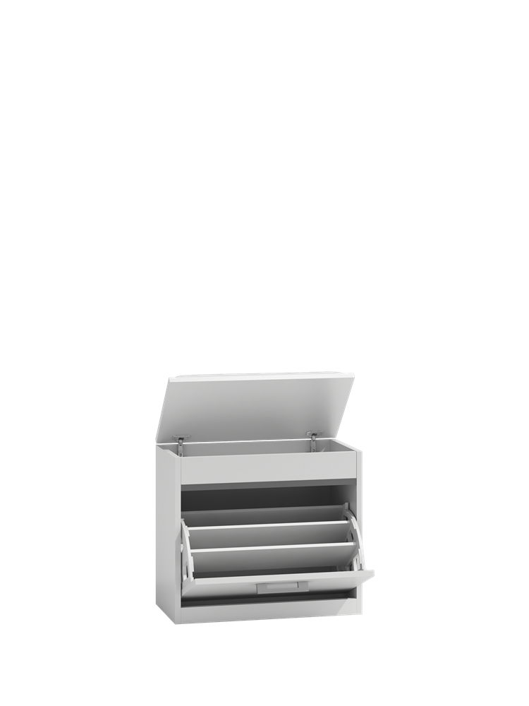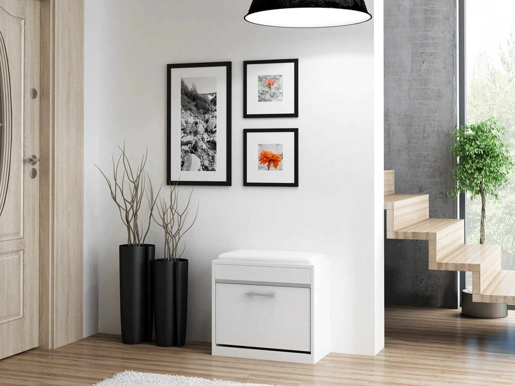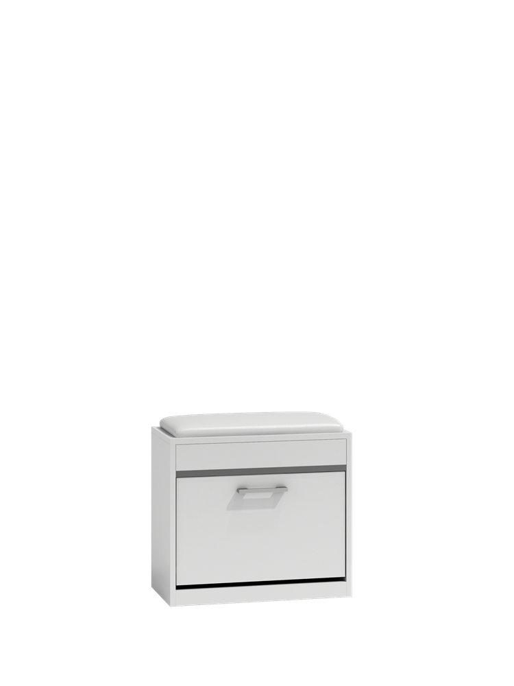 Batų spintelė su paminkštinta sėdimąja dalimi;1-ų atverčiamų durelių, jų viduje - 3 skyriai batams; Po atidaroma sėdimąja dalimi yra daiktadėžė smulkiems aksesuarams susidėti;Pagaminta iš: 18 mm storio medžio drožlių plokštės (MDP);Spintelės kraštai dengti PVC danga, pasižyminčia dideliu mechaniniu ir cheminiu atsparumu;Išmatavimai: plotis - 60 cm, gylis - 30 cm, aukštis - 53 cm;Batų skyriaus gylis - 8 cm;Spalva - balta;