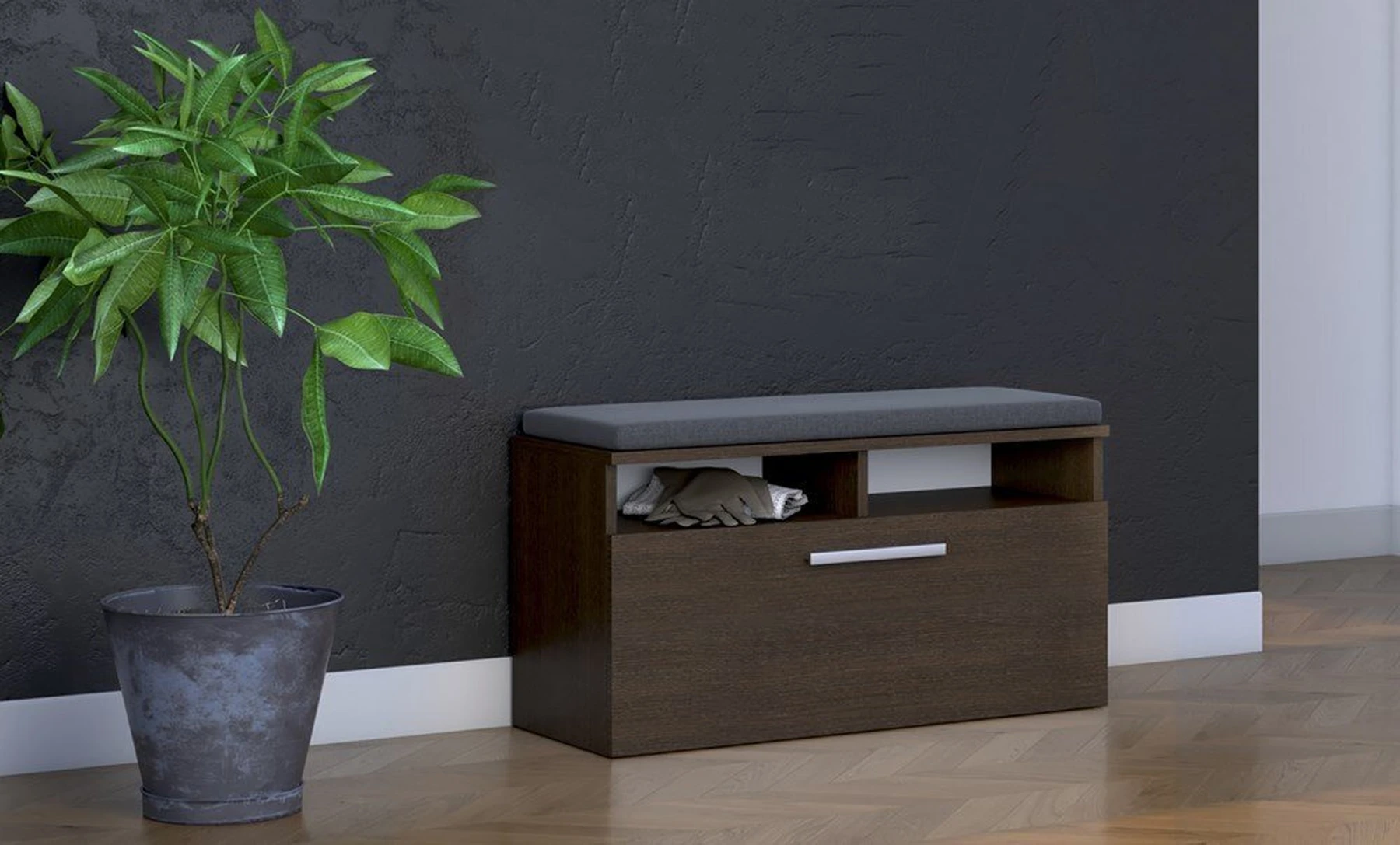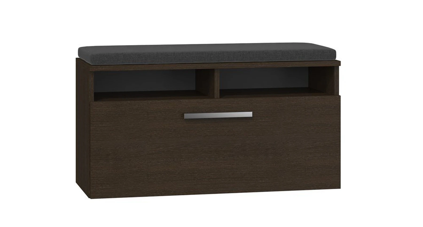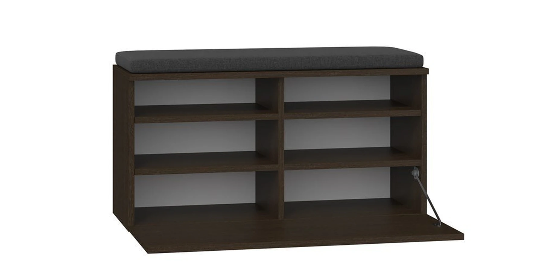Batų spintelė su paminkštinta sėdimąja dalimi;1-ų atverčiamų durelių, 6 lentynų;Pagaminta iš: laminuotos medžio drožlių plokštės (MDP), storis - 16mm;Batų spintelės kraštų apdailos medžiaga: ABS;Išmatavimai: plotis - 85 cm, gylis - 35 cm, aukštis - 46 cm;Spalva - ruda;