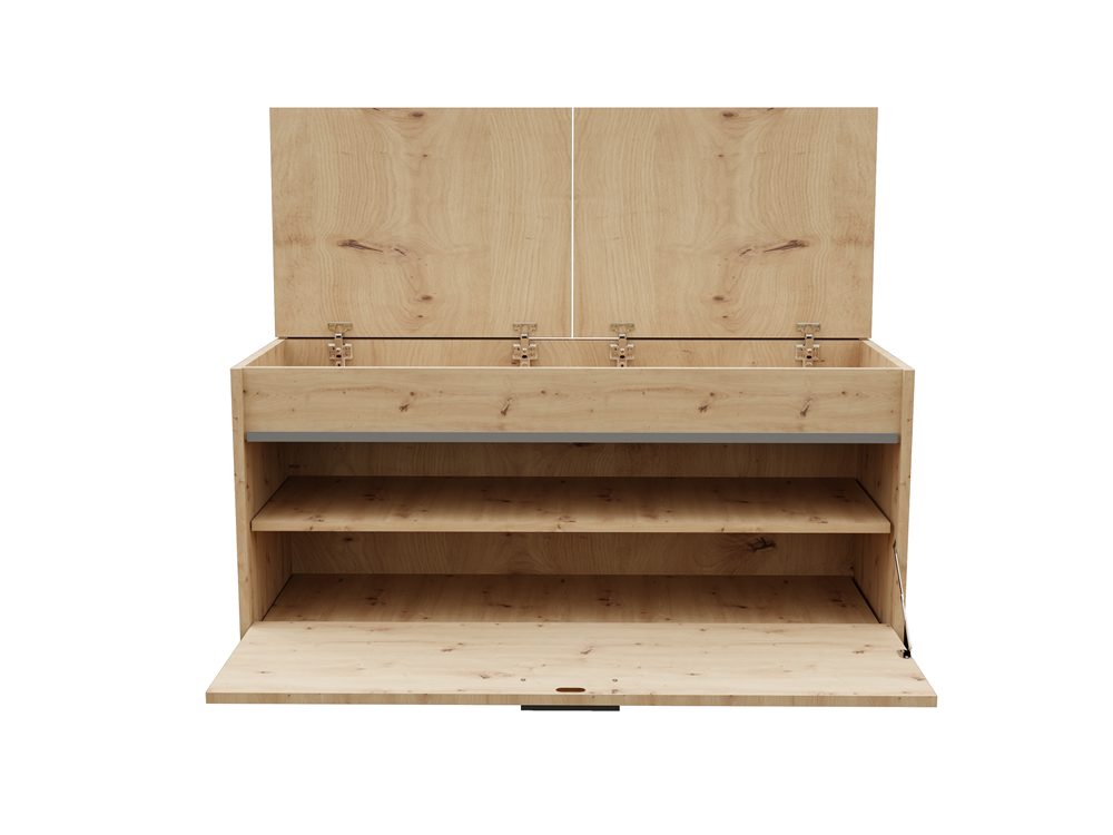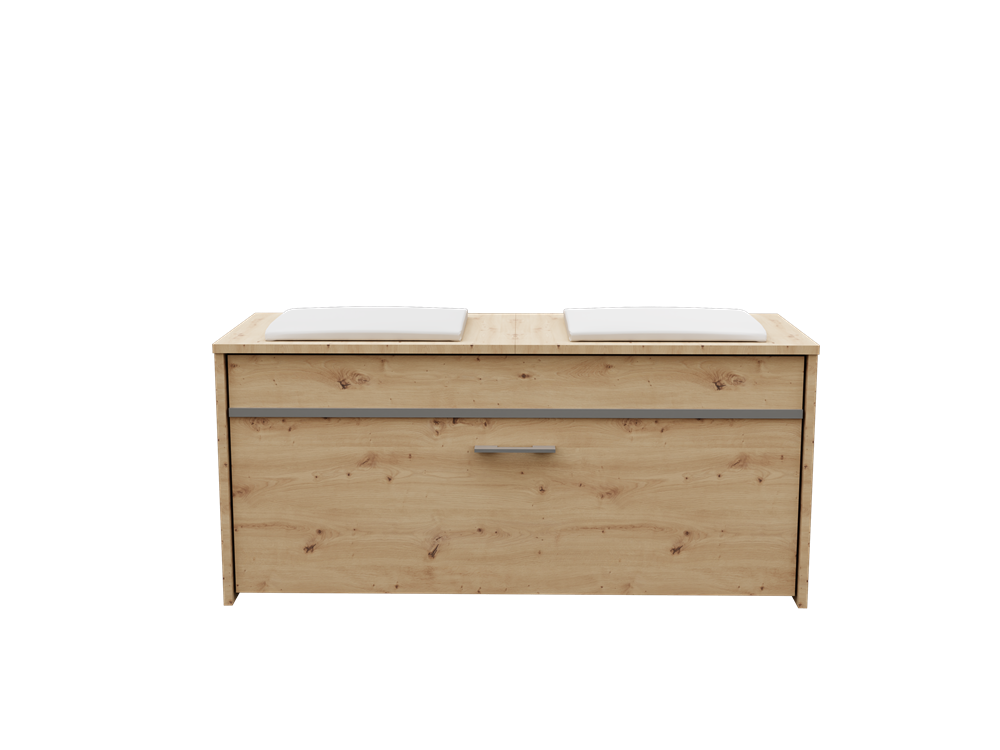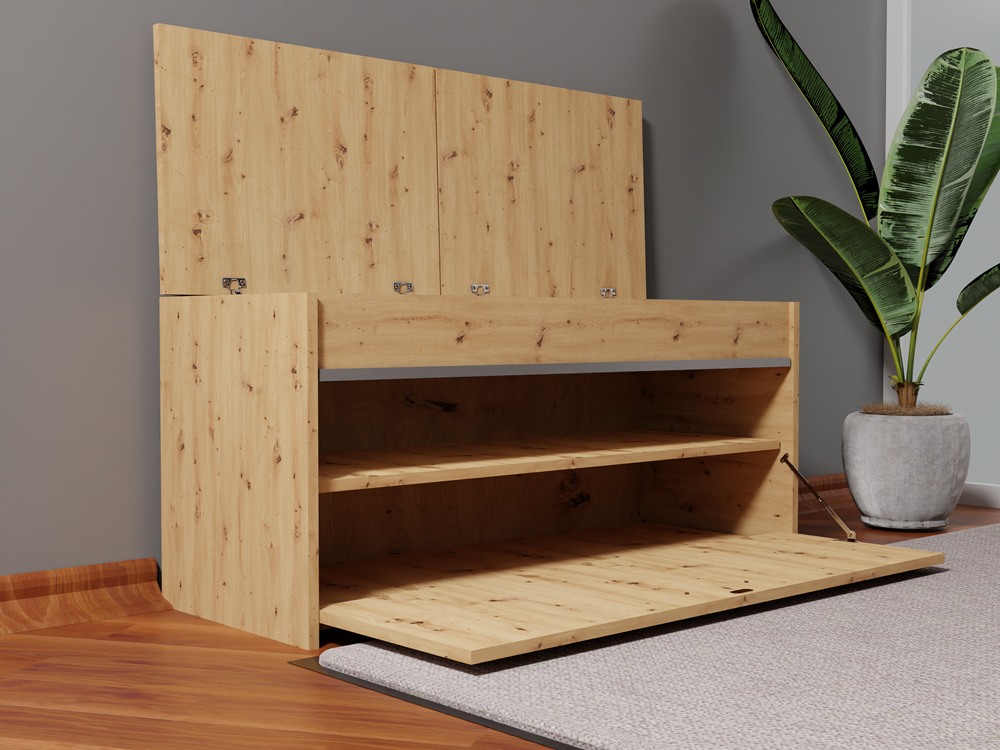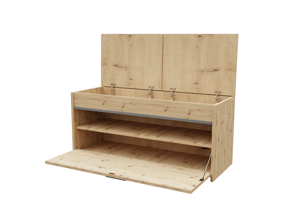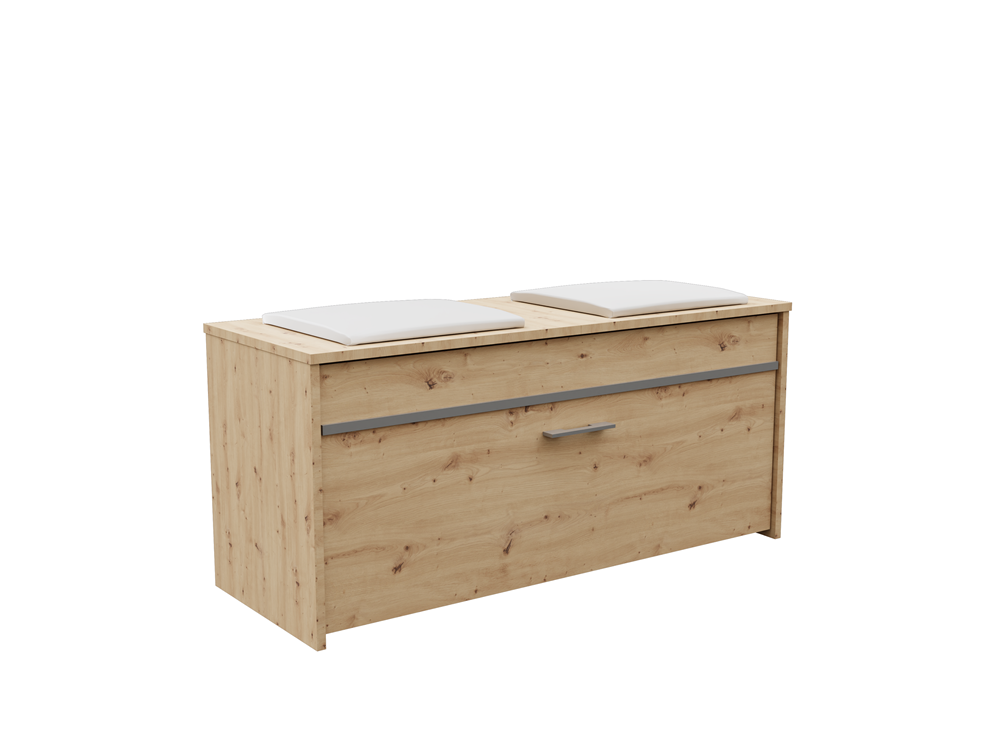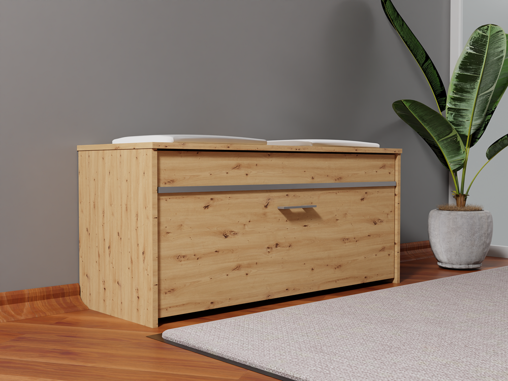 Batų spintelė su paminkštinta, eko oda dengta sėdimąja dalimi;Po sėdimąja dalimi - daiktadėžė smulkiems daiktams;Atverčiamų durelių viduje - 2 lentynos batams; Spintelė puošta dekoratyvine aliuminio juostele;Pagaminta iš: 18 mm storio medžio drožlių plokštės (MDP);Spintelės kraštai dengti PVC danga, pasižyminčia dideliu mechaniniu ir cheminiu atsparumu;Išmatavimai: plotis - 100 cm, gylis - 38 cm, aukštis - 46 cm;Spintelės spalva - ruda (artisan oak); sėdimosios dalies pagalvėlių - balta;