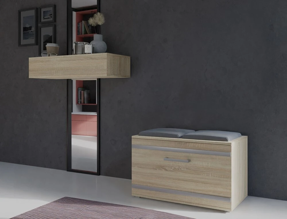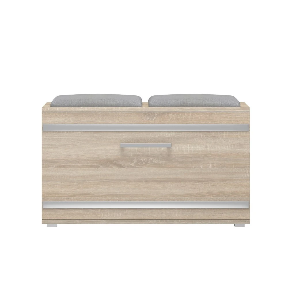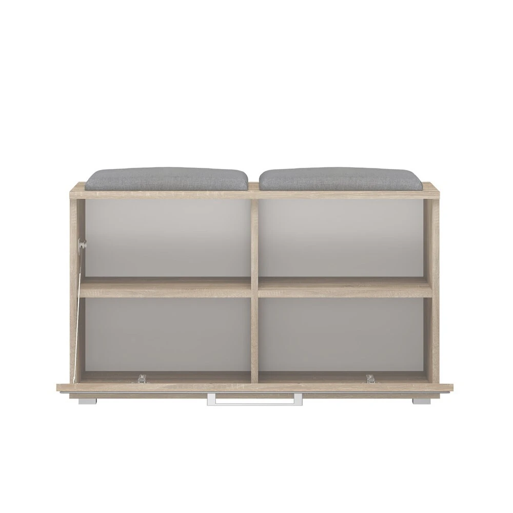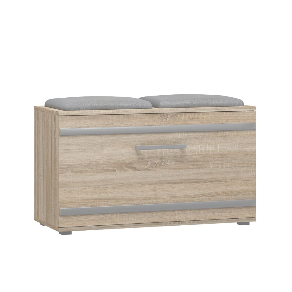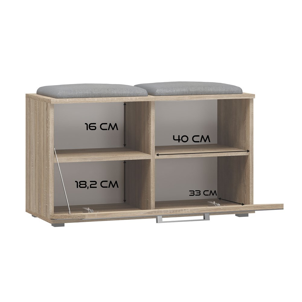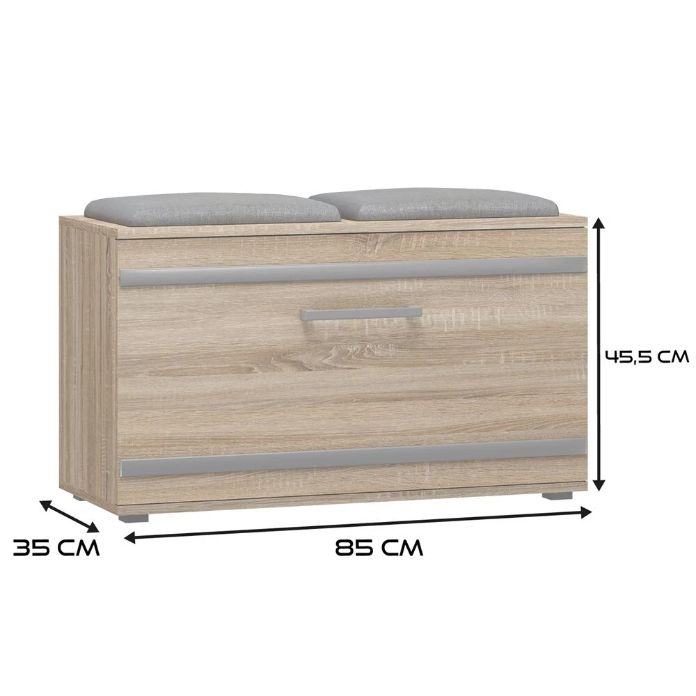 Batų spintelė su paminkštinta sėdimąja dalimi;Atverčiamų durelių viduje - 4 lentynos batams; Pagaminta iš: 16 mm storio medžio drožlių plokštės (MDP);Spintelės kraštai dengti ABS danga, pasižyminčia dideliu mechaniniu ir cheminiu atsparumu;Išmatavimai: plotis - 85 cm, gylis - 35 cm, aukštis - 45 cm;Spintelės spalva - ąžuolo (sonoma); sėdimosios dalies pagalvėlių - pilka;