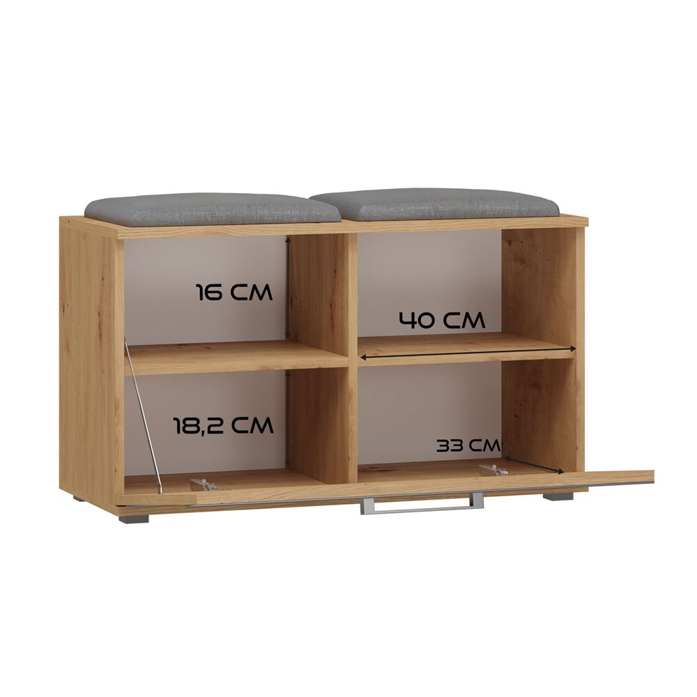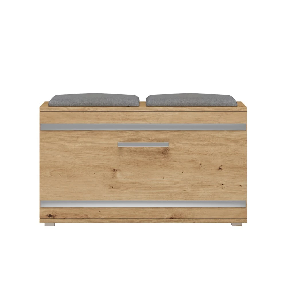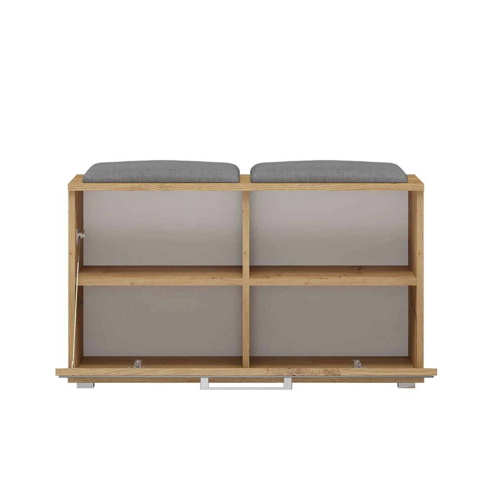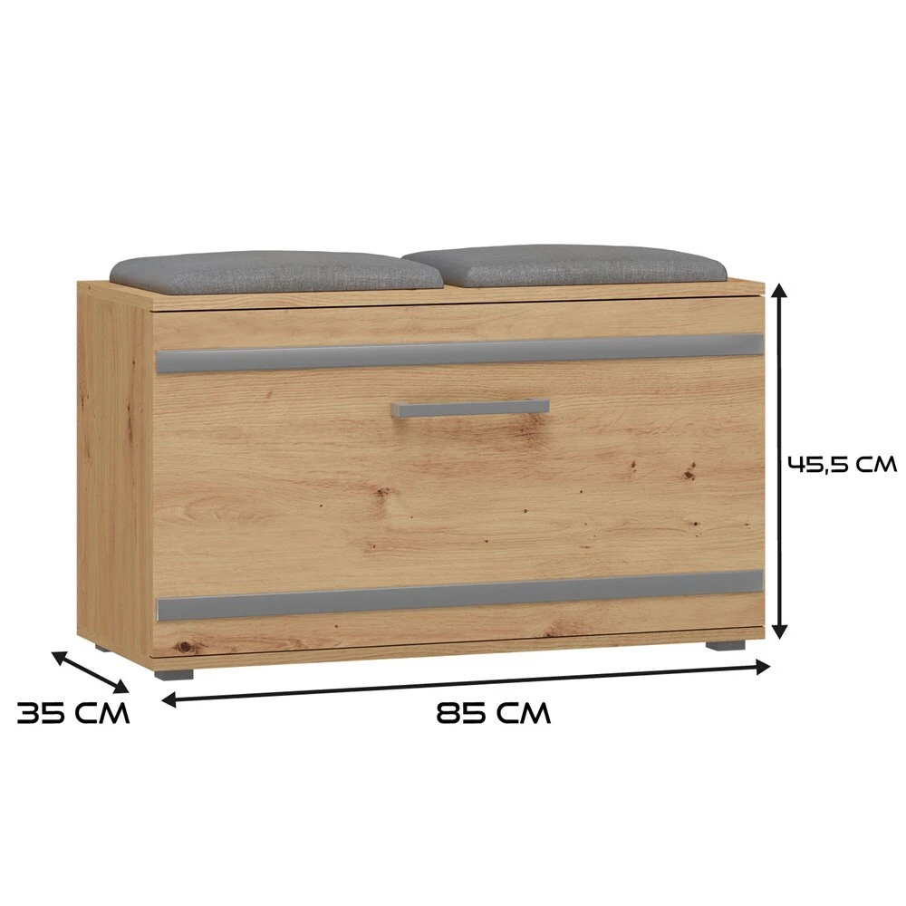 Batų spintelė su paminkštinta sėdimąja dalimi;Atverčiamų durelių viduje - 4 lentynos batams; Pagaminta iš: 16 mm storio medžio drožlių plokštės (MDP);Spintelės kraštai dengti ABS danga, pasižyminčia dideliu mechaniniu ir cheminiu atsparumu;Išmatavimai: plotis - 85 cm, gylis - 35 cm, aukštis - 45 cm;Spintelės spalva - ruda (artisan oak); sėdimosios dalies pagalvėlių - pilka;