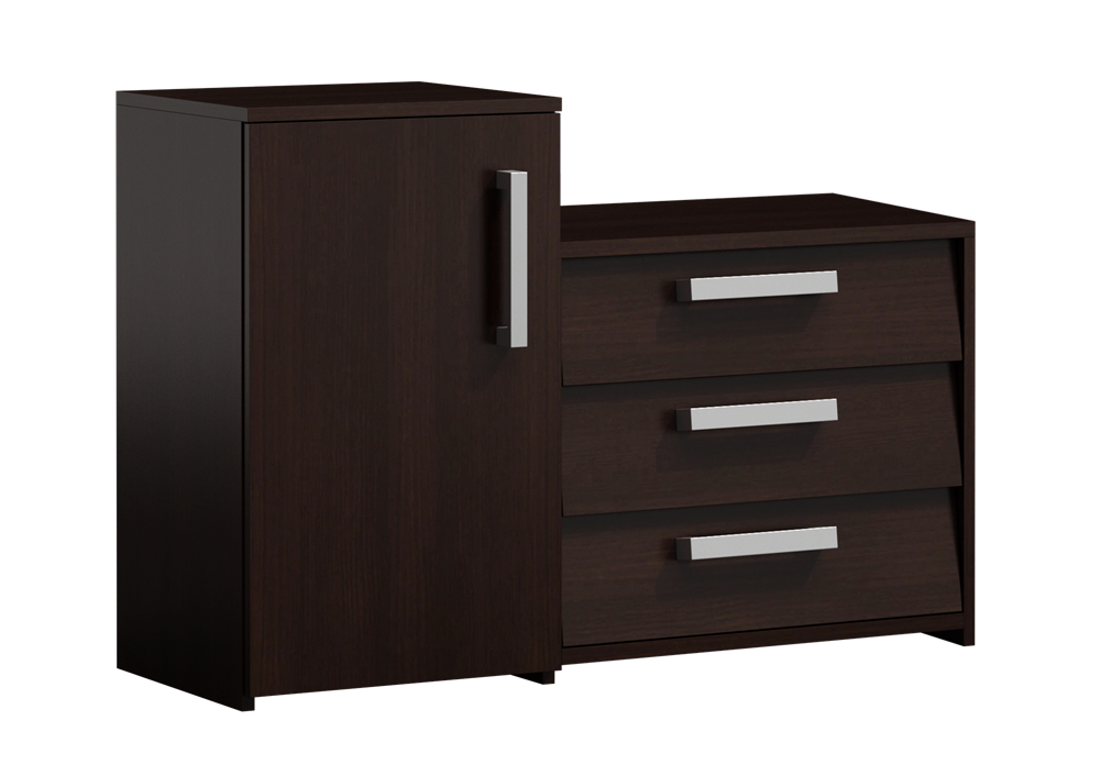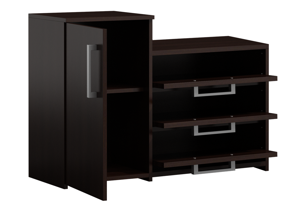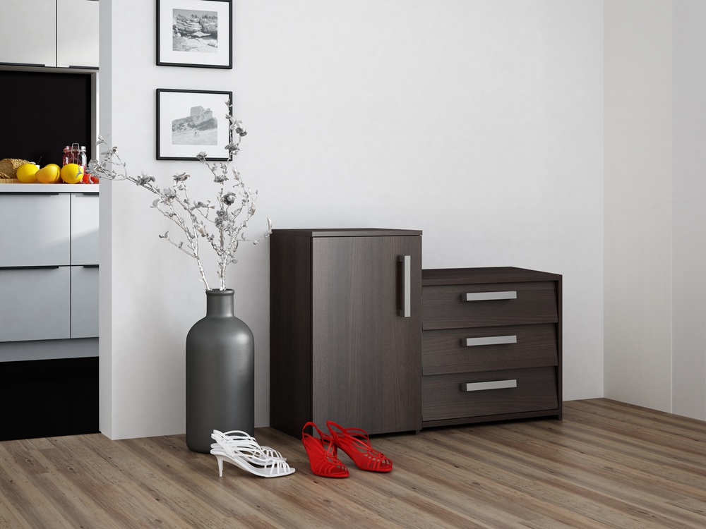 Batų spintelė su sėdimąja dalimi;1-ų varstomų durelių ir 3-jų skyrių batams;Varstomų durelių viduje - 1 lentyna ir 2 skyriai;Pagaminta iš 16 mm storio medžio drožlių plokštės (MDP);Spintelės kraštai dengti PVC danga, kuri pasižymi dideliu mechaniniu ir cheminiu atsparumu;Išmatavimai: plotis - 99 cm, gylis - 33 cm, aukštis - 68 cm;Spalva - tamsiai ruda (wenge);