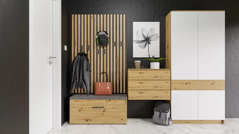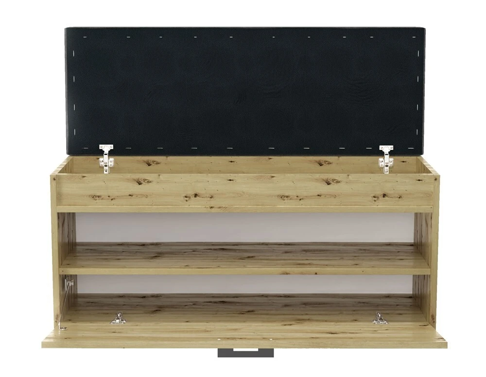pastatoma, 1-ų durelių batų spintelė - minkštasuolis su daiktadėže;spintelė pagaminta iš 16 mm storio laminuotos medžio drožlių plokštės su PVC kraštų apdaila;minkšta ir patogi sėdynė;spintelės išmatavimai: plotis - 100 cm, gylis - 35 cm, aukštis - 49 cm;vidinis išplanavimas pavaizduotas 3 nuotraukoje;spintelė spalva: ruda, sėdynė - pilka;įbrėžimams ir drėgmei atsparus paviršius;tvirta ir stabili konstrukcija;