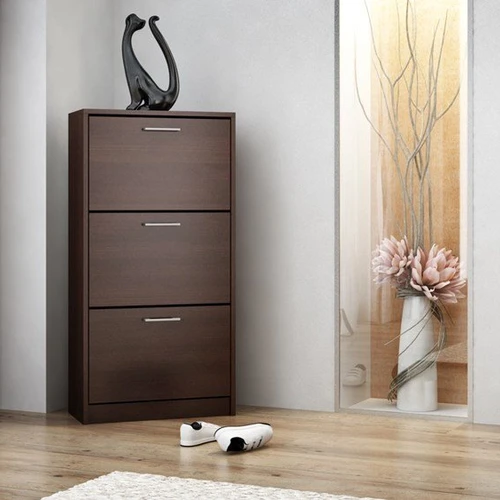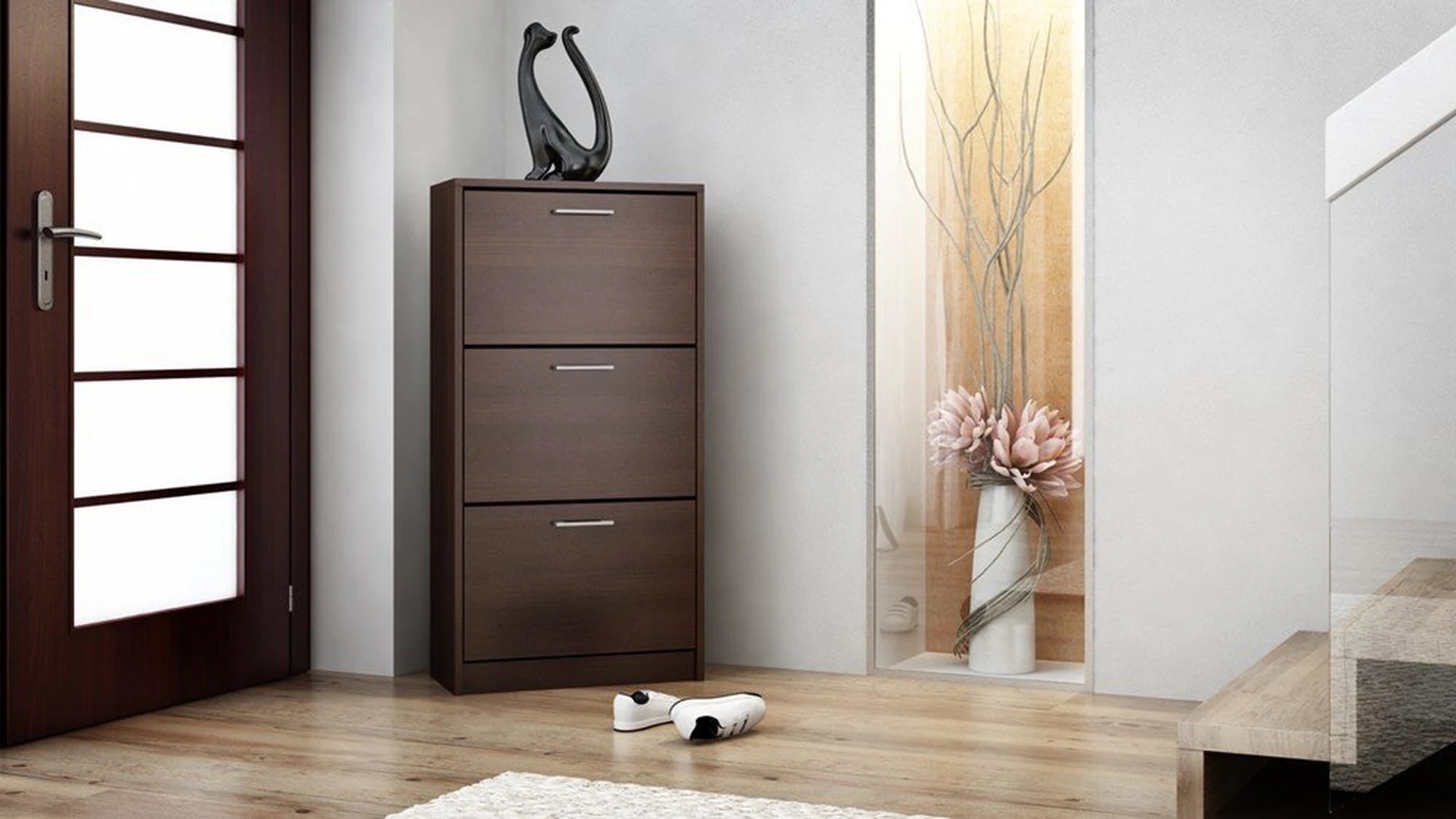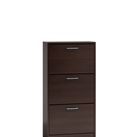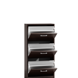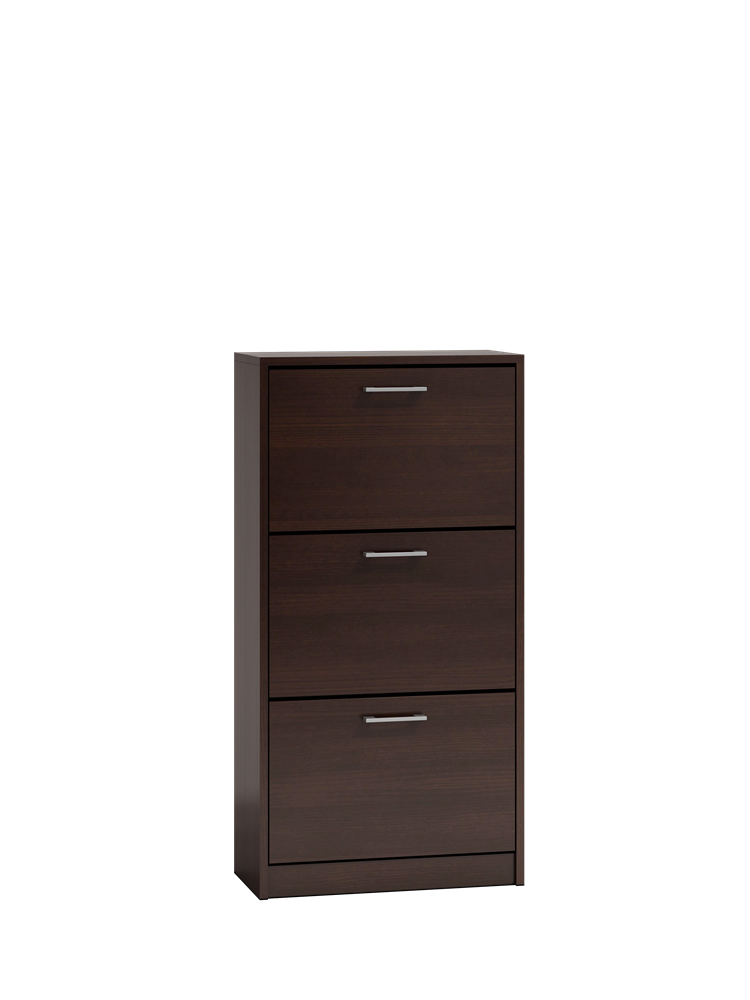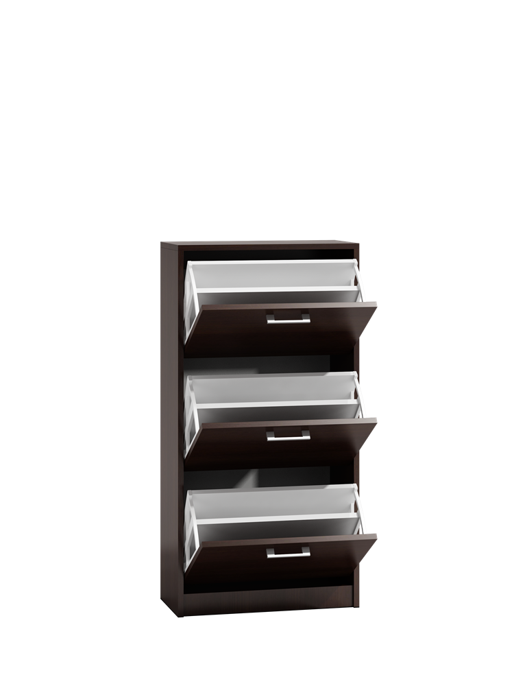 Trijų durelių spintelė batams sudėti;Durelės atsidaro žemyn;Korpusas ir fasadas pagaminti iš 16 mm storio laminuotos medžio drožlių plokštės (MDP);Spintelės kraštai dengti mechaminiam ir cheminiams pažeidimams atsparia PVC danga;Lengvai valomas, atsparus įbrėžimams paviršius;Spintelės išmatavimai: aukštis – 116 cm, plotis – 60 cm, gylis – 28 cm; Spintelės spalva: tamsiai ruda (wenge);Spintelės stalčiaus viduje: dviejų eilių plastikinis krepšys;