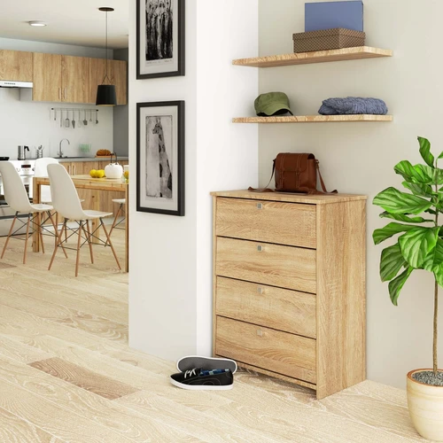 Aprašymas buvo automatiškai išverstas, gali pasitaikyti klaidų. Padauginusios batų krūvos – ypač svečių apsilankymų metu – kiekviename koridoriuje tikrai yra nepageidautinas vaizdas namiškiams. Norint lengvai sutvarkyti visus batus ir juos tvarkingai, planingai laikyti, puiki idėja bus mūsų pristatyta batų spintelė, pagaminta iš patvarios ir patvarios, įbrėžimams atsparios medžiagos. Keturiuose erdviuose stalčiuose nesunkiai telpa net per keliolika batų porų, nepriklausomai nuo jų dydžio ir avimo sezono. Solidus spintos apdirbimas koja kojon su patrauklia išvaizda bei puikia kaina, kurią turime pasiūlyti savo klientams. Baldai buvo kruopščiai pagaminti iš sonomos ąžuolo lentos. Ji nuolat populiari tarp praktiškus ir efektyvius sprendimus vertinančių žmonių. Pateiktas sprendimas puikiai tiks tradiciniu ir moderniu stiliumi dekoruotuose koridoriuose. Kviečiame sužinoti apie kitus šios serijos pasiūlymus. - Spintelė pagaminta iš trinčiai atsparios laminuotos plokštės - Durų fasadai iš laminuotos plokštės - Atverčiamos durys - Turi 4 lentynas varstomų durų viduje - Matomi kraštai padengti ABS apvadu, kad padidėtų atsparumas pažeidimams - Satino spalvos durų rankenos - Spintelė savarankiškam surinkimui - Instrukcija pridedama - Garantija 24 mėn. stiprus>
