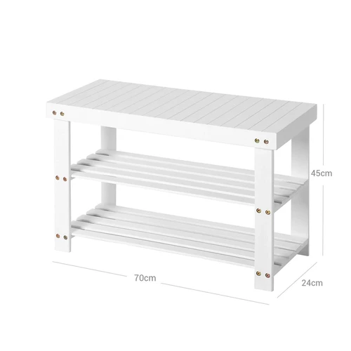 Aprašymas buvo automatiškai išverstas, gali pasitaikyti klaidų.Songmics bambukinė lentyna yra batų lentynos ir suoliuko derinys, tinkantis įvairiems tikslams. Stabili ir tvirta lentyna pagaminta iš aukštos kokybės bambuko. Bambukas yra greitai auganti žaliava, todėl aplinkai nekenksminga alternatyva. Tai geras pasirinkimas ekologiškiems žmonėms, turintiems elegancijos jausmą. Bambuko plokštės yra apdirbtos lygiai. Užapvalinti kraštai nepakenks jūsų drabužiams ir kūnui. Lyginant su kitais pasiūlymais, šios lentynos lentynos pagamintos iš ištisos bambukinės plokštės su grioveliais, kuri leidžia didesnę apkrovą, atrodo labai gražiai ir moderniai. Su šia gražia lentyna užtikrinate jaukų komfortą. Surinkimo patarimai: 1. Pirmiausia sumontuokite lentynos kojeles trumpais ir šešiabriauniais varžtais. 2. Įkiškite varžtus į skylutes ir įsukite ilgus varžtus iš lentynų kojelių išorės į vidų. Surinkdami palikite kojas su skylutėmis į išorę. 3. Surinkdami lentynas, pirmiausia siūlome lentynas tvirtinti įstrižai varžtais, tada bus lengviau montuoti likusiais varžtais. Pastabos: 1. Vonioje reikia laiku pašalinti vandenį, o batų lentyną laikyti sausą. 2. Lentyną reikia saugoti nuo lietaus ar intensyvių saulės spindulių.Išsami informacija apie gaminį: - Matmenys: 70 x 45 x 28 cm (P x A x G) - Medžiaga: bambukas - Spalva: balta - Pakuotės matmenys: 72 x 5 x 31 cm (P x A x G) - Individualus svoris: 4,26 kg Pristatymo komplektas: - 1 x batų lentyna - 1 x instrukcija - 1 x priedų rinkinys