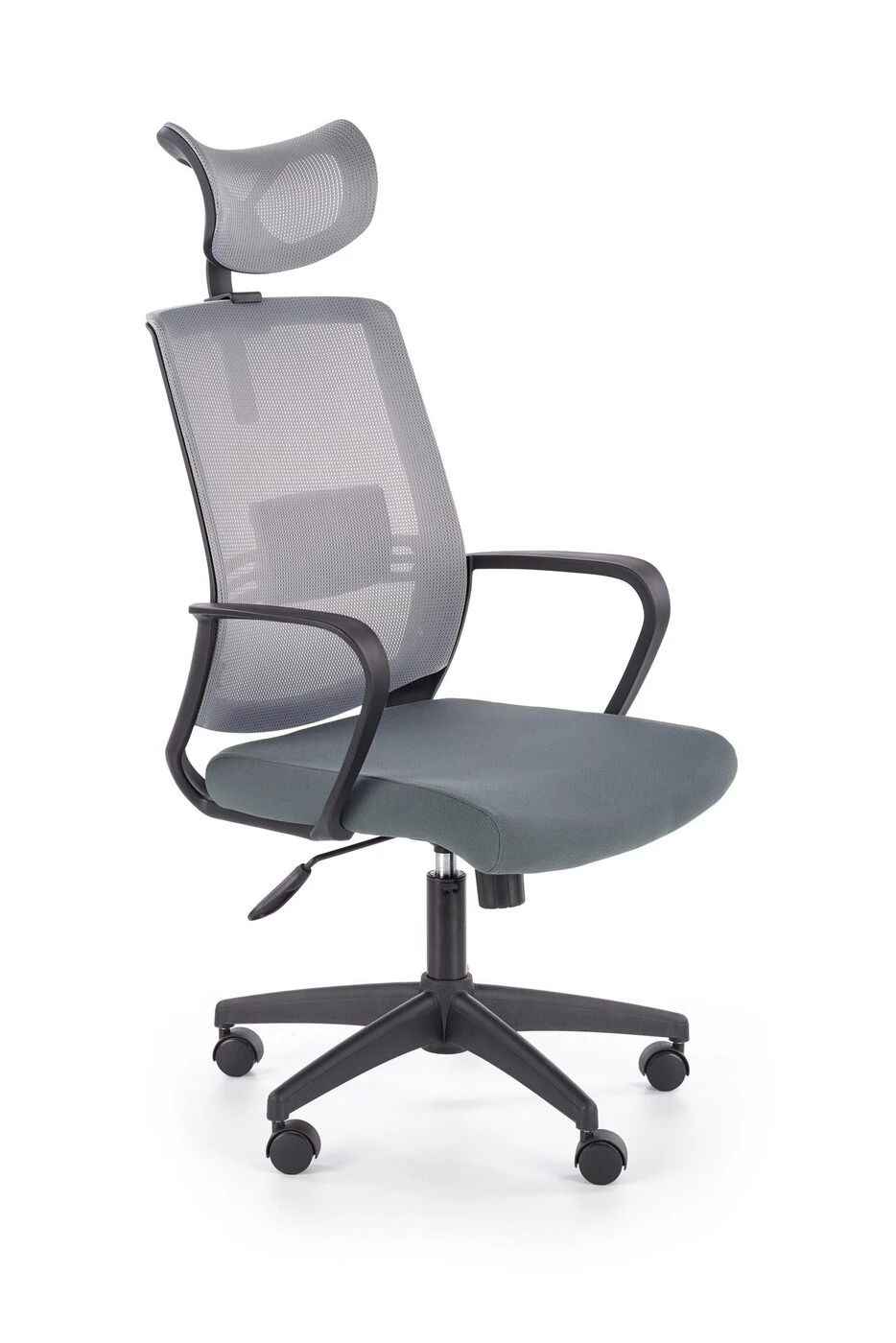 Pilka biuro kėdė su aukščio reguliavimo funkcija. Kėdės nugaros atlošas aptrauktas tinkleliu, sėdynė - audiniu. Sėdynė su elastingu poliuretano užpildu užtikrina patogų sedėjimą. Minkšti ratukai puikiai tinka važinėti kietomis grindimis ir jų nebraižo. Su porankiais ir galvos atrama.