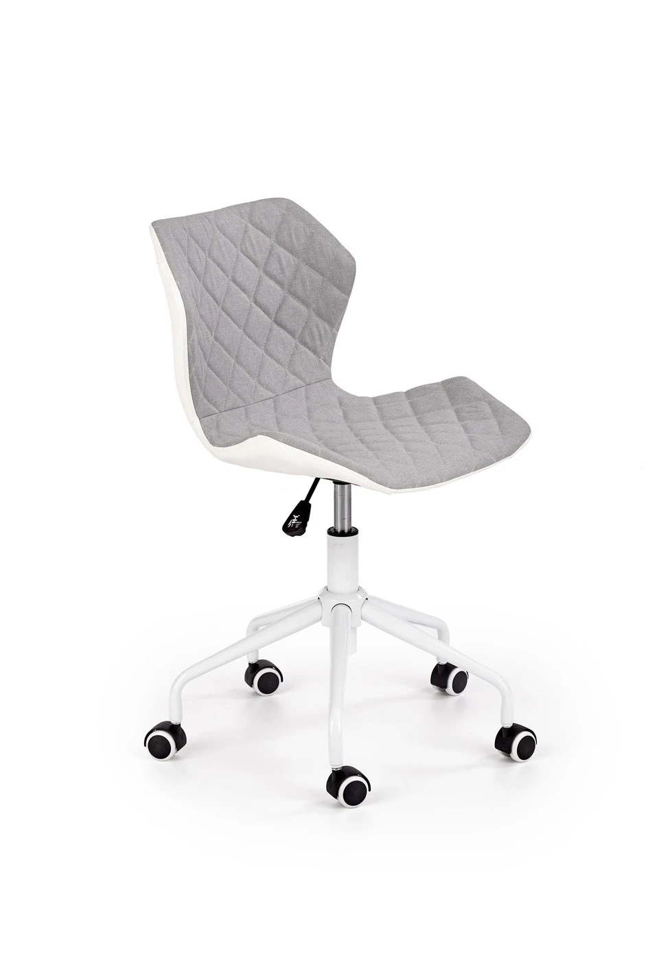 Kėdė su sėdynės auksčio reguliavimo funkcija. Nugaros atlošo galinė dalis aptraukta eko oda, o priekinė dalis ir sėdynė aptraukti audiniu su rombų formos siuvinėjimu. Su ratukais. Be porankių. Spalvų pasirinkimo galimybė: pilka, rožinė.