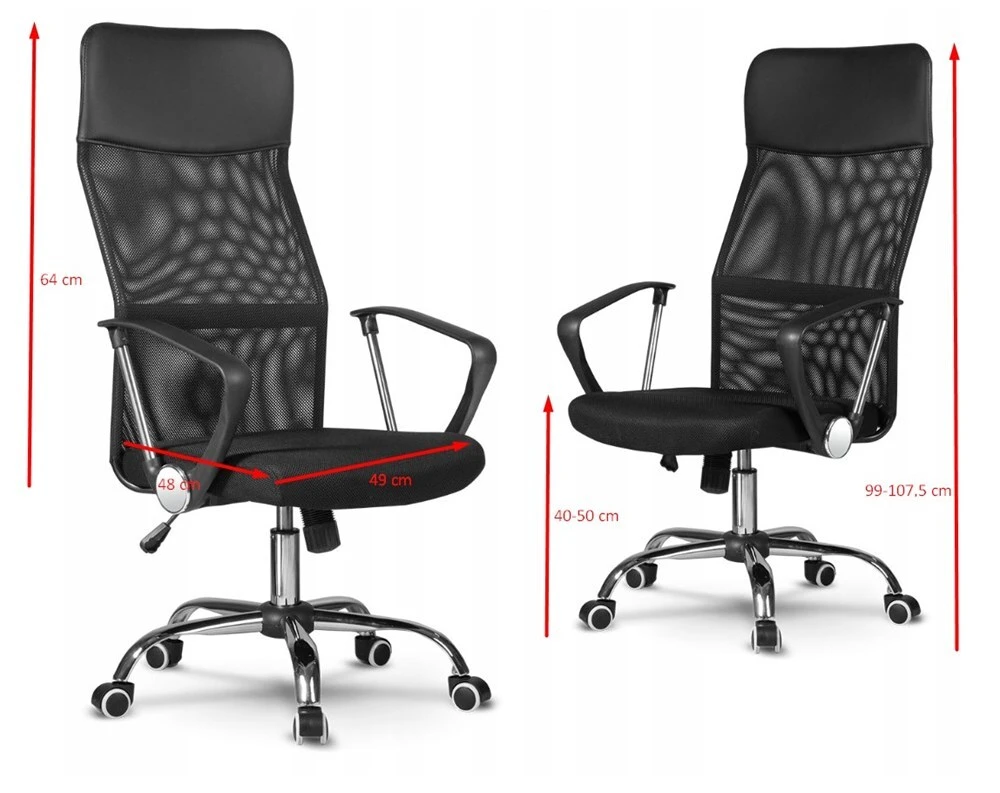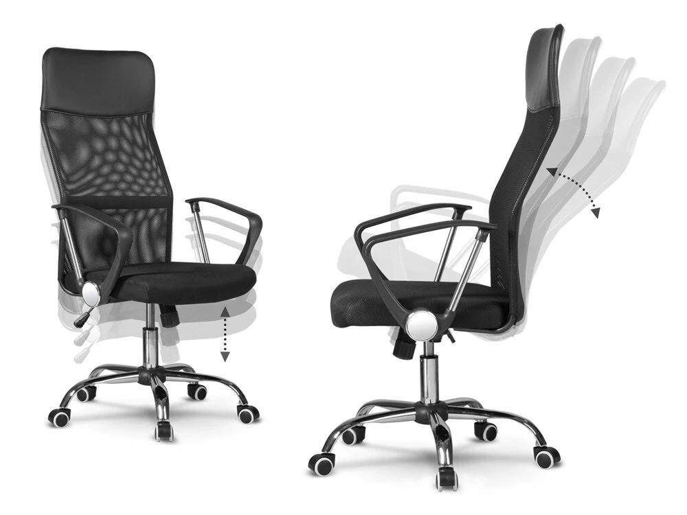 pagaminta iš tinklinio audinio;patogūs, 22 cm aukščio porankiai, chromuoti elementai;patvari konstrukcija leis ilgai džiaugtis kėde;kėdės išmatavimai: plotis (su porankiais) - 61 cm, sėdimosios dalies plotis - 48 cm; gylis - 50 cm, aukštis - 99 - 107,5 cm;atlošo aukštis - 75,5 cm; galimybė reguliuoti sėdimosios dalies aukštį (40 - 50 cm);galimybė pakreipti sėdynę atgal, užfiksuoti; pasipriešinimo reguliavimas;spalva - juoda;