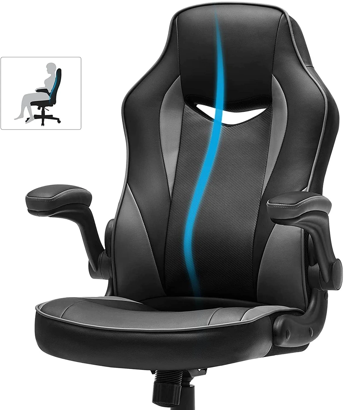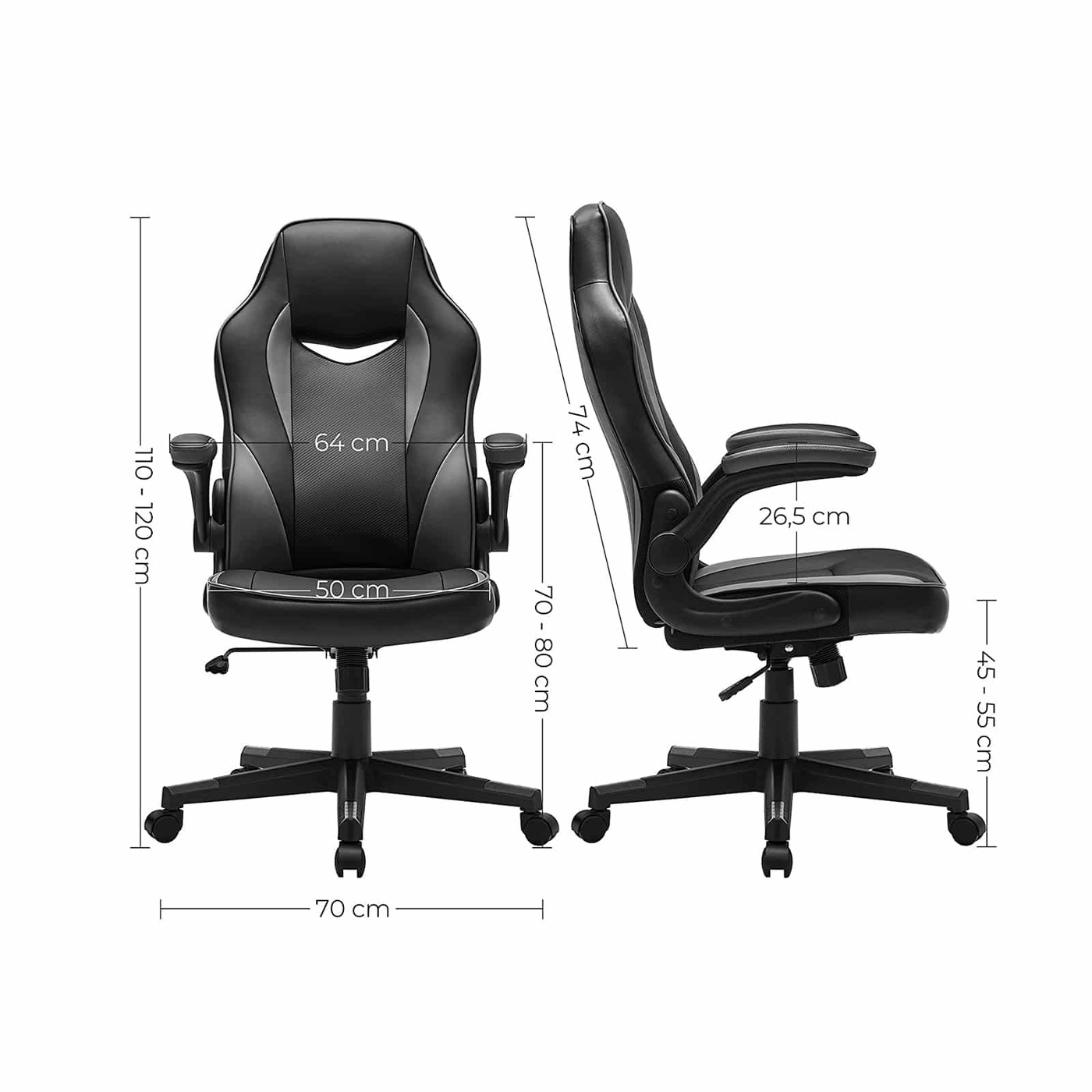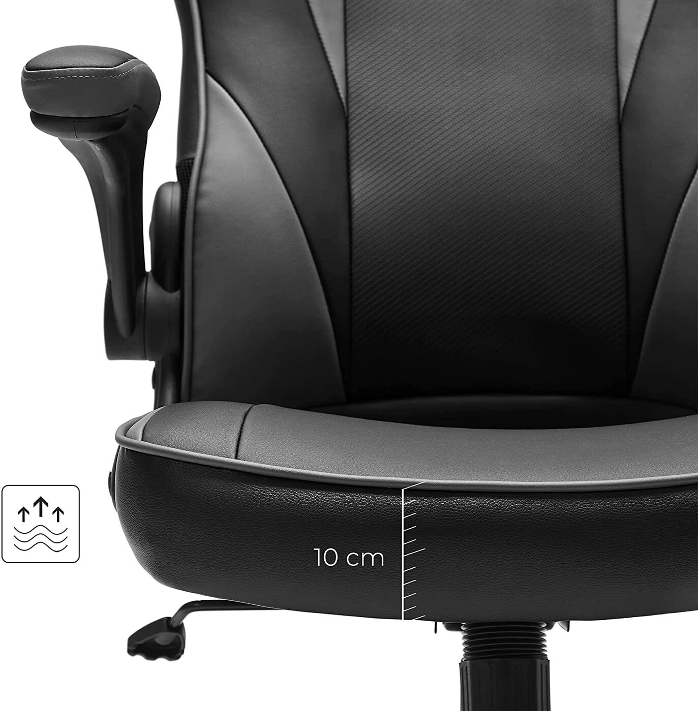 Aprašymas buvo automatiškai išverstas, gali pasitaikyti klaidų.Padidėjęs produktyvumas, pagerėjusi nuotaika: Prasta laikysena daro ir taip įtemptas darbo valandas dar labiau nepatogias. Raskite savo idealią laikyseną su šia biuro kėde: jūsų kūnas atsipalaiduos, jūsų protas bus produktyvesnis, o 8 darbo valandos praskris. Šios stalo kėdės privalumai: Reguliuokite kėdės aukštį, kad rastumėte idealią sėdėjimo padėtį, atitinkančią ekrano aukštis Ergonomiška atlošo forma reiškia, kad visada galite dirbti atsipalaidavę ir tiesia nugara.Paleiskite rankas ant patogių porankių, aptrauktų PU sintetine oda.Dėl aukšto atlošo atpalaiduokite kaklą ir pečius. Dėl siūbavimo funkcijos ir patogiai paminkštintos sėdynės galite patogiai atsipalaiduoti keletą minučių, o tada grįžti į darbą!Produkto detalės: Spalva: juodai pilka Medžiaga: faneros rėmas, putplasčio užpildas, PU sintetinės odos paviršius Bendras kėdės dydis: 75 x 64 x (110-120) cm (P x P x A) Svoris: 14,6 kg Maks. Statinė apkrova: 150 kg Pristatymo komplektas: 1 x biuro kėdė 1 x priedų paketas 1 x instrukcija SONGMICS Pastabos: ""Sūpynės funkcija"" reiškia, kad atlošas ir sėdynė vienu metu pasislenka atgal. Šios kėdės atlošo negalima atskirai palenkti atgal.