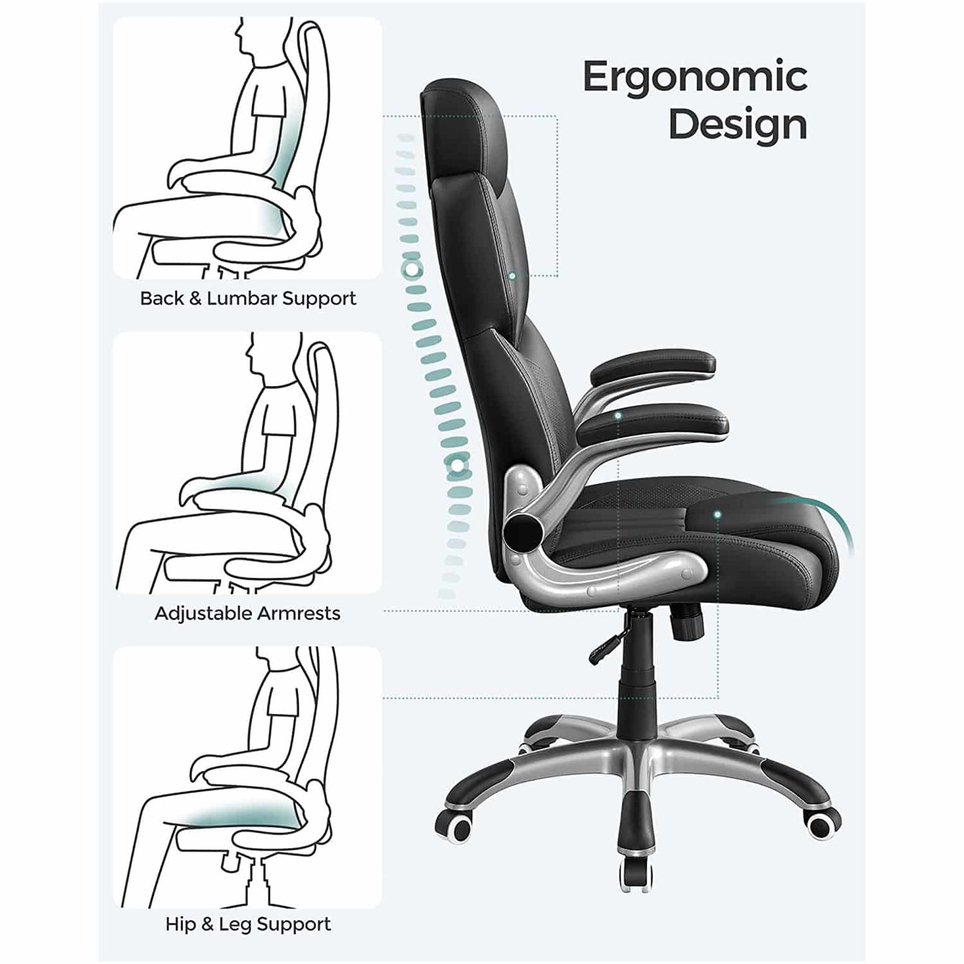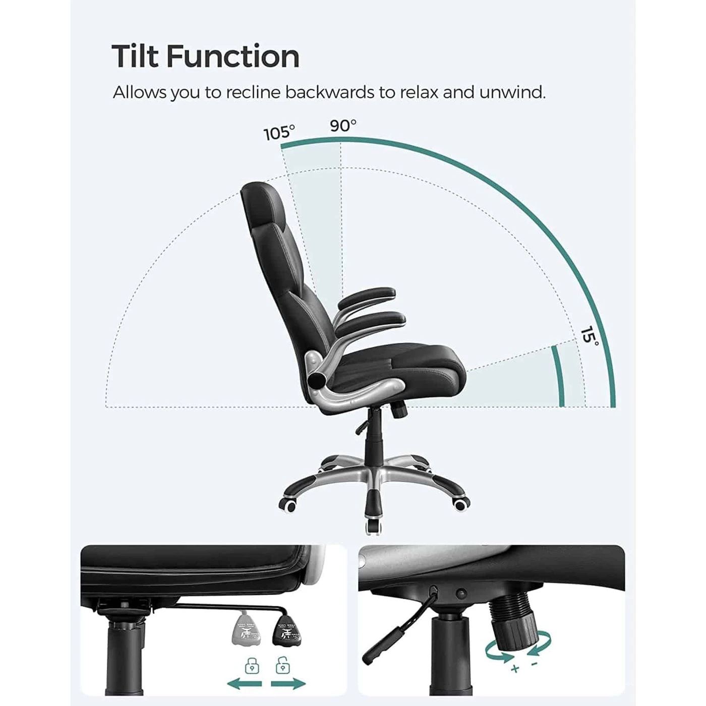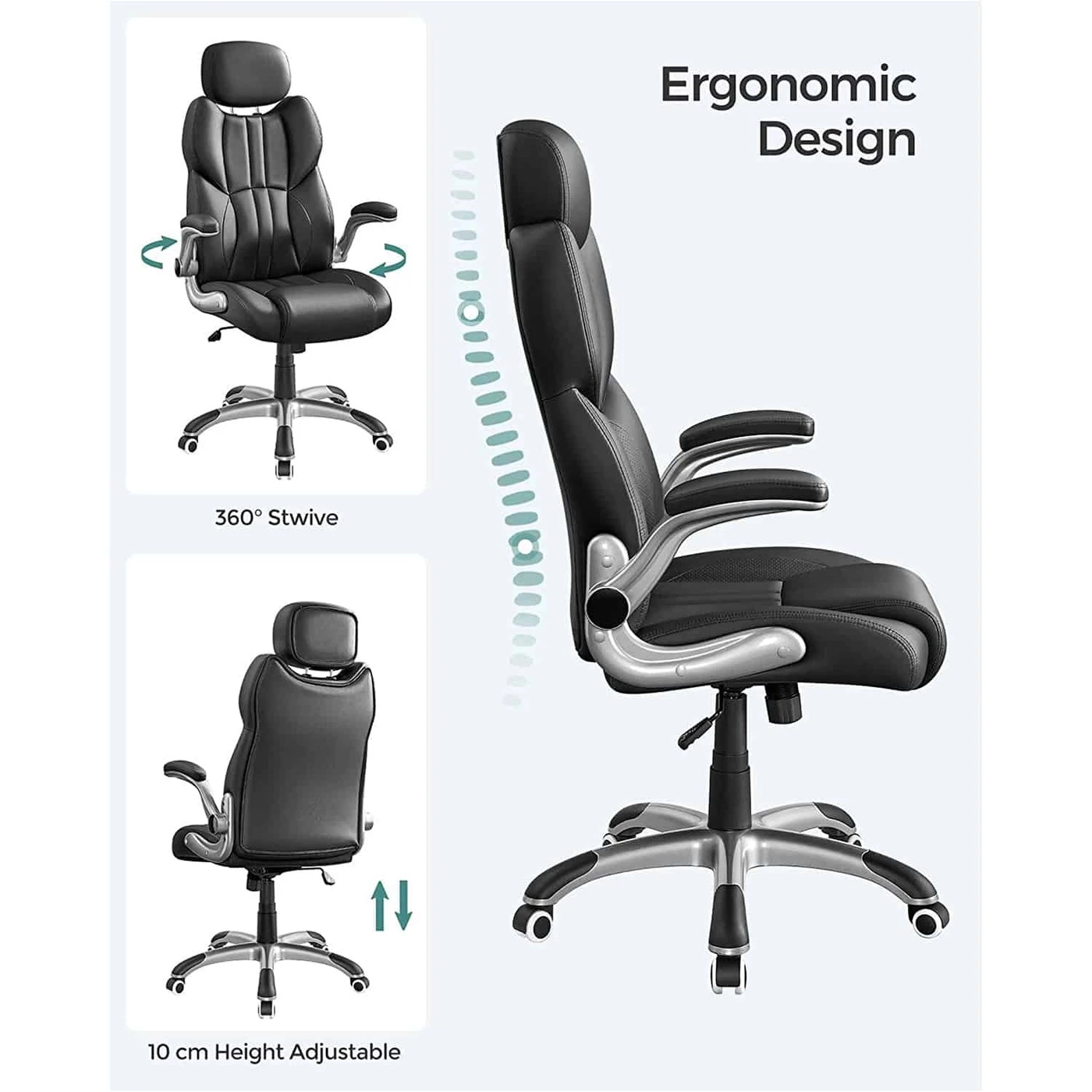 Aprašymas buvo automatiškai išverstas, gali pasitaikyti klaidų.Patogesnis komfortas, padidintas produktyvumas: dėl nepatogios kėdės sukeltas nugaros skausmas trikdo ne tik darbą, bet ir visas kitas sritis. Ši ergonomiška SONGMICS kėdė suteikia jums aukštą komforto lygį, kad galėtumėte susikoncentruoti į tai, kas svarbu. Kaip galite padidinti savo produktyvumą su šia pasukama kėde? Stilingas juodos spalvos ir lygaus PU užvalkalo derinys suteikia naujų energijos. Reguliuokite aukštį sėdynės ir galvos atramos (reguliuojamos 3 padėtyse), kad rastumėte idealią sėdėjimo padėtį jūsų ekrano aukščiui. Pakreipkite kėdę atgal iki 20°. Ši funkcija leidžia keletą minučių patogiai atsipalaiduoti ir grįžti į darbą. Pagaliau atliktas darbas! Sulenkite šios biuro kėdės porankius ir pastumkite kėdę po stalu, kad sutaupytumėte vietosInformacija apie gaminį: Spalva: Juoda Medžiaga: Fanera, putplastis, PU, nailoniniai ratai Bendras dydis: 70 x 72 x (119-129) cm (P x P x A) Sėdynės aukštis: 52-61 cm Sėdynės matmenys: 51 x 52 cm (I x P) Atlošo matmenys (su galvos atrama): 51 x 91 cm (I x A) Porankių aukštis (nuo sėdynės): 24 cm Porankių aukštis (nuo grindų): 71-81 cm Svoris: 17,5 kg Maks. statinė apkrova: 150 kg Pristatymo komplektas: 1 x biuro kėdė 1 x priedų paketas 1 x instrukcija SONGMIKAS Pastabos: Jei kėdę norite naudoti ant medinių grindų, naudokite pagalvėlę. Naudojant svirties funkciją, kėdės sėdynė ir atlošas tuo pačiu metu pakreiptas atgal; atlošo negalima palenkti atskirai.