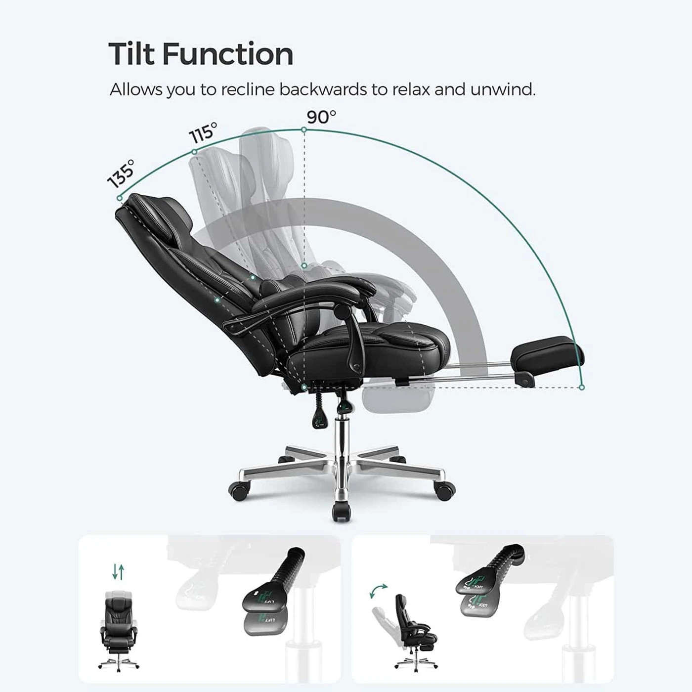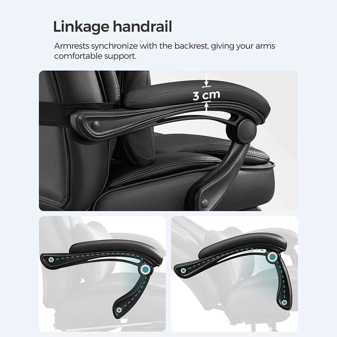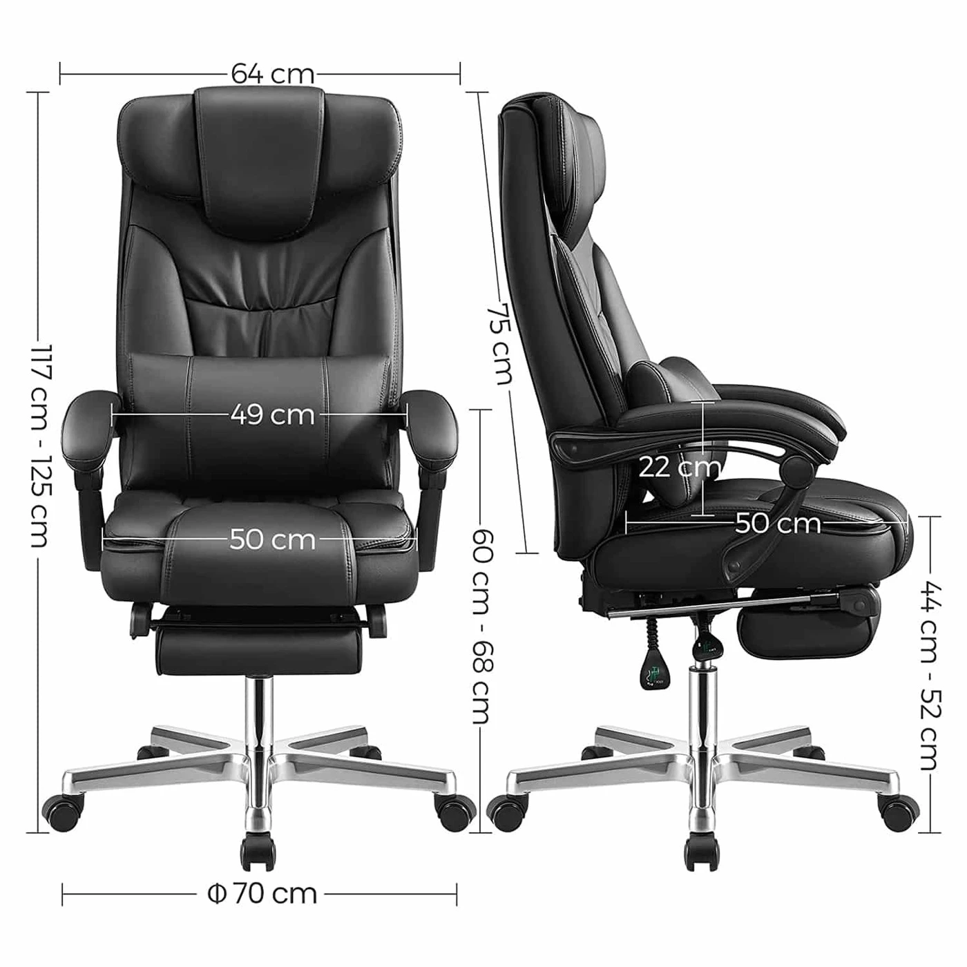 Aprašymas buvo automatiškai išverstas, gali pasitaikyti klaidų.Sulankstoma galvos atrama yra nepriklausomai sukurta Songmics.- Songmics sulankstoma galvos atrama, reguliuojama nuo 0° iki 90°, gali gerai paremti galvą gulint. Sėdėdami išskleiskite galvos atramą, tada ji tarsi suaugo kartu su atlošu, sukurdama kilnią atmosferą Dvigubai pastorinti apmušalai užtikrina malonų pojūtį, gerą kūno atramą ir puikų sėdėjimo komfortą.Produkto detalės: Medžiaga: - viršelis: PU - apmušalai: didelio tankio putplastis - pagrindas: aliuminis. - Porankio velenas: Nailonas - Rankų pagalvė: PU - Ratai: Nailono šerdis su PU danga Matmenys: - Aukštis (bendras): 118-125 cm - Plotis cm (iš viso): 70 cm - Gylis (iš viso): 70 cm - Sėdynės aukštis : 45-52 cm - sėdynės Plotis cm (naudotinas): 50 cm - sėdynės gylis (naudoti): 50 cm - porankio aukštis (nuo sėdynės): 22 cm - atlošo aukštis: 75 cm - Ø pagrindas: 70 cm - Ø ratukai: 50 mm - Ø Smeigtukas: 11 mm - Spalva: juoda - Grynasis svoris: 24 kg - Bendras svoris: 26,7 kg - Maksimali keliamoji galia: 150 kg Pristatymo komplektas: - 1 x biuro kėdė - 1 x tinkamas krepšys - 1 x rankinis (DE, EN, FR, IT, ES) Pastabos: - Taip pat galite atskirai iš mūsų užsisakyti pakaitinius volelius.