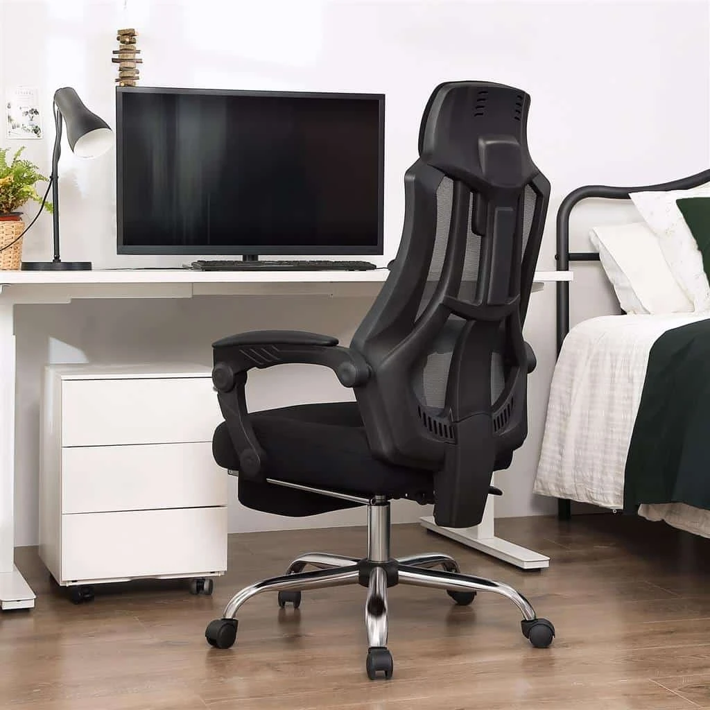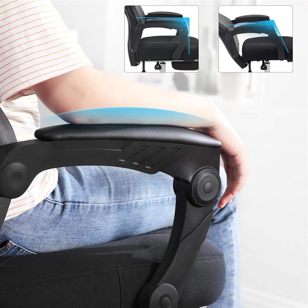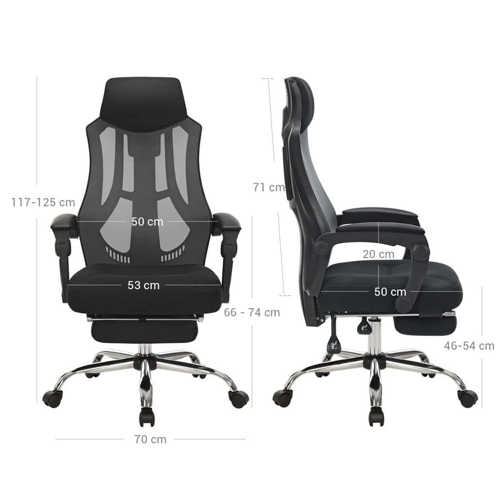 Aprašymas buvo automatiškai išverstas, gali pasitaikyti klaidų.Padidėjęs produktyvumas, pagerėjusi nuotaika: Prasta laikysena daro ir taip įtemptas darbo valandas dar labiau nepatogias. Raskite savo idealią laikyseną su šia biuro kėde: jūsų kūnas atsipalaiduos, jūsų protas bus produktyvesnis, o 8 darbo valandos praskris. Šios stalo kėdės privalumai: Reguliuokite kėdės aukštį, kad rastumėte idealią sėdėjimo padėtį, atitinkančią ekrano aukštis Dėl ergonomiškos atlošo formos visada galite dirbti tiesia nugara.Atpalaiduokite rankas ant patogių porankių, padengtų PU.Atpalaiduokite kaklą ir pečius dėl aukšto atlošo ir galvos atramos.Dėka pakreipimo funkcijos ir ištraukiama paminkštinta pėdų atrama, galite patogiai keletą minučių atsipalaiduoti ir grįžti į darbą!Informacija apie gaminį: Spalva: juoda-tamsiai pilka Medžiaga: plienas, putplasčio paminkštinimas, audinio paviršius, nailoniniai ratai Bendras kėdės dydis: 65 x 70 x (117-125) cm (P x P x A) Sėdynės aukštis (nuo grindų): 46-54 cm Sėdynės matmenys : 53 x 50 cm (I x P) Atlošo matmenys: 50 x 71 cm (I x A) Porankių aukštis (nuo sėdynės): 20 cm Svoris: 18,5 kg Maks. Statinė apkrova: 120 kg Pristatymo apimtis: 1 x biuro kėdė su tinkleliu dangteliu 1 x priedų pakuotė 1 x instrukcijos (DE,EN,IT, FR,ES) SONGMICS Pastabos: Nelaikykite gaminio ilgą laiką tiesioginiuose saulės spinduliuose .Saugokite gaminį nuo smailių ir aštrių daiktų, kad nepažeistumėte paviršiaus.