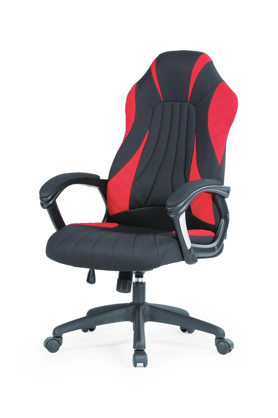 Juodai raudona kėdė su sėdynės auksčio reguliavimo funkcija. Nugaros atlošas ir sėdynė aptraukti audiniu. Sėdynė su elastingu poliuretano užpildu užtikrina patogų sėdėjimą. Minkšti ratukai puikiai tinka važinėti kietomis grindimis ir jų nebraižo. Su porankiais.
