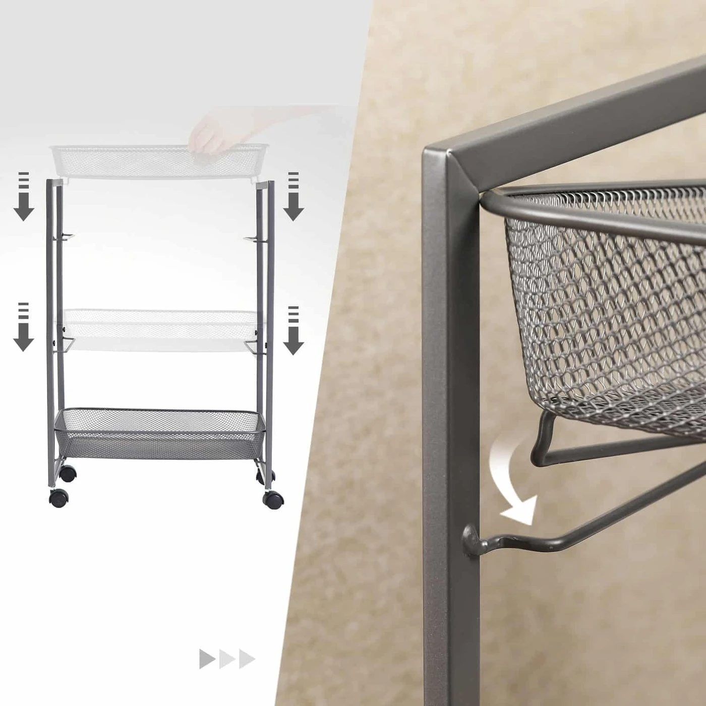 Aprašymas buvo automatiškai išverstas, gali pasitaikyti klaidų.Puikiai tiks prie vonios: pripildykite šią patogią vonios lentyną šampūnu, dušo želė, rankšluosčiais ir kempinėle, susukite ją prie vonios ir šokite į karštą vonią su burbuliukais! Patogu šalia prekystalio: padėkite prieskonių, dubenį susmulkintos mėsos. svogūnai, imbieras , lėkštė vištienos krūtinėlės filė ir kiti ingredientai ant šios virtuvės lentynos, pastumkite ją prie pat prekystalio ir paruoškite garsųjį vištienos karį! Naudinga šalia jūsų stalo: padėkite mažas dėžutes su biuro reikmenimis, segtuvu ir skylutėmis. ant šio lankstaus vežimėlio ir pastumkite jį šalia savo stalo. Tai suteikia jums greitą prieigą prie svarbių darbo priedų neapkraunant stalo.Išsami informacija apie gaminį: Spalva: Pilka Medžiaga: Plienas Dydis: 42 x 26 x 62,3 cm (I x P x A) Tinklelio krepšelio dydis: 41,2 x 27 cm (P x P) Svoris: 3 kg Maks. Statinė apkrova vienam lygiui: 5 kg Pristatymo apimtis: 1 x mobili lentyna 1 x priedų pakuotė 1 x instrukcijos (DE, EN, FR, IT, ES)