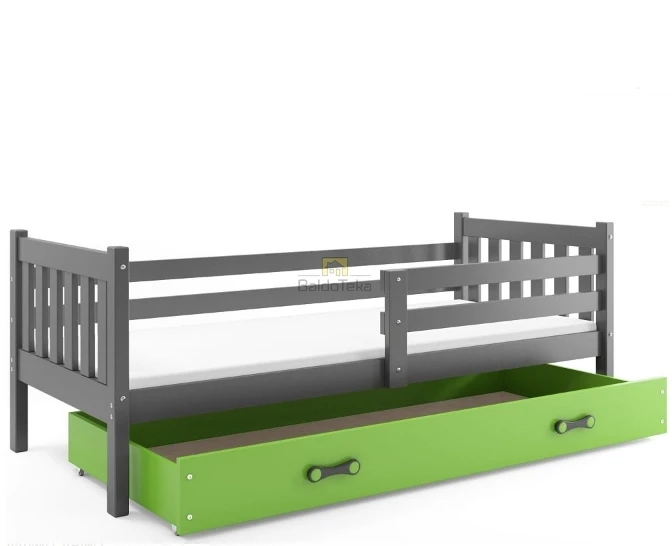 Su 190 x 80 cm čiužiniu, patalynės dėže ir apsaugine tvorele.