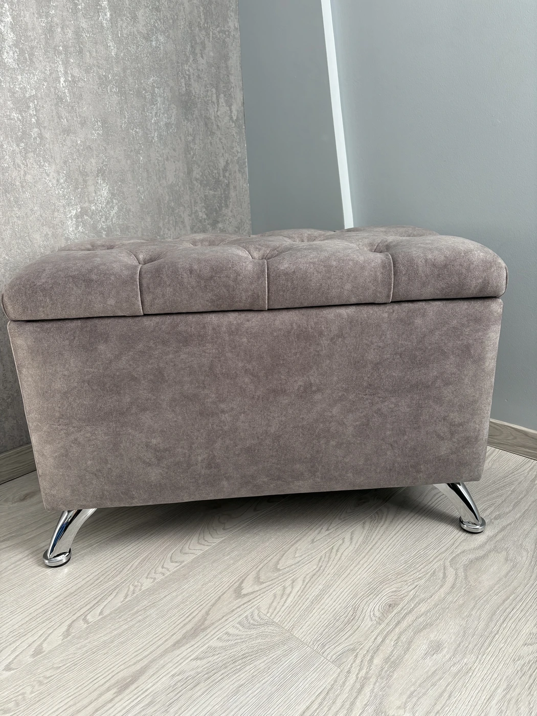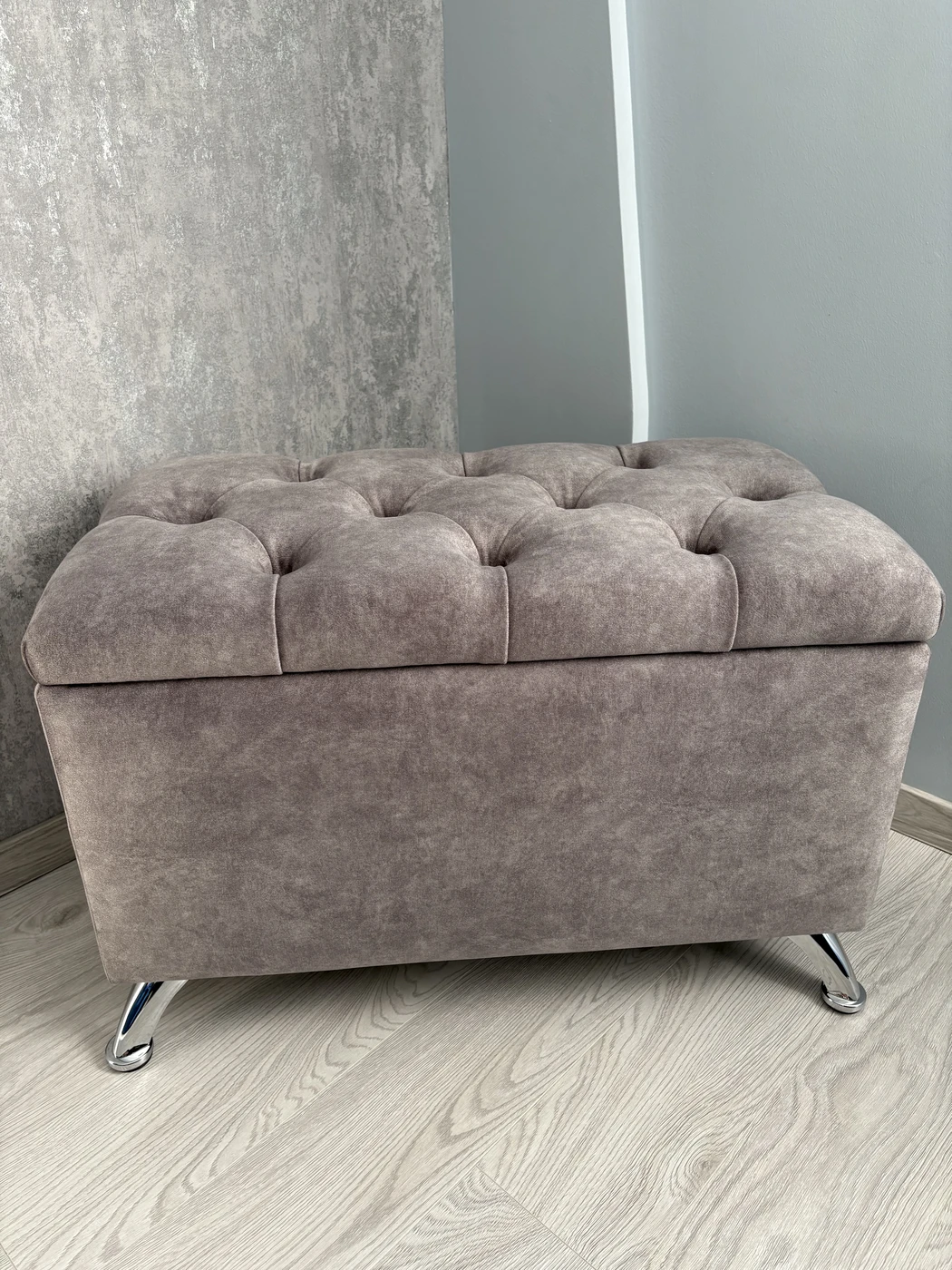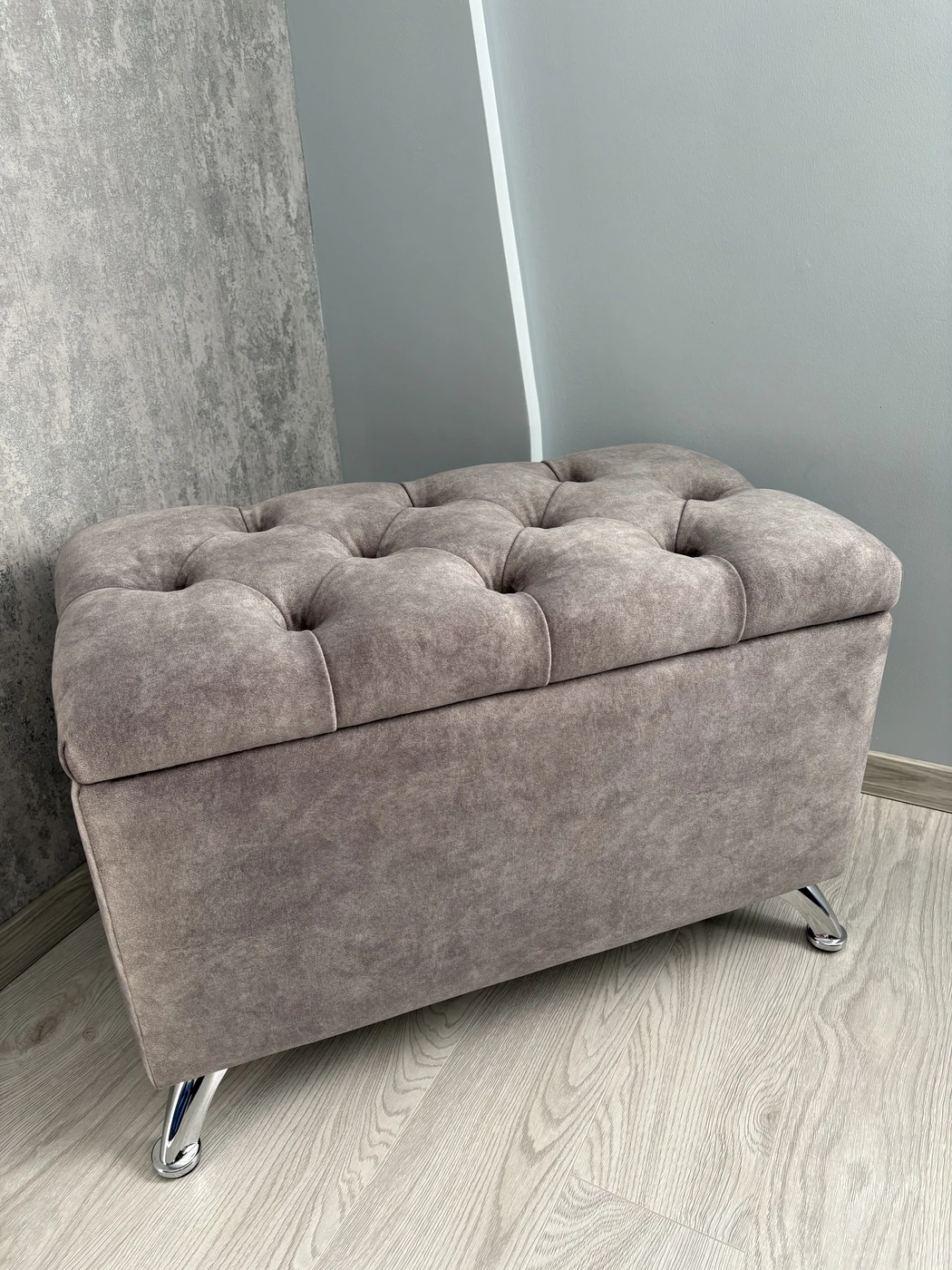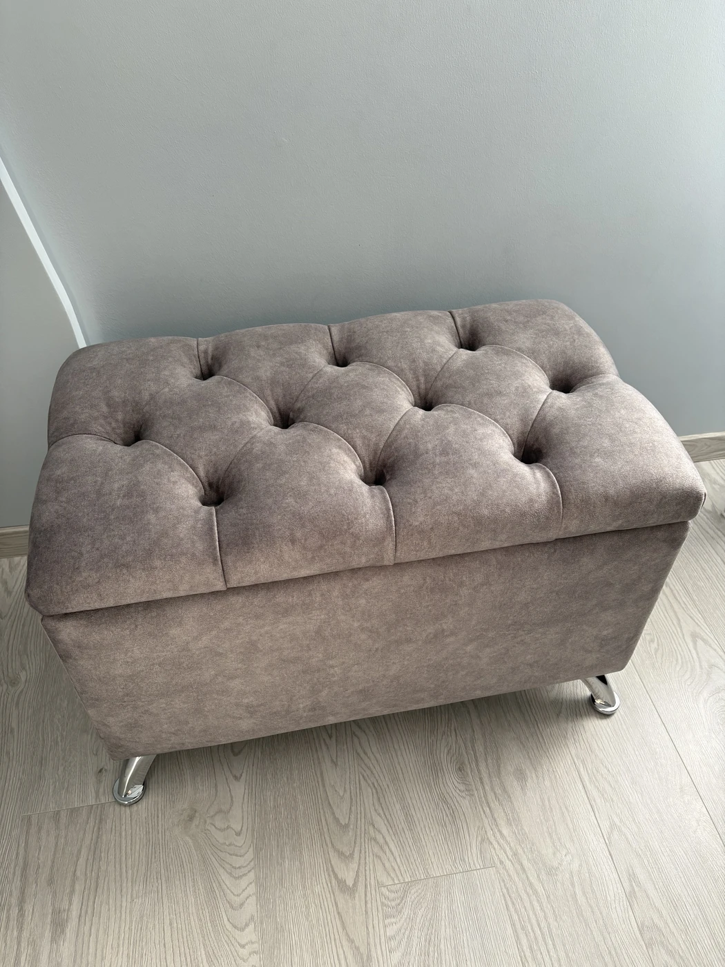 Naujas pufas Cesterfield su daiktadėže. Plotis 44 cm. Ilgis 75 cm. Aukštis 50 cm. Daiktadežės vidaus matmenys Plotis 38 Ilgis 69 Aukštis 30