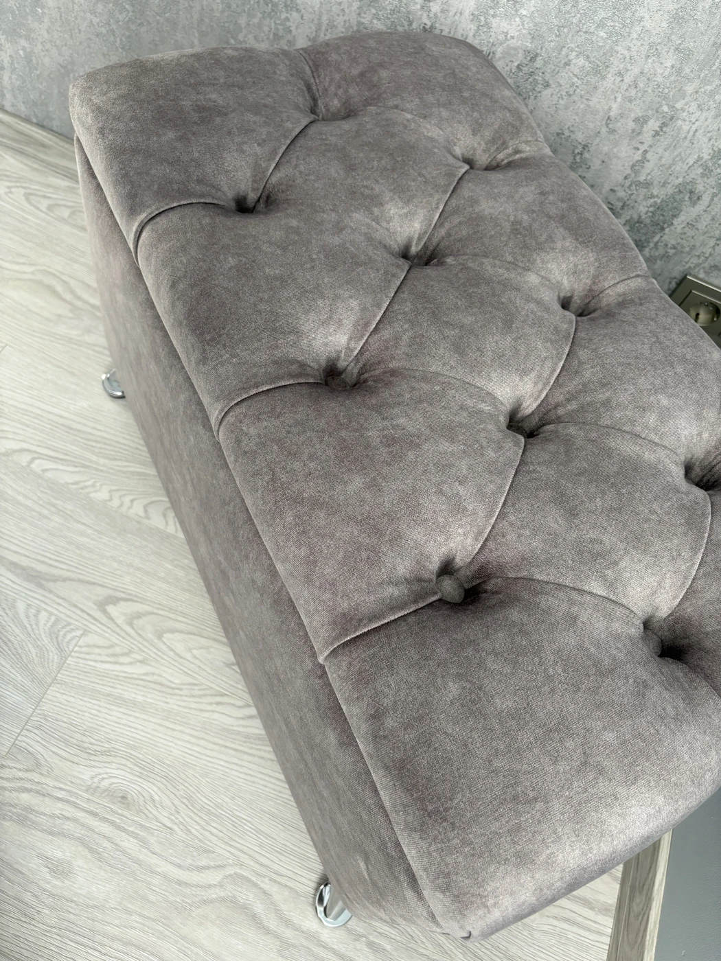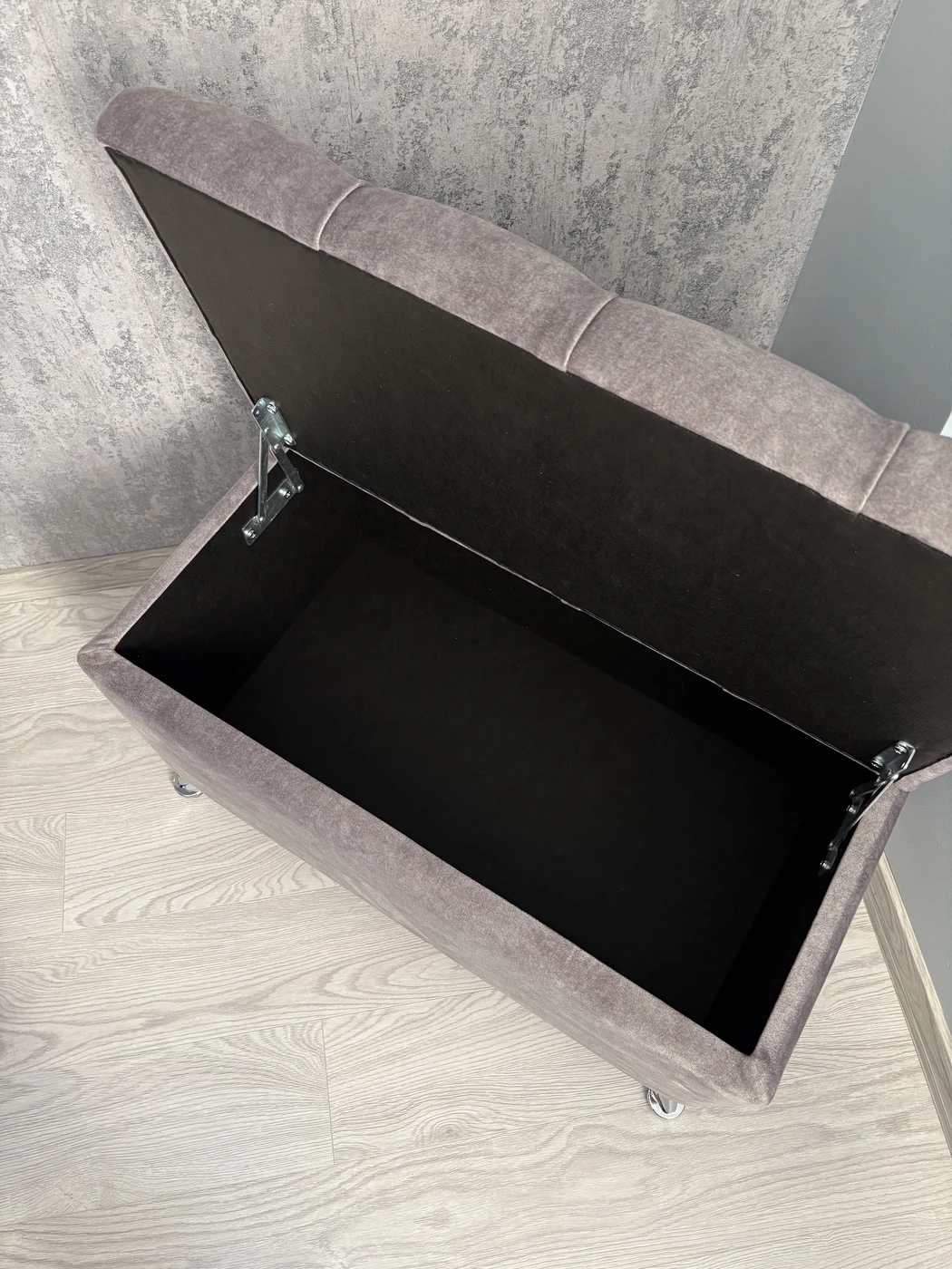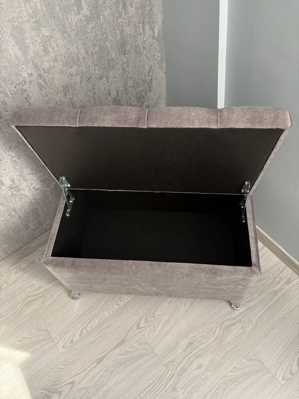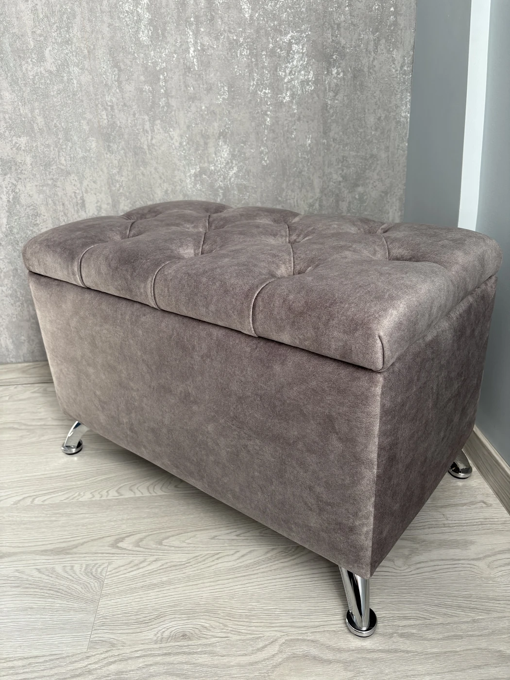 Naujas pufas Cesterfield su daiktadėže. Plotis 44 cm. Ilgis 75 cm. Aukštis 50 cm. Daiktadežės vidaus matmenys Plotis 38 Ilgis 69 Aukštis 30