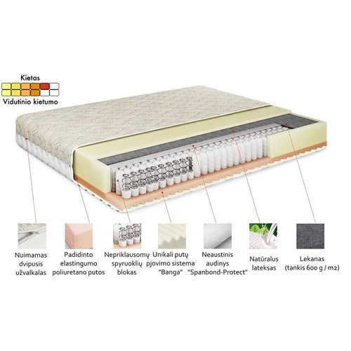 Vienoje spyruoklinio bloko pusėje naudojamas 600 g / m2 tankio lekano sluoksnis kartu su natūraliu lateksu (10 mm), kuris suteikia papildomo tvirtumo bei tolygiai paskirsto apkrovą per visą horizontalų čiužinio paviršių, suteikdamas kryptinę atramą stuburui, ir labai elastingos 12 mm poliuretano putos. Čiužinys šioje pusėje turi kietą paviršių.