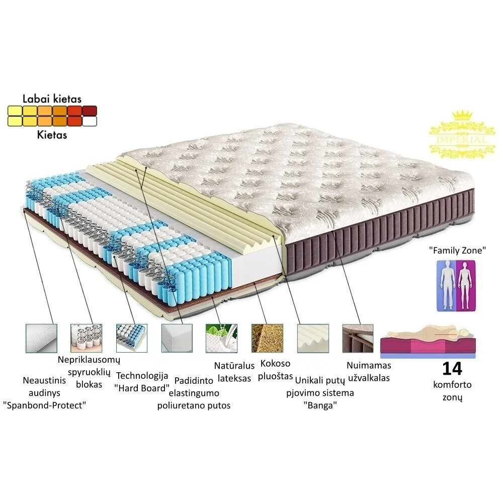 „Imperial“ - tai čiužinys, kuriam rinkoje nėra analogų! Pagamintas remiantis modernia patentuota technologija – „šeimos zona“, kuri vienu metu apima du zonų paskirstymo būdus - išilginį ir skersinį. Išilginė zona atskiria dvi čiužinio miegamąsias vietas ir palaiko balansą, kurio dėka nejaučiami kito miegančio asmens judesiai miego metu. Skersinė zona padeda sumažinti spaudimą stuburui ir atpalaiduoti visus kūno raumenis. Ortopedinis čiužinys turi net 14 komforto zonų.