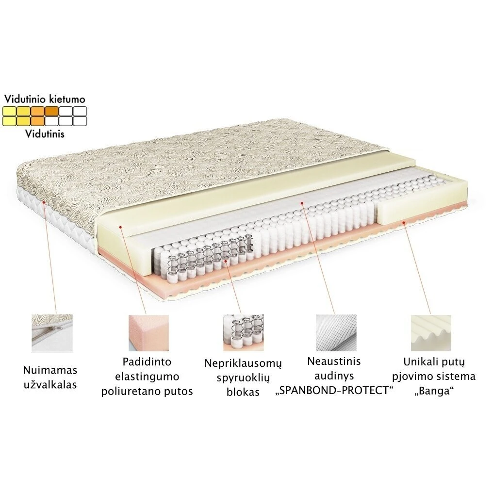 Čiužinio pagrindą sudaro „ANTINOISE“ nepriklausomų spyruoklių blokas, pagamintas remiantis naujausiomis aukštosiomis technologijomis ir naudojant visiškai automatizuotą, vieno iš pirmaujančių pasaulyje gamintojų įrangą. „ANTINOISE“ spyruoklinis blokas suteikia anatominę atramą visoms jūsų kūno vietoms. Spyruoklės vidutinio kietumo, 180-190 mm aukščio, supakuotos į atskirus 120 mm aukščio maišelius. Veikiant slėgiui, spyruoklės yra suspaudžiamos, užtikrinant reikiamą elastingumą ir standumą. Kiekviena spyruoklė suspaudžiama nepriklausomai nuo kitų. Toks spyruoklinis blokas suteikia taškinį elastingumą ir apkrovą atitinkantį korpuso palaikymą. Didelio tankio medžiaga „SPANBOND-PROTECT“ yra naudojama kaip izoliacinis sluoksnis tarp spyruoklinio bloko ir čiužinio užpildų. Ji sumažina trintį tarp klojamųjų sluoksnių ir čiužinio spyruoklinio bloko, saugant čiužinį nuo susidėvėjimo.