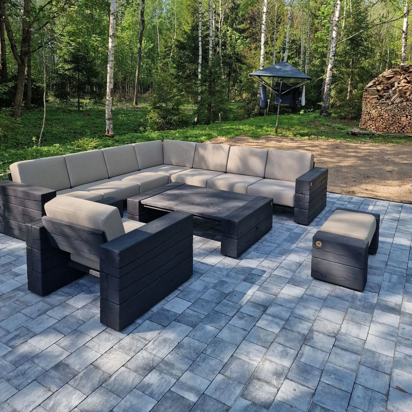 Lauko baldai gaminami iš pušies masyvo, kuri alyvuojama daniška WOCA alyva. Paminkštinimams naudojamas 15 cm storio paralonas. Audinys - 100% olefin audinys, kuris atsparus UV spindulių poveikiui (blukimui), antibakterinių savybių, greitai džiūstantis, labai atsparus dilimui. Visos dalys su užtrauktukais, gali būti nuvelkamos ir skalbiamos. Lengvai valosi ir drėgna šluoste.