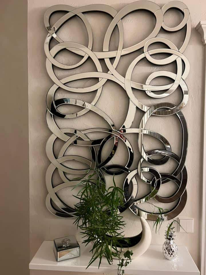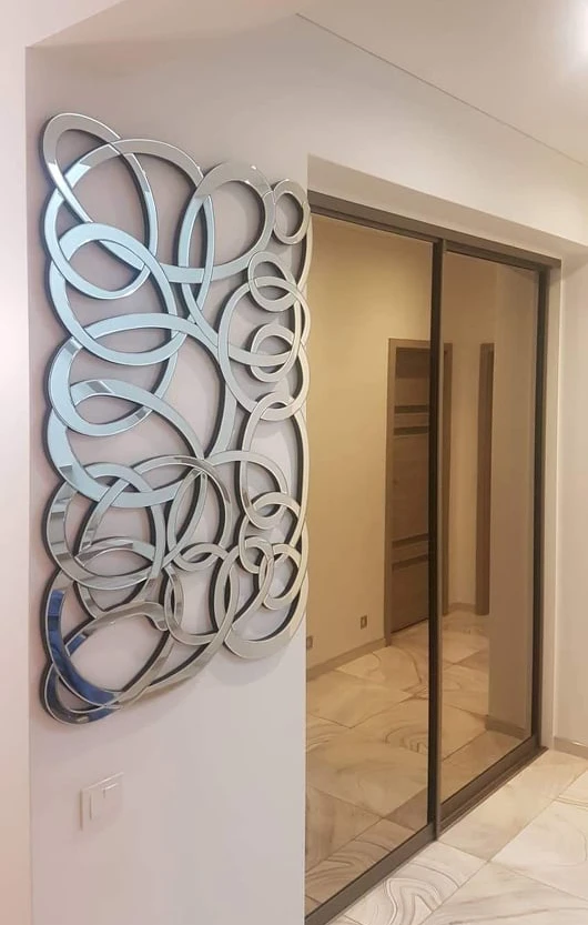 Veidrodis - dekoracija. Pintas veidrodžio stilius suteiks išskirtinumo Jūsų interjerui.Išskirtinio modernaus dizaino dokoracija iš veirodinių elementų. Kabinti galima ir vertikaliai ir horizontaliai.
