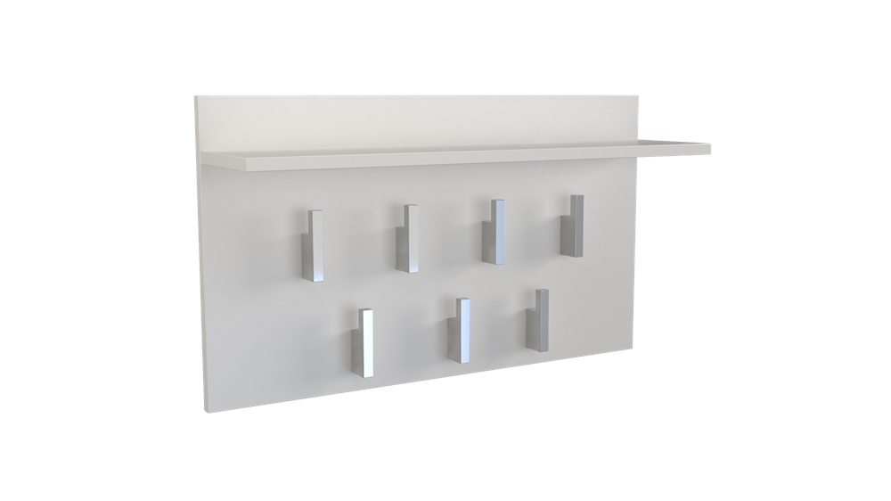 Pagaminta iš 16 mm storio medžio drožlių plokštės (MDP);Kabyklos išmatavimai: plotis - 70 cm, aukštis - 40 cm, gylis – 20 cm;Su septyniais kabliukais ir lentyna Jūsų daiktams;Lentynos matmenys: plotis - 70 cm; gylis - 18 cm;Briaunos dengtos PVC danga, pasižyminčia dideliu cheminiu ir mechaniniu atsparumu;Spalva - balta (matinė);