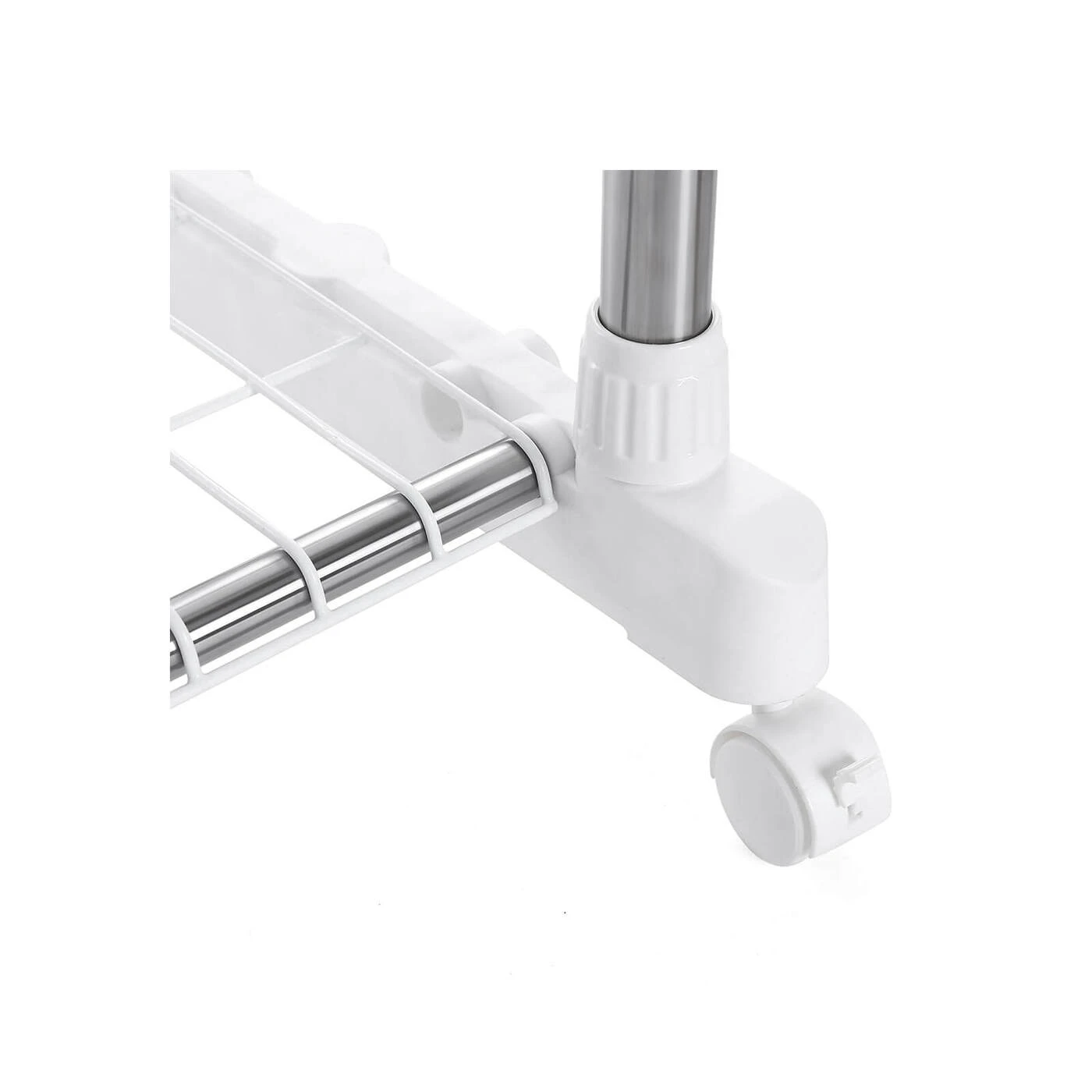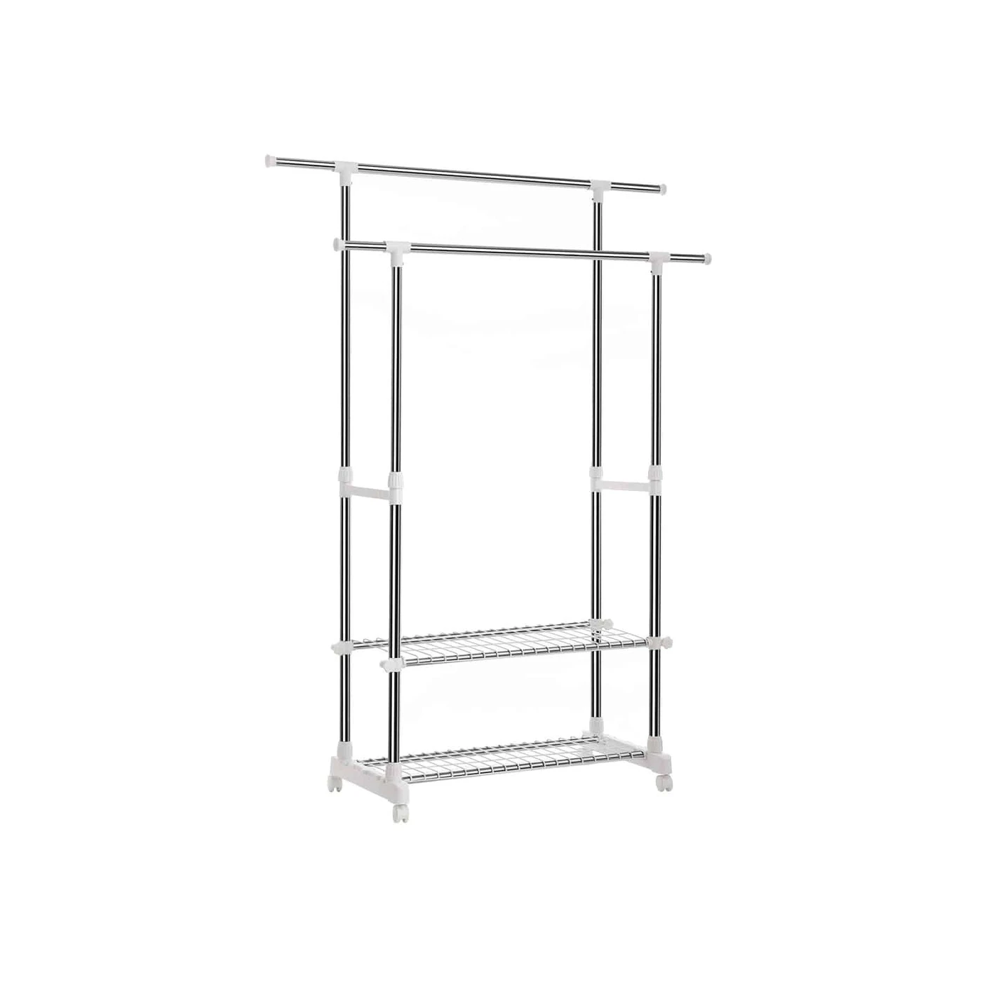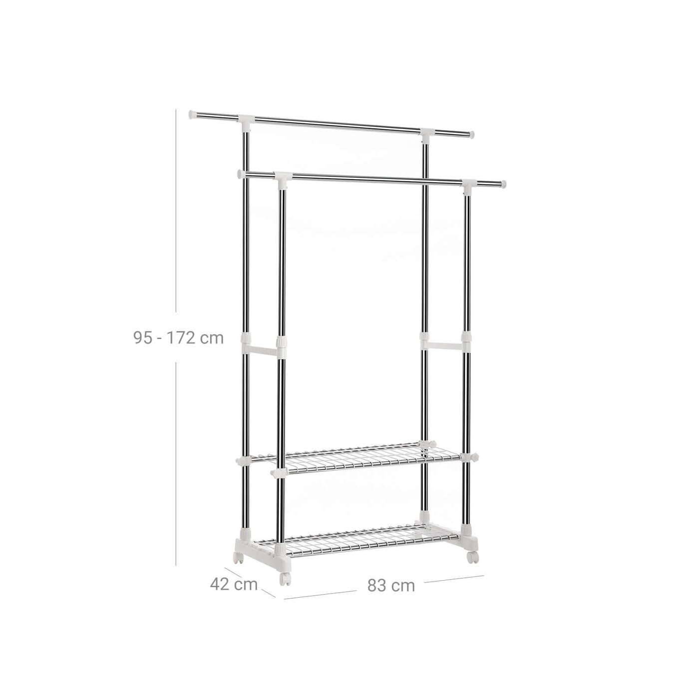 Aprašymas buvo automatiškai išverstas, gali pasitaikyti klaidų.Itin lengva Songmics drabužių kabykla dėl saugios ir stabilios konstrukcijos yra labai atspari, puikiai tinka kiekviename bute! Tvirtas rėmas pagamintas iš metalinių vamzdžių, padengtų nerūdijančiu plienu. 2 drabužių kabyklos ir 2 tinklinės lentynos turi pakankamai vietos suknelėms, palaidinėms, krepšiams, skrybėlėms ir dar daugiau. Atstumas tarp dviejų trinkelių yra reguliuojamas, jį galima optimaliai pritaikyti pagal Jūsų poreikius. Jūsų daiktai gali būti tvarkingai ir lengvai pasiekiami ant jo. Praktiški sklandžiai einantys ratukai užtikrina patogų judėjimą. Drabužių vežimėlį galima lengvai išardyti, todėl jį galima laikyti arba transportuoti taupant vietą. Su praktiška teleskopine funkcija gausite funkcionalų ir savo poreikiams pritaikomą pagalbininką.Išsami informacija apie gaminį: - Matmenys: (90-154) x (95-172) x 42 cm (P x A x G) - Viršutinės tinklelio pagalvėlės gylis: apie 33 cm - Apatinio tinklinio pagalvėlės gylis: apie 26 cm - Medžiaga: su nerūdijančio plieno vamzdeliu + PP plastiku Spalva: balta - Pakuotės dydis: 93 x 36 x 9 cm - Vieno svorio: 6,7 kg Pakuotės turinys: -1 x drabužių kabykla - 1 x instrukcija (DE, EN, FR, IT, ES)