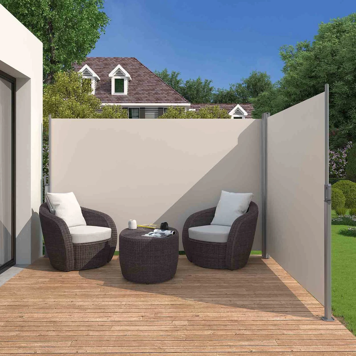 Aprašymas buvo automatiškai išverstas, gali pasitaikyti klaidų.Naudodami savo sode dvigubą šoninę markizę, kurios kampas yra reguliuojamas ir kurio bendras Plotis cm yra 6 m, galėsite atsipalaiduoti ir smagiai praleisti laiką su draugais ir šeima. Jo dvišalis dizainas leidžia individualiai reguliuoti kampą, kurį galite lengvai sureguliuokite kaip norite. Sukurkite atpalaiduojančią erdvę savo sode: galėsite smagiai praleisti laiką su draugais ir šeima Atskirai ištraukiamas markizės audinys: Jei norite mėgautis daugiau saulės, taip pat galite naudoti tik vieną pusę. Visas prailginimo Plotis cm (bendras Plotis cm) 6 M: kaip siena, ji suteikia jums pakankamai privatumo ir apsaugos nuo saulės, dėl savo ypač didelio pločio praktiškai tinka optimaliam kambariui.Pastaba: Markizės pirmiausia yra apsauga nuo saulės. Naudokite juos tik tada, kai nėra vėjo arba pučia švelnus vėjas. Todėl pučiant stipriam vėjui, taip pat stipriai lyjant ar sningant, juos reikia nedelsiant ištraukti. Priešingu atveju gali atsirasti žala.Išsami informacija apie gaminį: Markizės dėžutė: Aliuminis Markizės audinys: Poliesteris (280g/m²), vandeniui atspari PU danga Matmenys: 180 cm x 600 cm (A x P) Svoris: 16 kg Pristatymo komplektas: 1 x dvipusis tentas 1 x instrukcija (DE) , EN, FR, IT, ES )