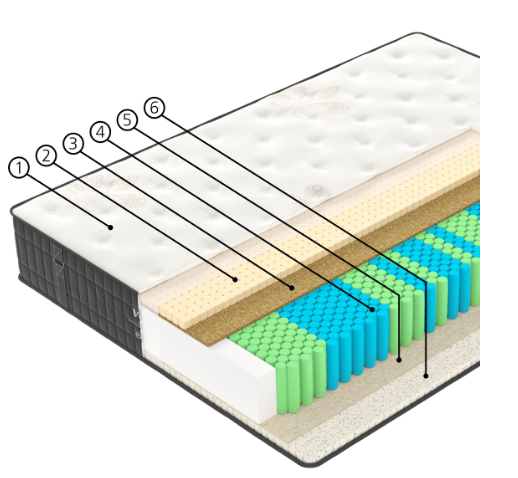 5. Linas. Vientisas sluoksnis iš lino pluošto. Prailgina čiužinio tarnavimo laiką, užkirsdamas kelią aktyviam spyruoklių bloko veikimui į minkštuosius pakloto sluoksnius.