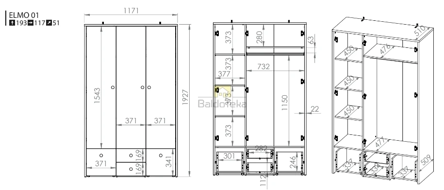 Plotis/Aukštis/Gylis: 117/193/51 cm.