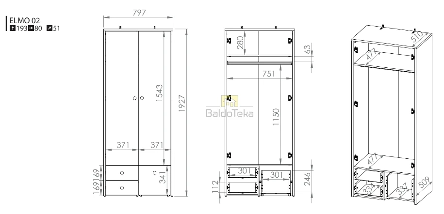 Plotis/Aukštis/Gylis: 80/193/51 cm.