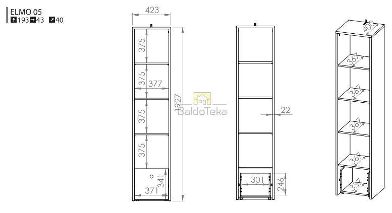 Plotis/Aukštis/Gylis: 43/193/40 cm.
