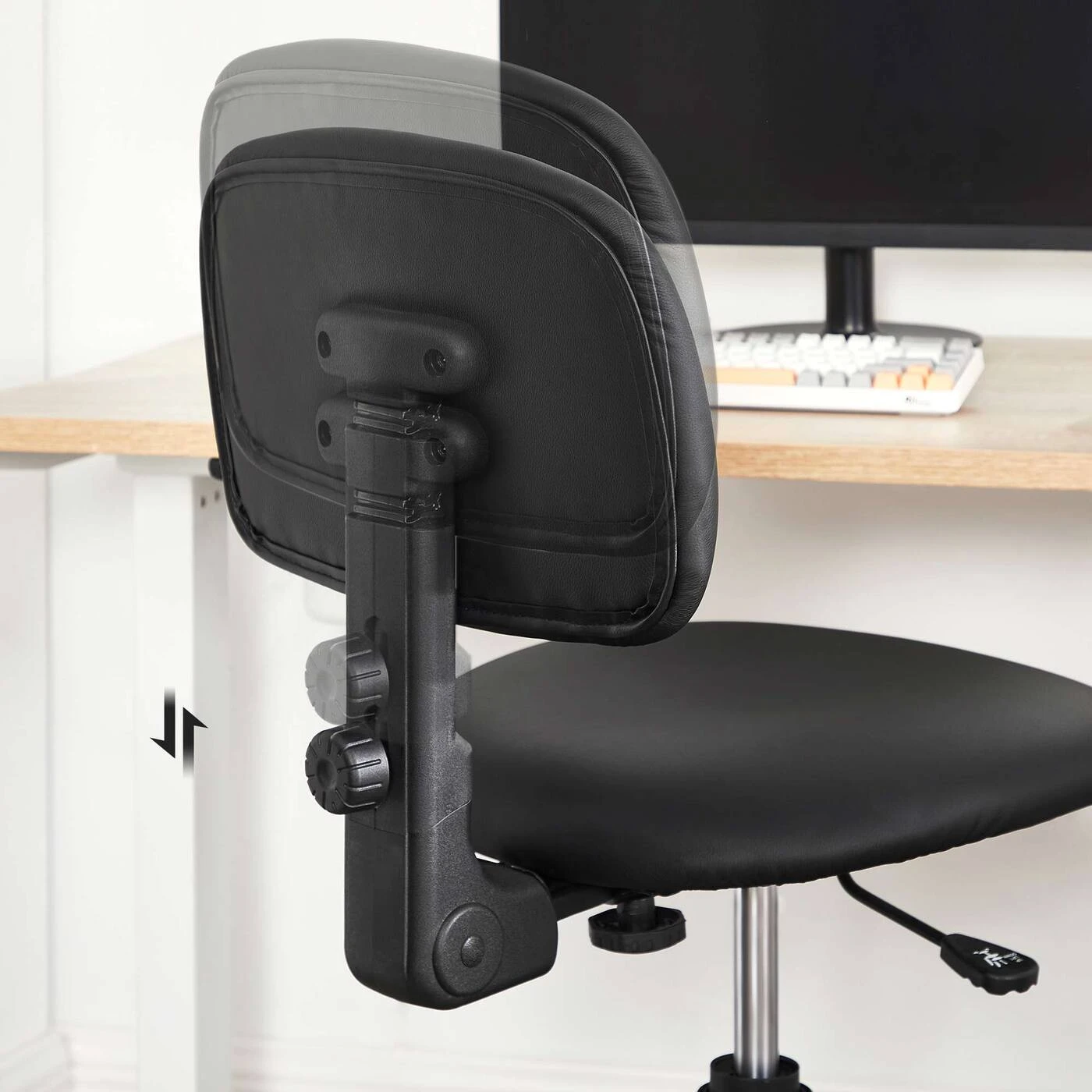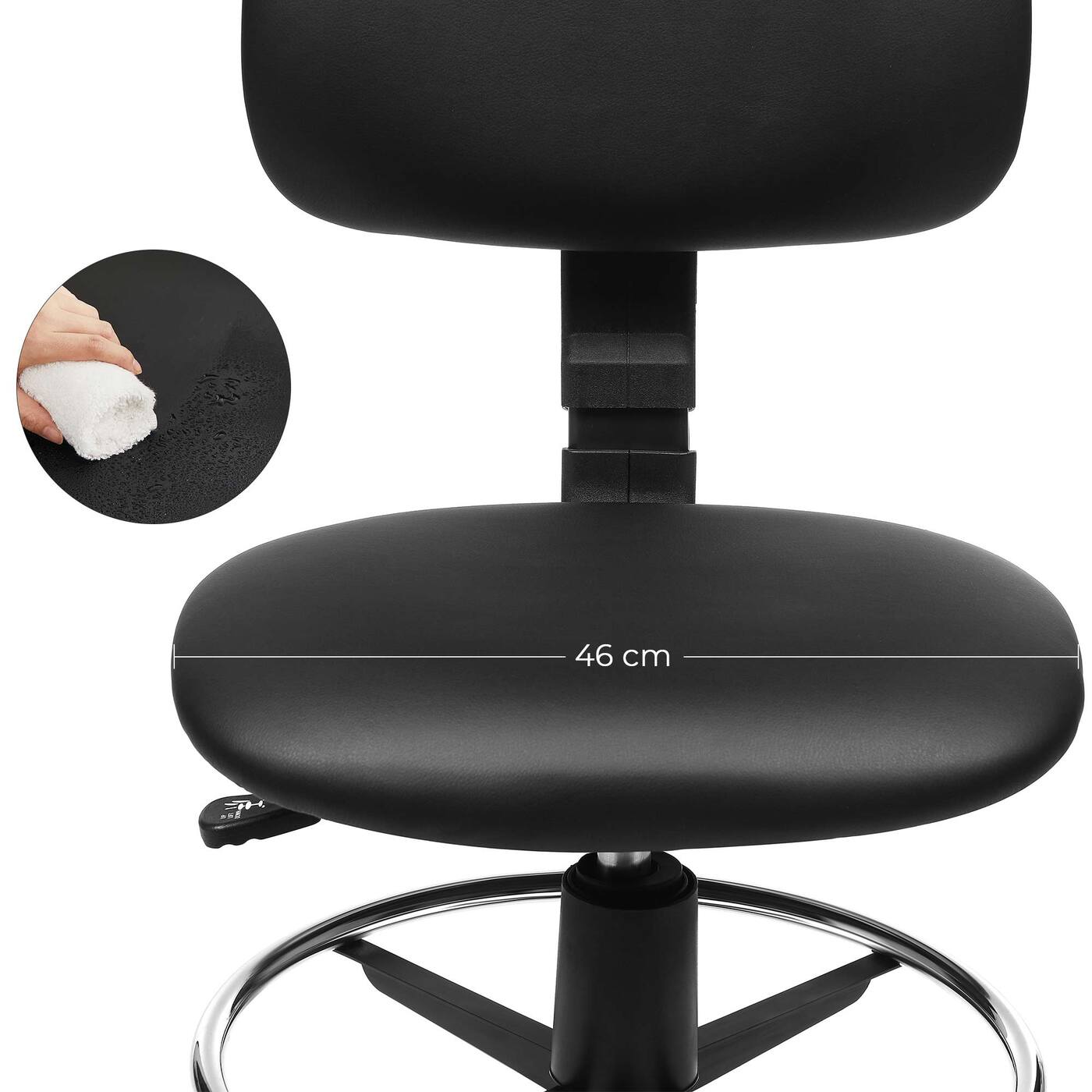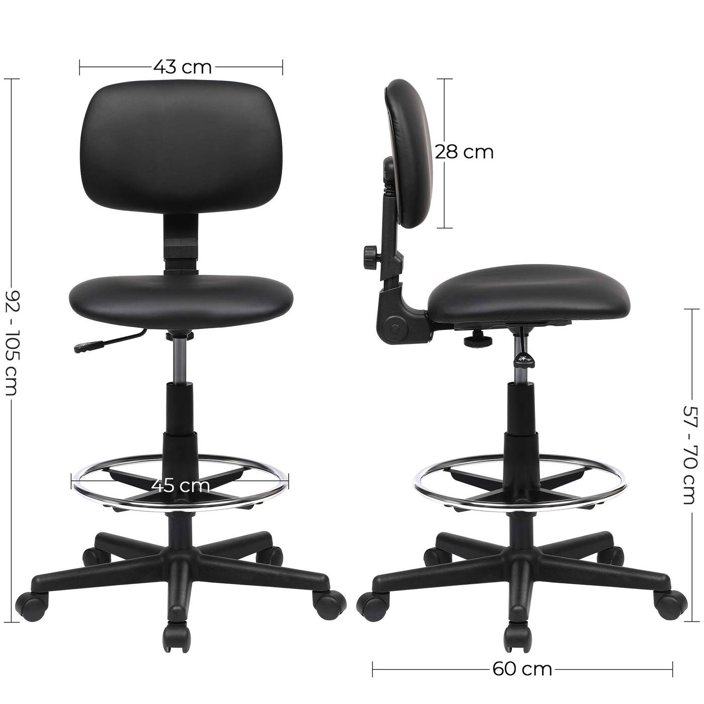 Aprašymas buvo automatiškai išverstas, gali pasitaikyti klaidų.Informacija apie gaminį: Spalva: Juoda Medžiaga: Pagrindas: Nailonas Atlošas: Kartonas, putplastis, PU Sėdynė: Kartonas, putplastis, PU Ratai: Nailonas Automatinio grąžinimo cilindras: Plienas Dydis: Bendras aukštis: 92-105 cm Sėdynės aukštis: 57- 70 cm Sėdynės Plotis cm: 46 cm Sėdynės gylis: 42 cm, atlošo aukštis: 28 cm, atlošo Plotis cm: 43 cm, pagrindo skersmuo: 64 cm, kojų atramos skersmuo: 45 cm, skersmuo: ratukai: 50 mm, ašies skersmuo: 11 mm, svoris: 11,3 kg, maks. statinė apkrova: 120 kgPristatymo komplektas: 1 x biuro kėdė 1 x šešiakampis raktas 1 x priedų paketas 1 x instrukcijos (DE, EN, IT, FR, ES) SONGMICS Pastabos: Surinkdami įsitikinkite, kad ant plokštelės su sėdyne būtų užrašas ""FRONT"" mechanizmas nukreiptas į priekį. Jei norite kėdę naudoti ant medinių grindų, naudokite pagalvėlę.