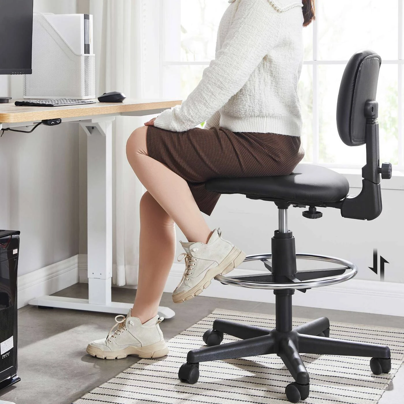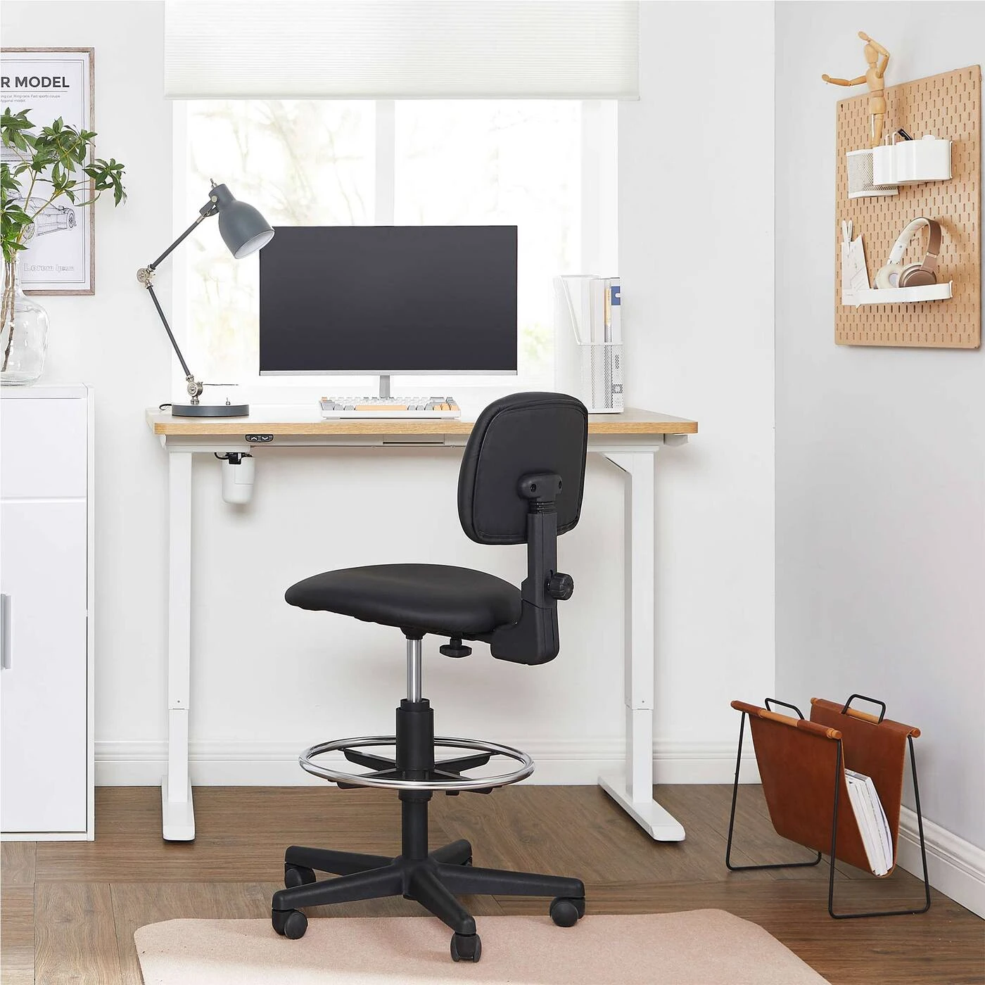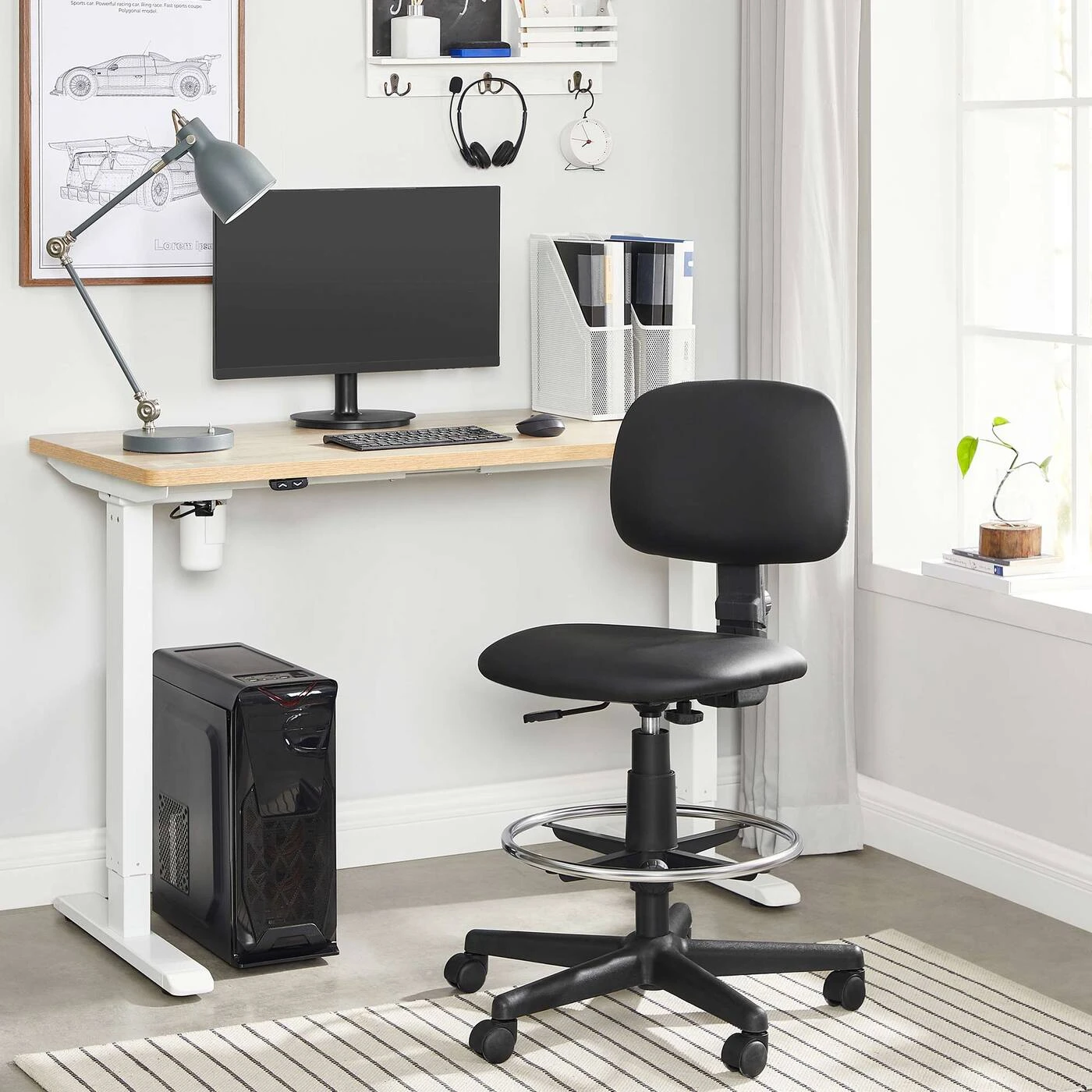 Aprašymas buvo automatiškai išverstas, gali pasitaikyti klaidų.Informacija apie gaminį: Spalva: Juoda Medžiaga: Pagrindas: Nailonas Atlošas: Kartonas, putplastis, PU Sėdynė: Kartonas, putplastis, PU Ratai: Nailonas Automatinio grąžinimo cilindras: Plienas Dydis: Bendras aukštis: 92-105 cm Sėdynės aukštis: 57- 70 cm Sėdynės Plotis cm: 46 cm Sėdynės gylis: 42 cm, atlošo aukštis: 28 cm, atlošo Plotis cm: 43 cm, pagrindo skersmuo: 64 cm, kojų atramos skersmuo: 45 cm, skersmuo: ratukai: 50 mm, ašies skersmuo: 11 mm, svoris: 11,3 kg, maks. statinė apkrova: 120 kgPristatymo komplektas: 1 x biuro kėdė 1 x šešiakampis raktas 1 x priedų paketas 1 x instrukcijos (DE, EN, IT, FR, ES) SONGMICS Pastabos: Surinkdami įsitikinkite, kad ant plokštelės su sėdyne būtų užrašas ""FRONT"" mechanizmas nukreiptas į priekį. Jei norite kėdę naudoti ant medinių grindų, naudokite pagalvėlę.