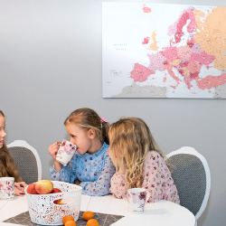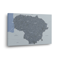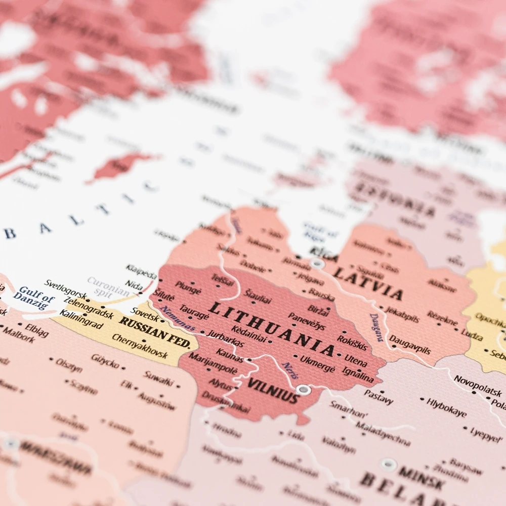 XL 150×100 cm – 199 €, L 120×80 cm – 159 €, M 100×700 cm – 119 €. MEDŽIAGOS Žemėlapis išliks ryškus ir puikios išvaizdos daugybę metų, nes jam pagaminti naudojamos aukščiausios kokybės medžiagos. Išspausdintas vaizdas yra padengiamas vandens pagrindo rūgščių neturinčiu apsauginiu laku, kuris atitinka muziejuose saugomų eksponatų reikalavimus - iki 80-100 metų spalvos išlieka nepakitusios. Kiekvienas žemėlapis yra kruopščiai pagamintas Lietuvoje profesionalių MyPoint meistrų. Smulkios tekstūros ir tvirta 310g/m² drobė Coala,Aukštos raiškos Mutoh spausdintuvas, užtikrinantis aiškų skaitomumą (Japonija),Originalūs ir ilgaamžiai dažai, suteikiantys ryškias spalvas (Japonija),Nuo blukimo ir neigiamo aplinkos poveikio apsaugantis matinis spaudos lakas (Jungtinė Karalystė);Tvirtas natūralaus medžio porėmis užpildytas su putų plokšte – lengvai konstrukcijai ir patogiam smeigtukų naudojimui (Lietuva).