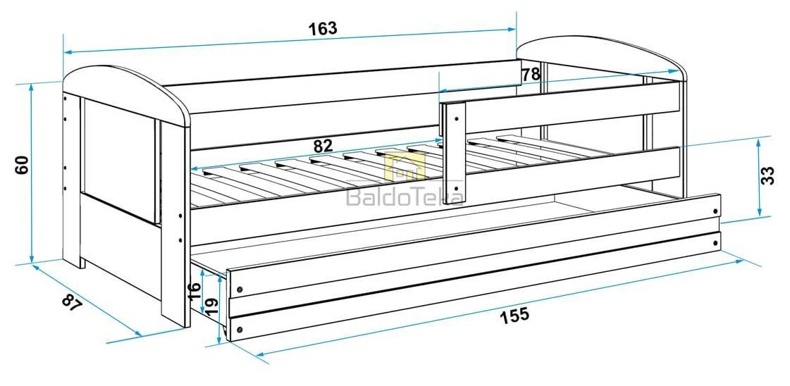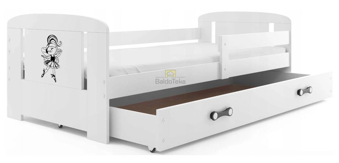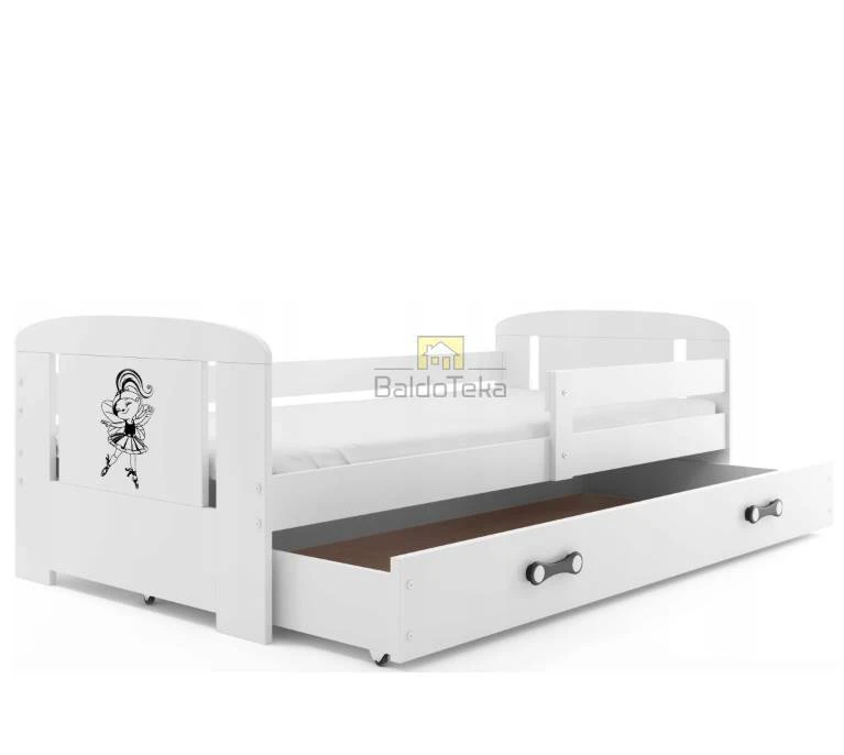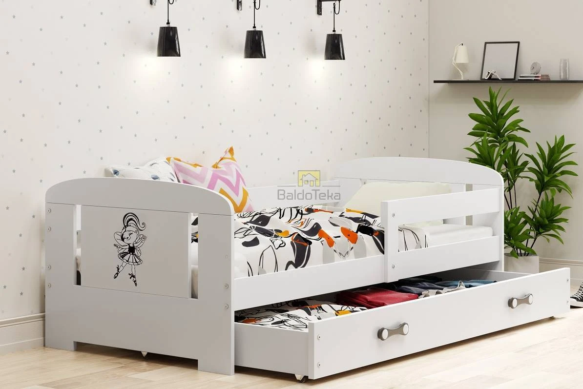 Su 190×80 cm poliuretaniniu čiužiniu, su patalynės dėže ir apsaugine tvorele.