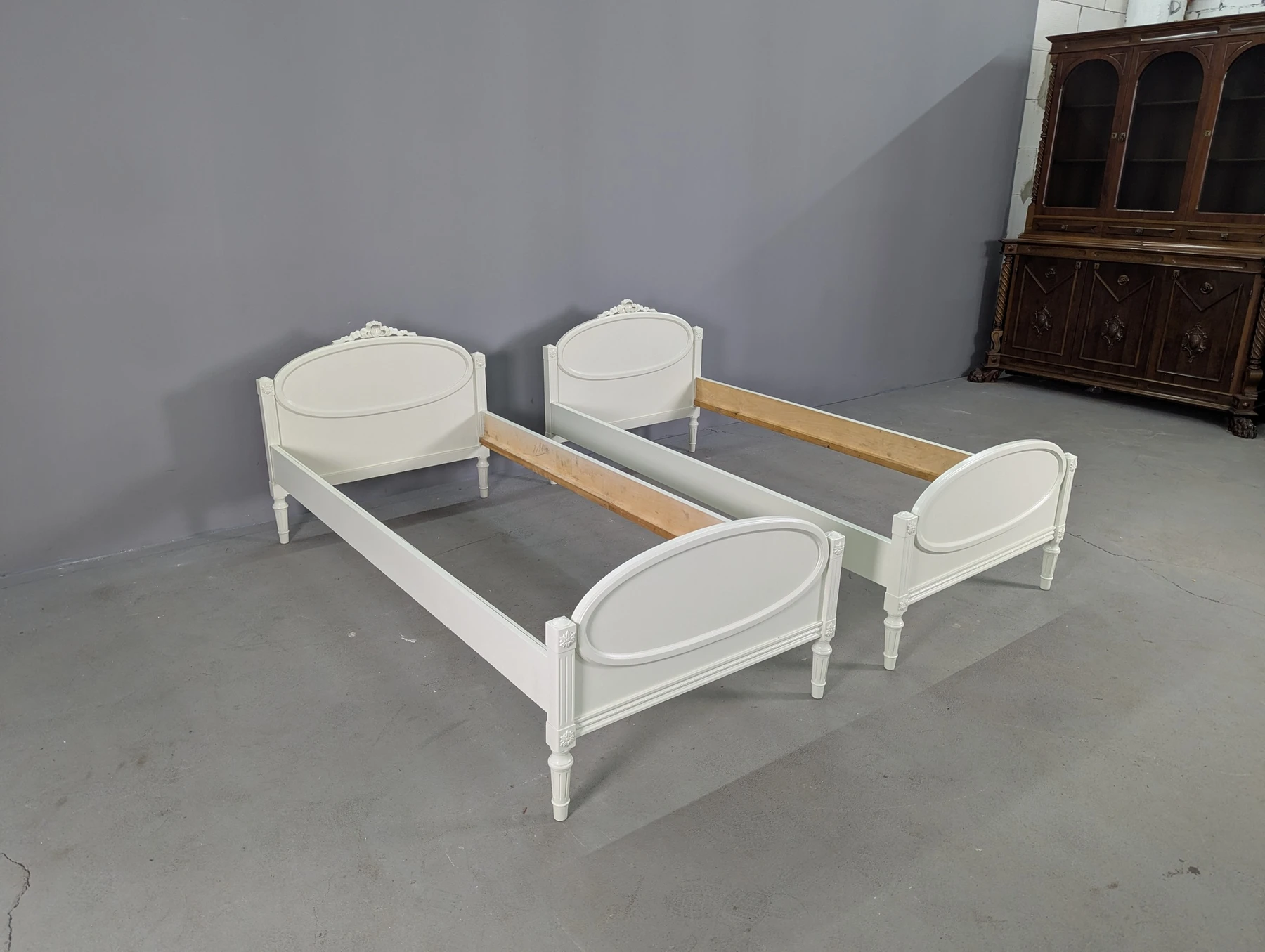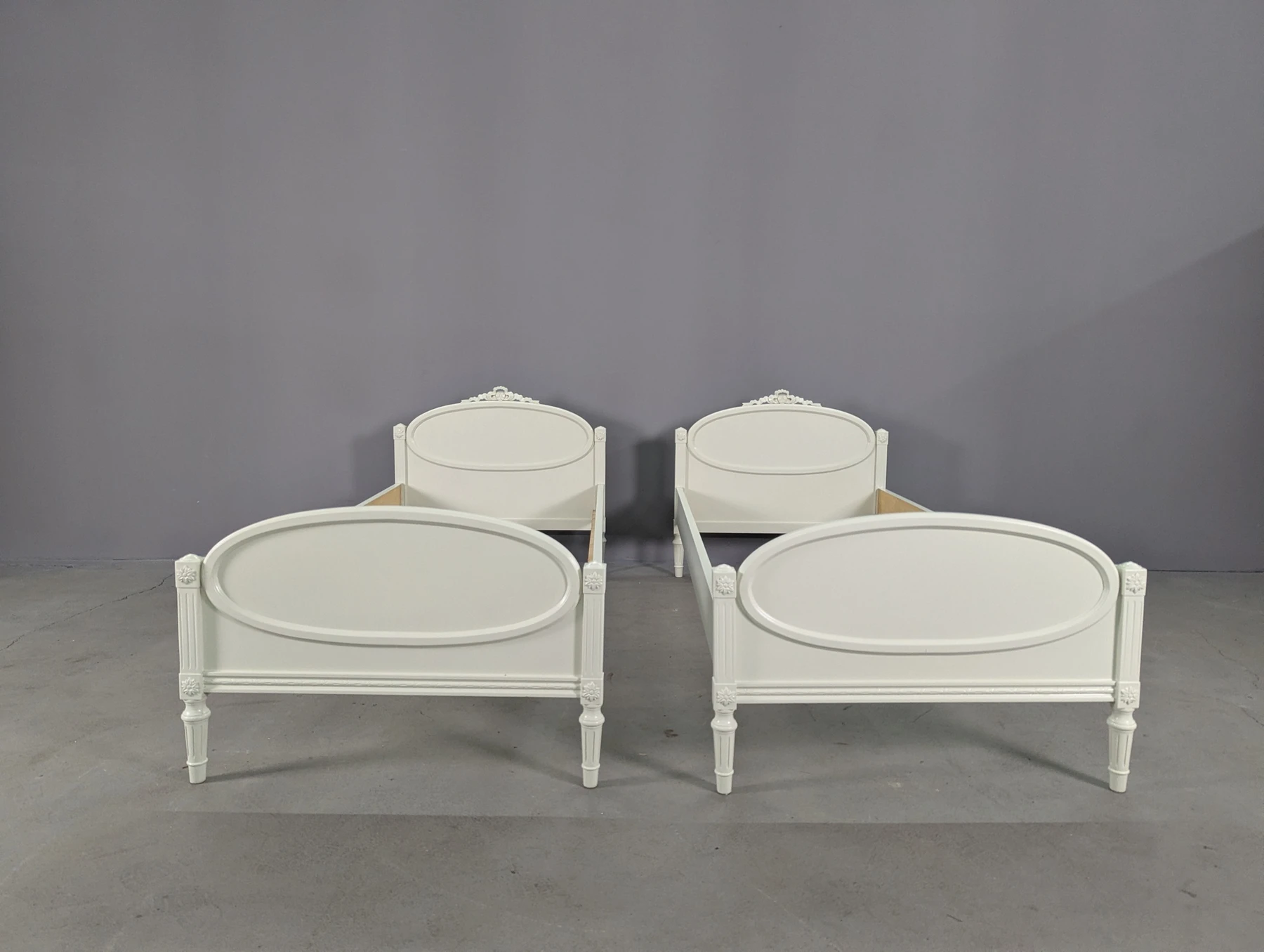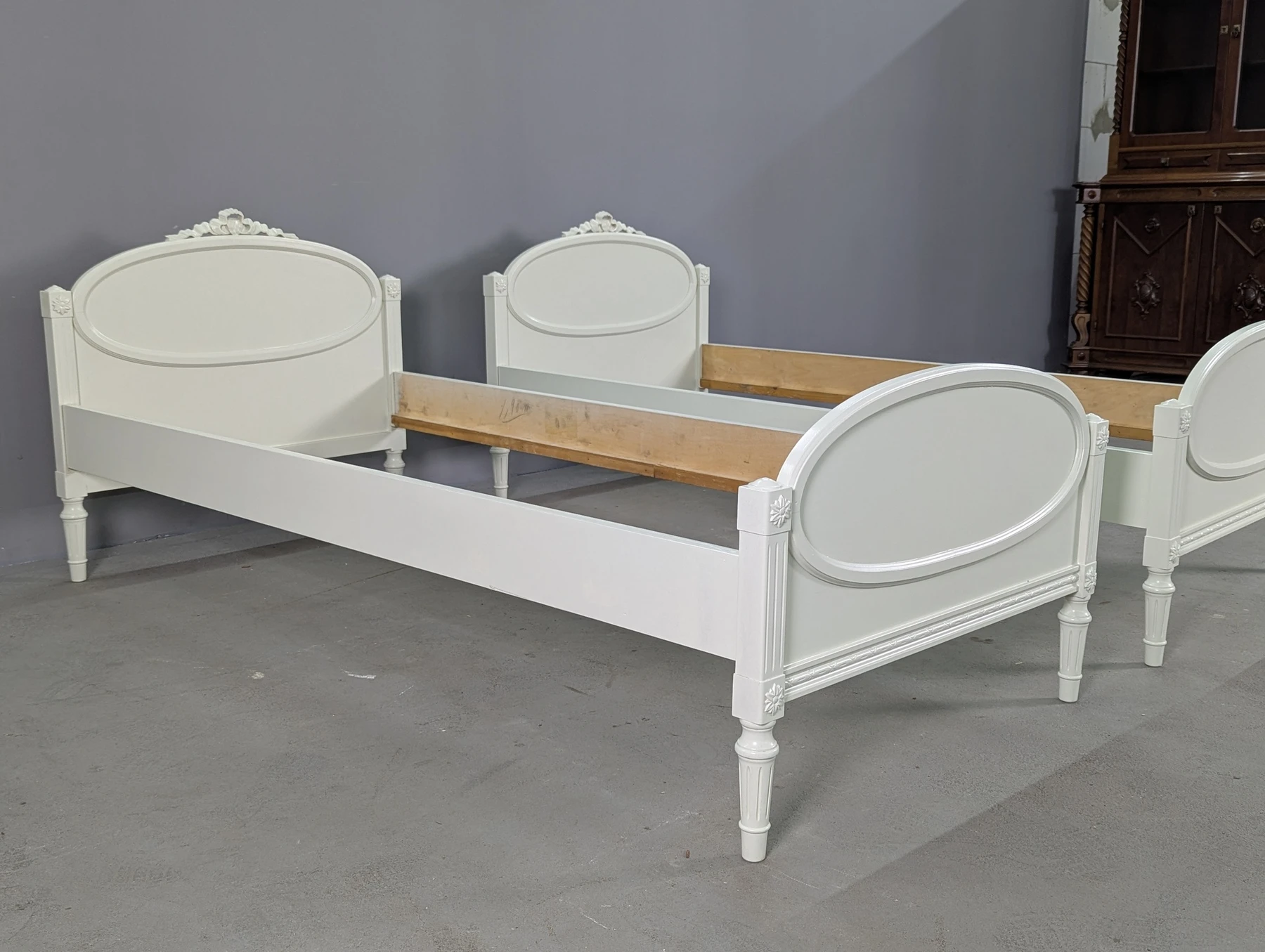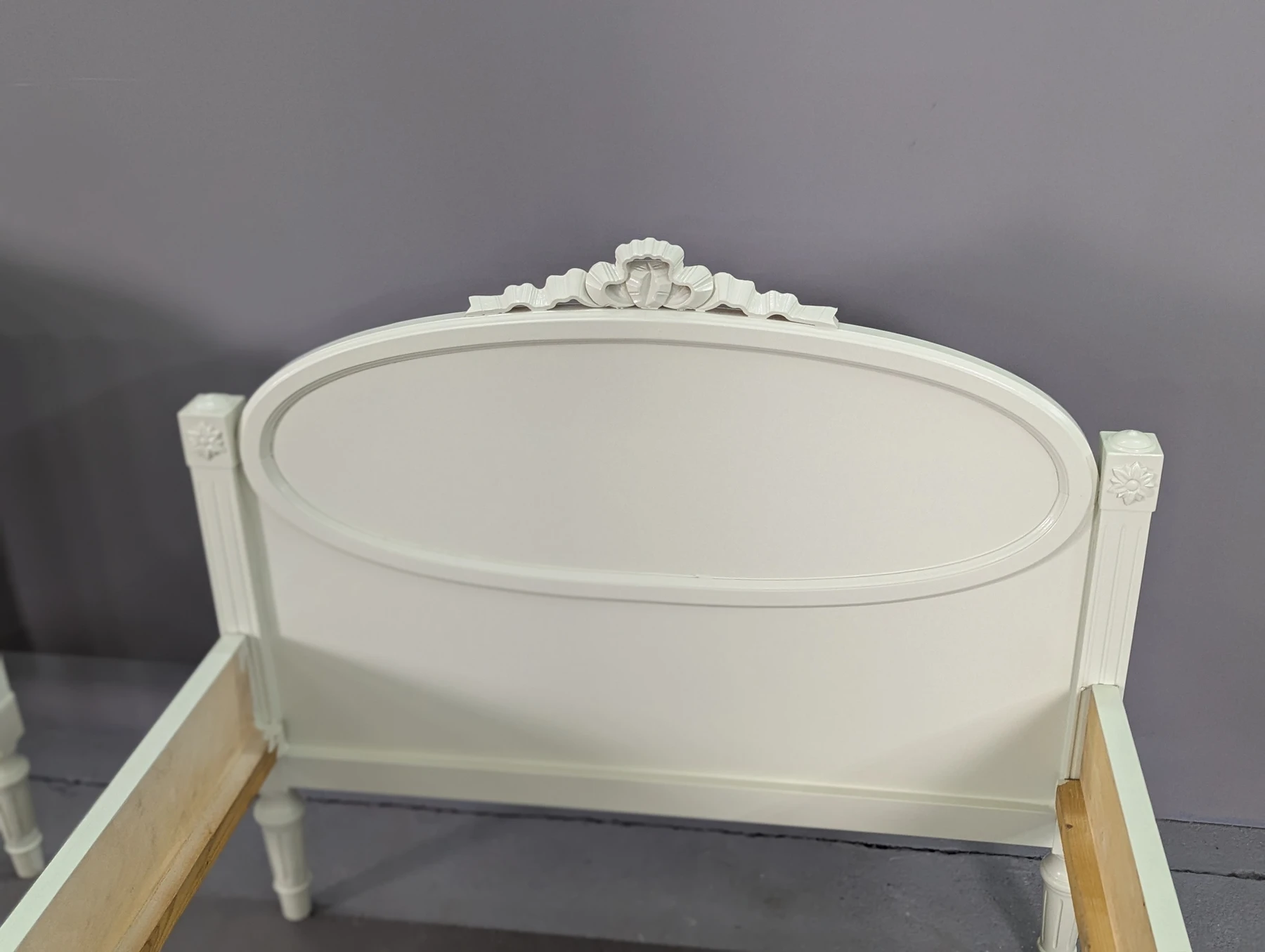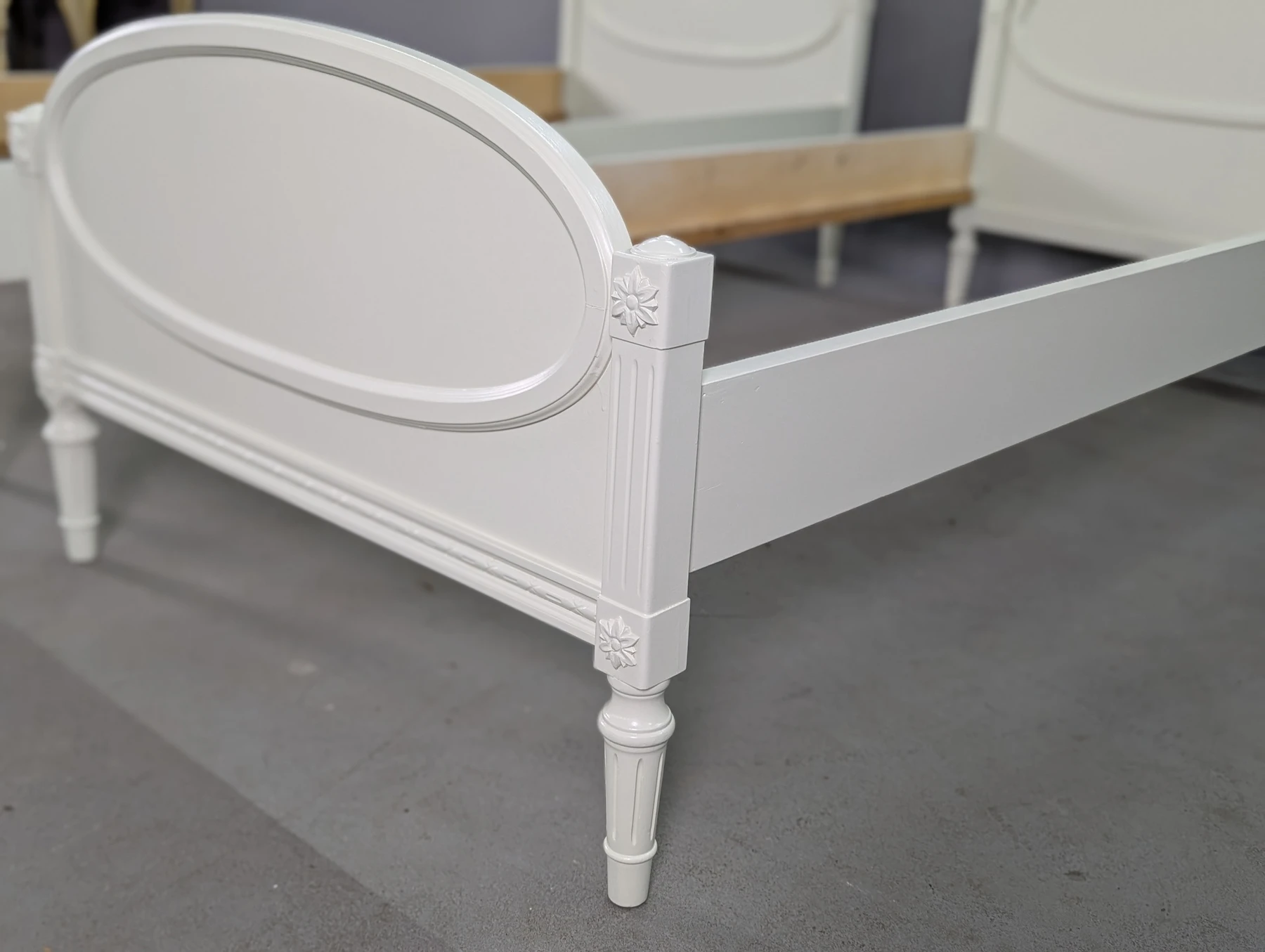 Klasikinio Gustavian stiliaus miegamojo lovos – baltos viengulės lovos su išraiškingomis ovalo formos detalėmis. Šviesus tonas, grakščios formos ir raižyti ornamentai suteikia interjerui lengvumo bei subtilios prabangos. Lova tvirta, su medinėmis grotelėmis.