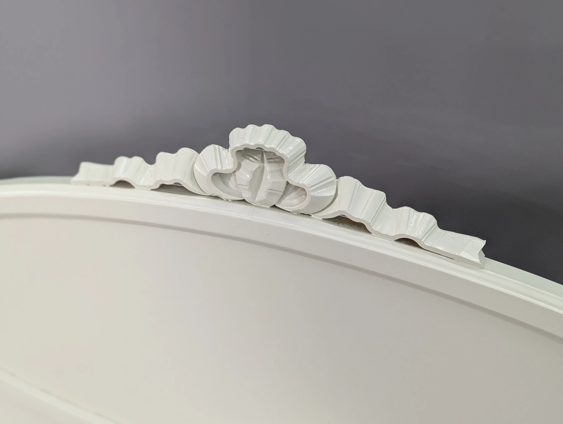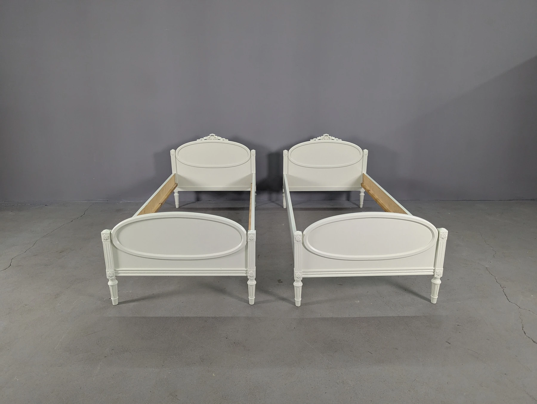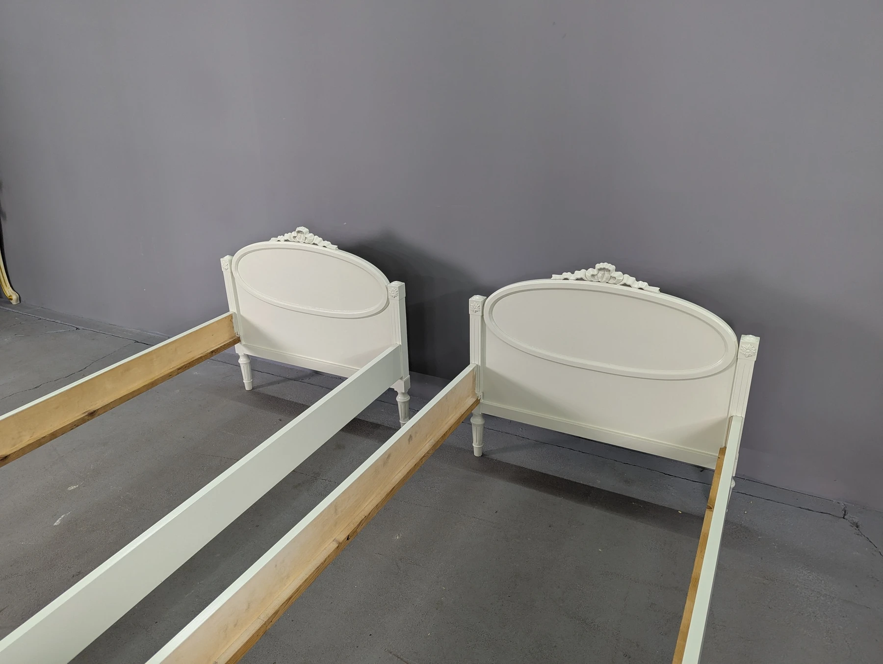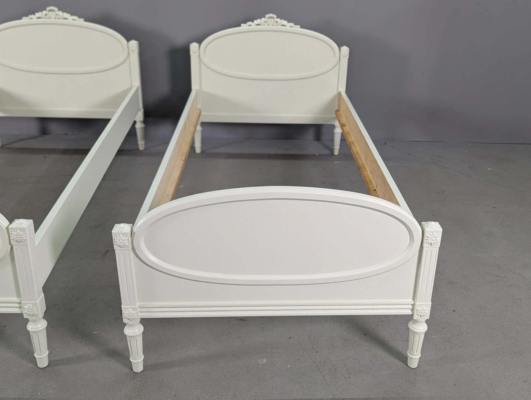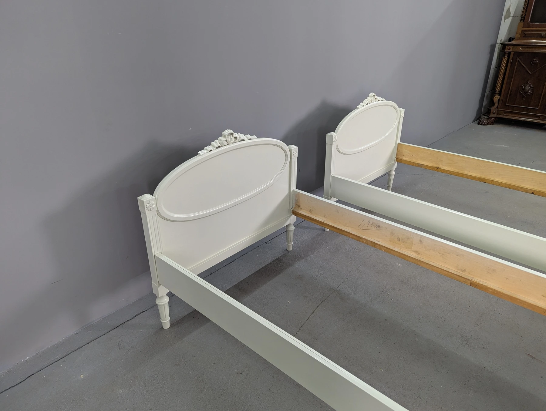 Klasikinio Gustavian stiliaus miegamojo lovos – baltos viengulės lovos su išraiškingomis ovalo formos detalėmis. Šviesus tonas, grakščios formos ir raižyti ornamentai suteikia interjerui lengvumo bei subtilios prabangos. Lova tvirta, su medinėmis grotelėmis.