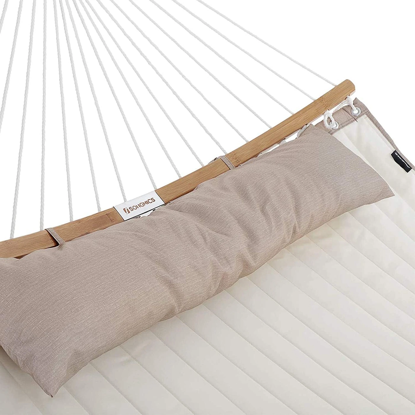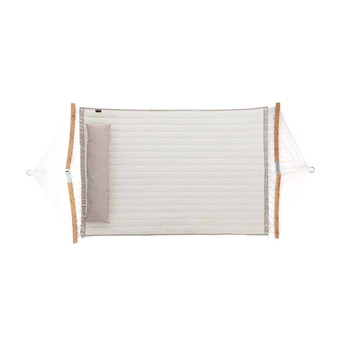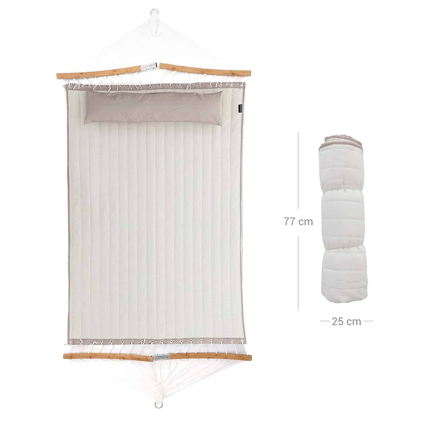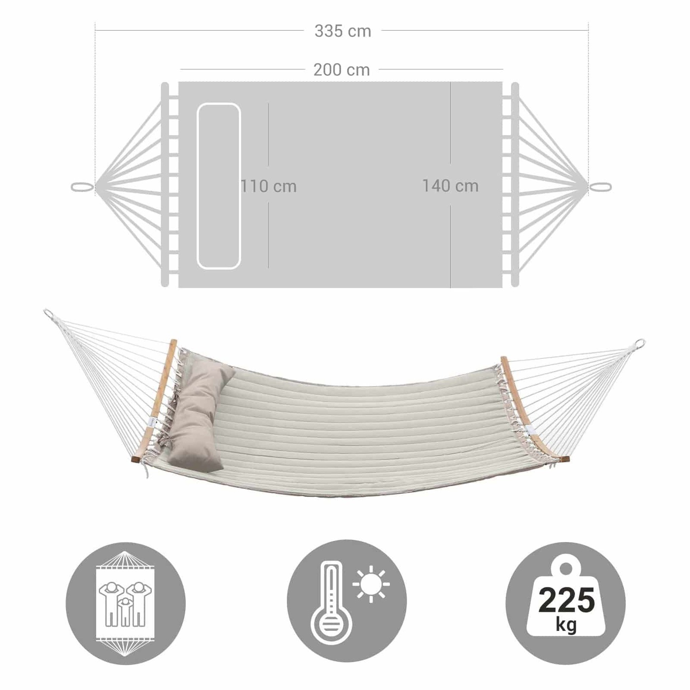 Aprašymas buvo automatiškai išverstas, gali pasitaikyti klaidų.Tinka sode Pritvirtinkite šį hamaką savo sode ar kieme ir paverskite jį savo kasdienio gyvenimo dalimi. Ramią popietę čia galite paskaityti knygą ar nusnūsti, arba atsigulti su vaikais ir žiūrėti į nakties žvaigždes. Tinka svetainėje Su šiuo paminkštintu hamaku sukurkite savo svetainėje ramybės oazę. Nesvarbu, ar lauke karšta, ar šalta, galite prisiglausti kaip katė, klausytis muzikos ar žiūrėti filmą ir atsikratyti kasdienės įtampos. Tinka paplūdimiui Atsigulkite šiame dideliame hamake kartu su savo partneriu ir mėgaukitės žydra jūra, gaiviu vėjeliu ir raminančiu bangų garsu. Ar norėtumėte stebėti saulėlydį? Jokiu problemu! Tinka kelionėms Pritvirtinkite šią plūduriuojančią lovą prie 2 medžių ir atsisėskite arba atsigulkite po kepsninės vakarėlio. Netoliese žaidžia jūsų vaikai ir šunys, jūs supasi pirmyn ir atgal šiame hamake – puikios atostogos su visa šeima! Išsami informacija apie gaminį: - Spalva: balkšvai smėlio spalvos - Medžiaga: 300D Oksfordo audinys, metalas, poliesterio užpildas, bambukas - Dydis: 200 x 140 cm (P x P) - Bendras ilgis: 335 cm - Pagalvės matmenys: 110 x 26 cm (P x Ø) - Svoris: 5,5 kg - Maksimali statinė apkrova: 225 kgPristatymo komplektacija: - 1 x hamakas - 1 x nuimama pagalvė - 1 x instrukcija (DE, EN, FR, ES, IT) SONGMICS Pastabos: - Kadangi gaminio spalva gali keistis skirtinguose monitoriuose, gali atsirasti spalvų nukrypimų. - Iš Mums pateikti matmenys buvo nustatyti rankiniu būdu išmatuojant, todėl prekė gali skirtis iki 5 cm.- Dirželiai ir karabinai nepridedami.