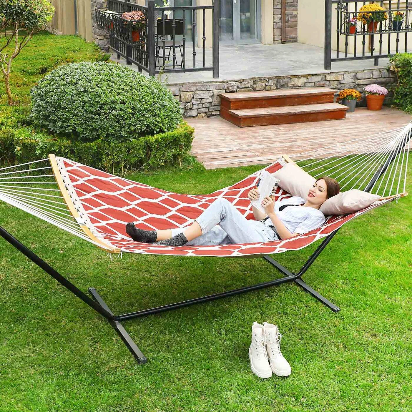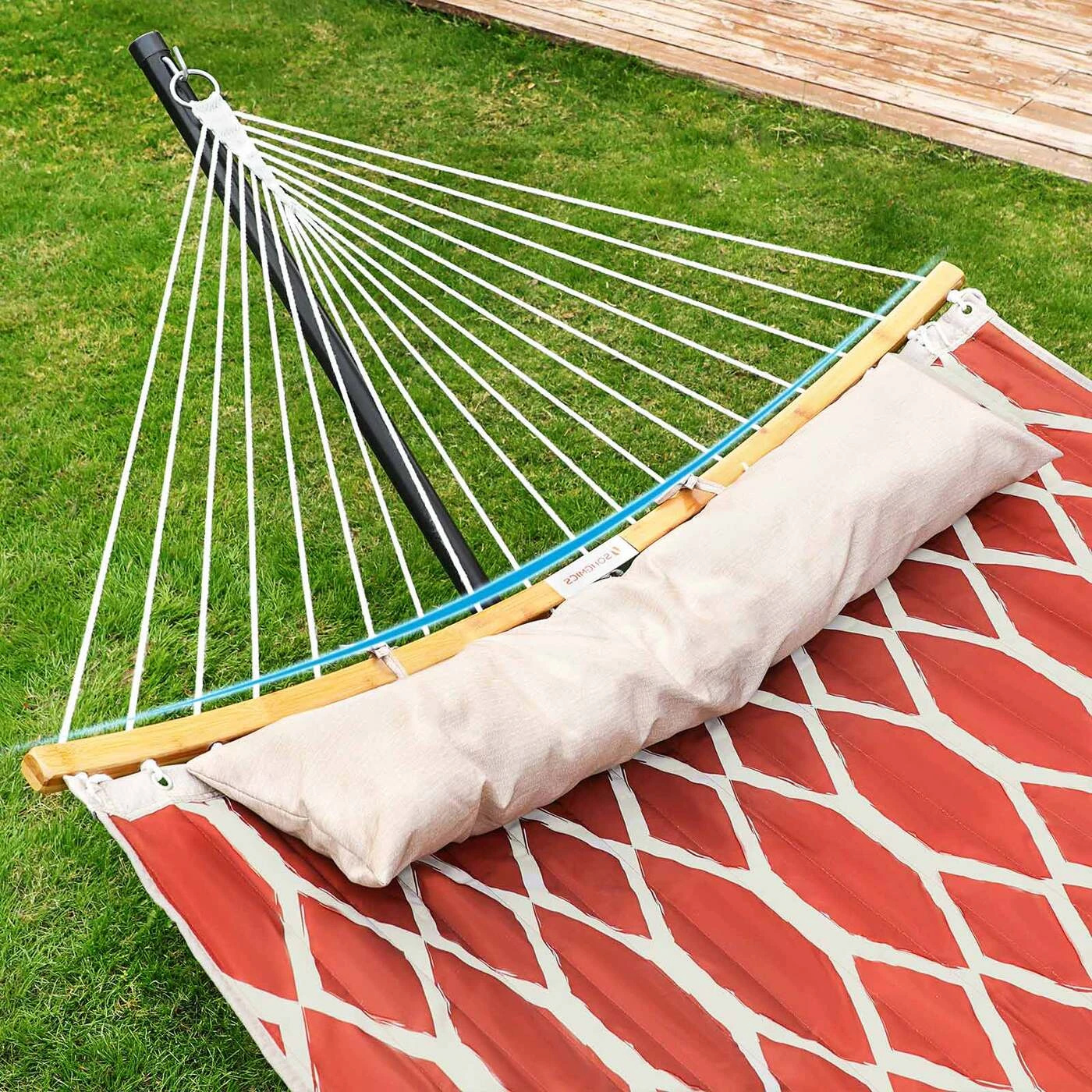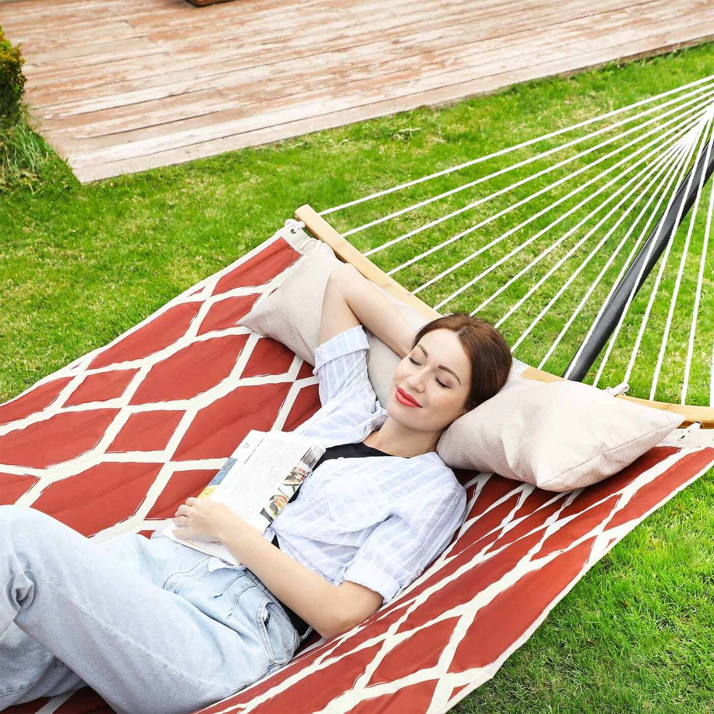 Aprašymas buvo automatiškai išverstas, gali pasitaikyti klaidų.Tinka sode: pritvirtinkite šį hamaką savo sode ar kieme ir paverskite jį savo kasdienio gyvenimo dalimi. Čia galite paskaityti knygą ar nusnūsti tingią popietę arba gulėti su vaikais ir naktį žiūrėti į žvaigždes. Tinka svetainėje:sukurkite savo svetainėje ramybės oazę naudodami šį minkštą hamaką. Nesvarbu, ar lauke karšta, ar šalta, po kepsnių vakarėlio galite prisiglausti kaip katė, klausytis muzikos ar žiūrėti filmą ir paleisti kasdienį stresą. Netoliese žaidžia jūsų vaikai ir šunys, jūs supasi pirmyn ir atgal šiame hamake – puikios atostogos su visa šeima!Informacija apie gaminį: Spalva: Raudoni ir smėlio spalvos deimantai Medžiaga: 300D Oksfordo audinys, poliesterio užpildas, bambukas Dydis: 200 x 140 cm (P x P) Bendras hamako ilgis: 335 cm Svoris: 4,5 kg Maks. Statinė apkrova: 225 kg Pristatymo komplektas: 1 x hamakas 1 x pagalvė (nuimama) 1 x instrukcijos SONGMICS Pastabos: Didžiausia šio gaminio statinė apkrova yra 225 kg. Neviršykite šio maksimalaus svorio. Nelaikykite gaminio ilgą laiką tiesioginiuose saulės spinduliuose. Prieš atsiguldami visada patikrinkite hamako stabilumą.