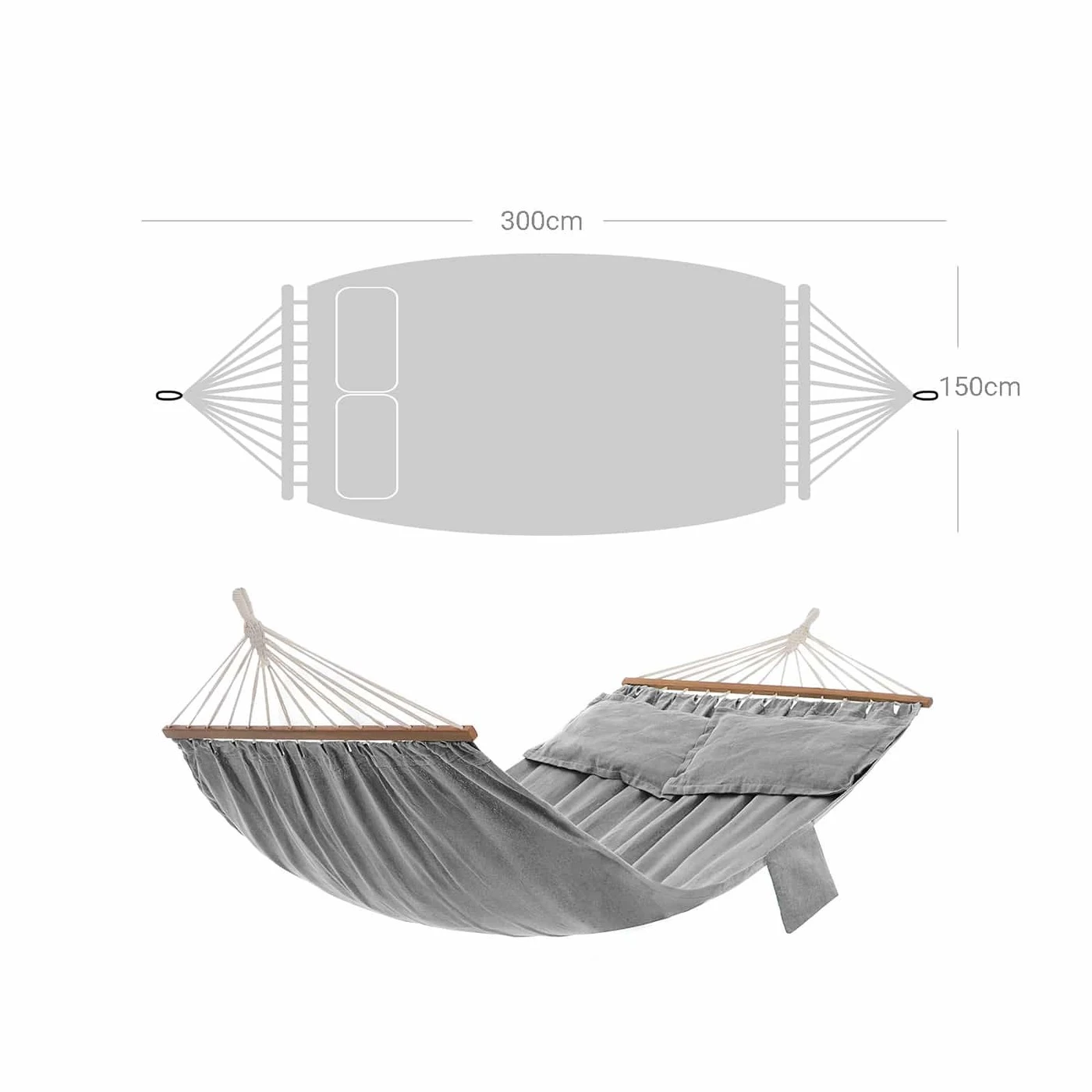 Aprašymas buvo automatiškai išverstas, gali pasitaikyti klaidų.Tinka sode Pritvirtinkite šį hamaką savo sode ar kieme ir paverskite jį savo kasdienio gyvenimo dalimi. Ramią popietę čia galite paskaityti knygą ar nusnūsti, arba atsigulti su vaikais ir žiūrėti į nakties žvaigždes. Tinka kelionėms Pritvirtinkite šią plūduriuojančią lovą prie 2 medžių ir atsisėskite arba atsigulkite po kepsninės vakarėlio. Jūsų vaikai ir šunys žaidžia netoliese, jūs supasi pirmyn ir atgal šiame hamake – puikios atostogos su visa šeima! Sąrašas tęsiasi Su šiuo hamaku susikursite savo poilsį savo balkone arba terasoje. Arba eikite į gamtą ir naudokitės šiuo hamaku miške ar prie ežero. Ten, kur auga medžiai arba yra hamako stovas, yra galimybė įsigyti šį hamaką.Informacija apie gaminį: - Spalva: pilka - Medžiaga: 380 g/m² mišrus audinys (70% medvilnė, 30% poliesteris), mediena - Gulimojo paviršiaus dydis: 210 x 150 (I x P) - Bendras ilgis: 300 cm - Dydis vienai pagalvei: 70 x 40 cm (P x P) - Medinio stulpo dydis: 120 x 3,2 x 2,2 cm (P x P x A) - Svoris: 4,1 kg - Maksimali statinė apkrova: 300 kg Pakuotės turinys:- 1 x Hamakas – 2 x pagalvės – 1 x nešiojimo krepšys SONGMICS Pastabos:- Vaikai gaminį turėtų naudoti tik prižiūrimi suaugusiojo.- Kadangi gaminio spalva gali keistis skirtinguose monitoriuose, gali būti spalvų nukrypimų.- Įsitikinkite, kad kad giliausias Hamako taškas yra apie 20-40 cm virš žemės, nes naudojant hamakas gali išsitempti.- Diržai ir karabinai nepridedami.