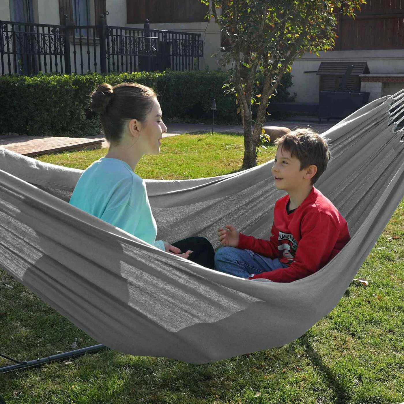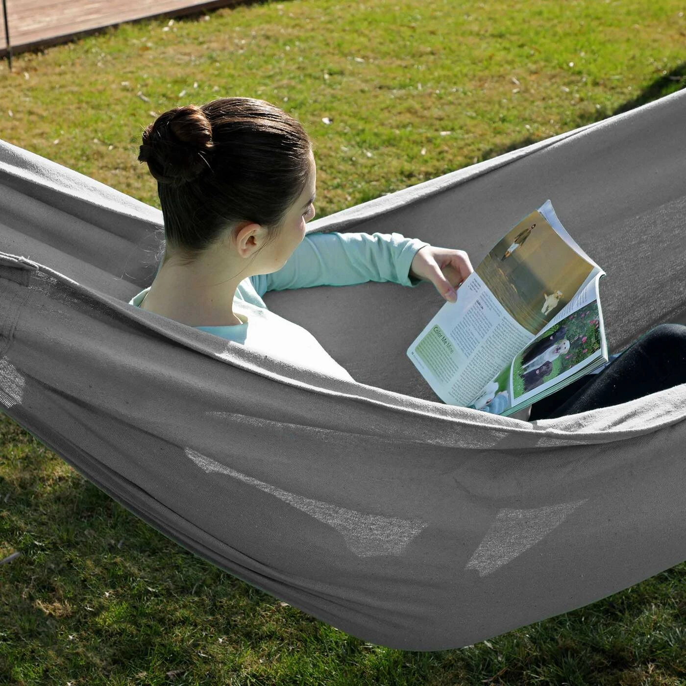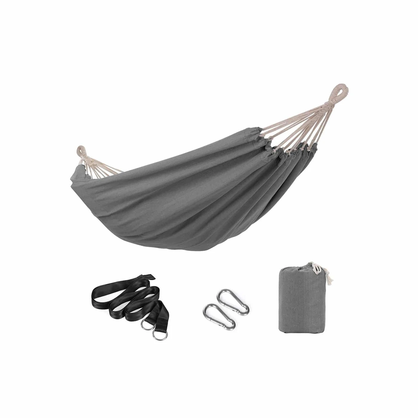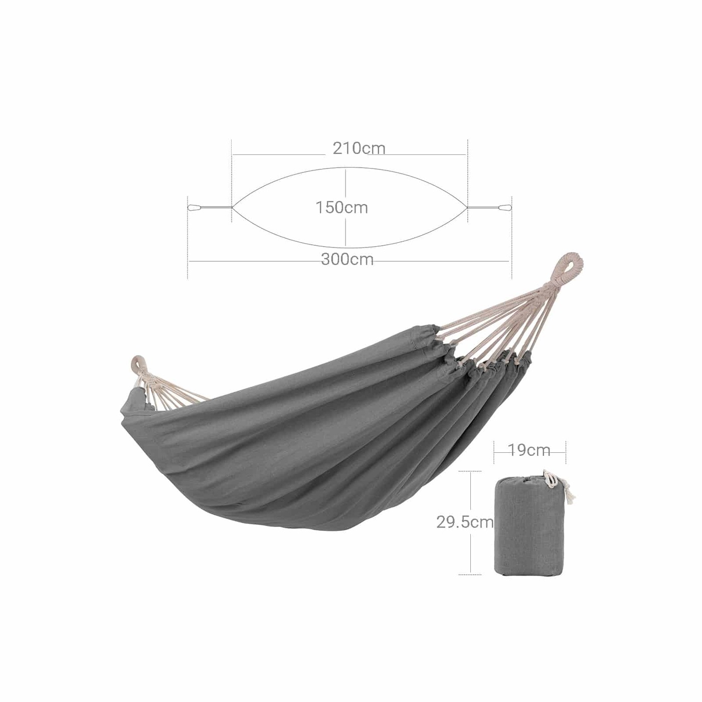 Aprašymas buvo automatiškai išverstas, gali pasitaikyti klaidų.Informacija apie gaminį: Spalva: Pilka Medžiaga: 70% medvilnė, 30% poliesteris Dydis: 210 x 150 cm (I x P) Dydis supakuotas: 28,5 x 17 cm (A x Ø) Svoris: 2,34 kg Maks. Statinė apkrova: 300 kg Pristatymo komplektas: 1 x hamakas 2 x tvirtinimo dirželis 1 x instrukcijos (DE, EN, FR, IT, ES)SONGMICS Pastabos: tikroji gaminio spalva gali šiek tiek skirtis nuo spalvos, parodytos mūsų paveikslėliuose. Taip yra dėl rodymo skirtingų tipų monitoriuose.Gaminio matmenys buvo nustatyti rankiniu būdu. Dėl to nukrypimai gali siekti iki 5 cm.. Gaminį galima pakrauti ne daugiau kaip 300 kg. Neviršykite šio maksimalaus svorio. Ilgą laiką nenaudojamą hamaką laikykite gerai apsaugotoje vietoje, kad jo nepatektų lietus ar stiprūs saulės spinduliai. Prieš naudodami įsitikinkite, kad jame nėra aštrių ar smailūs daiktai šalia ar po hamako daiktais Prieš naudodami visada patikrinkite tvirtinimo dirželių ir hamako būklę.