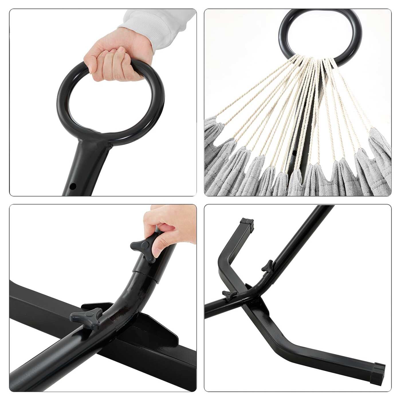 Aprašymas buvo automatiškai išverstas, gali pasitaikyti klaidų.Apsaugokite nuo rūpesčių: ar vis dar ieškote dviejų tinkamų medžių, prie kurių pritvirtinsite hamaką? O gal net planuojate savo sode pasodinti du medžius? Sustabdyti! Šiame hamake yra stovas. Jums tereikia skirti kelias minutes šiam hamako komplektui pastatyti ir jūsų sodas akimirksniu pavirs poilsio vieta. Mūsų raktinis žodis – komfortas! Pagamintas iš medvilnės-poliesterio audinio, hamakas yra kvėpuojantis ir patogus. Rėmas yra stabilus ir patikimas bei pagamintas iš tvirto metalo. Gulite hamake ir jaučiatės atsipalaidavę bei laimingi – koks patogus gyvenimas!Išsami informacija apie gaminį: Spalva: juodas rėmas, pilkas hamakas Medžiaga: metalas, medvilnė, poliesteris Rėmo dydis: 300 x 90 x 95 cm (I x P x A) Dydis hamakas: 210 x 150 cm (P x P) Svoris: 13 kg Maks. . Statinė apkrova: 240 kg Pristatymo apimtis: 1 x hamako stovas 1 x hamakas 1 x instrukcija SONGMICS Pastabos: Maksimali šio gaminio statinė apkrova yra 240 kg. Neviršykite šio maksimalaus svorio. Nelaikykite gaminio ilgą laiką tiesioginiuose saulės spinduliuose. Prieš atsiguldami visada patikrinkite hamako stabilumą.