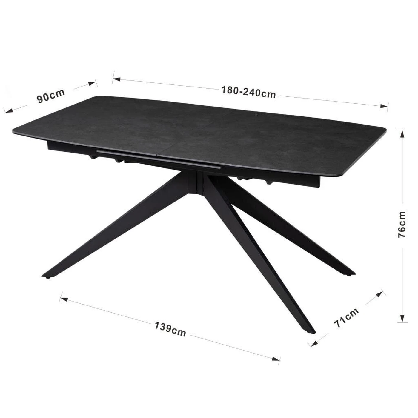 Išskirtinis stalviršis pagamintas iš 6 mm juodos keramikos ir padengtas 6 mm dažytu juodu stiklu, suteikiančiu jam ypatingos elegancijos ir paverčiant jį prabangia puošmena Jūsų namuose. Stalo kojos padengtos milteliniu juodu sluoksniu ir suprojektuotos taip, kad stalas išliktų stabilus.