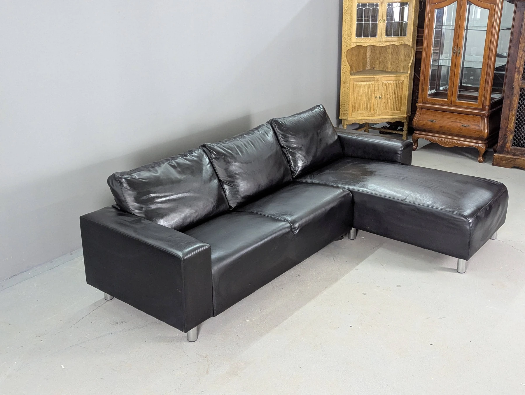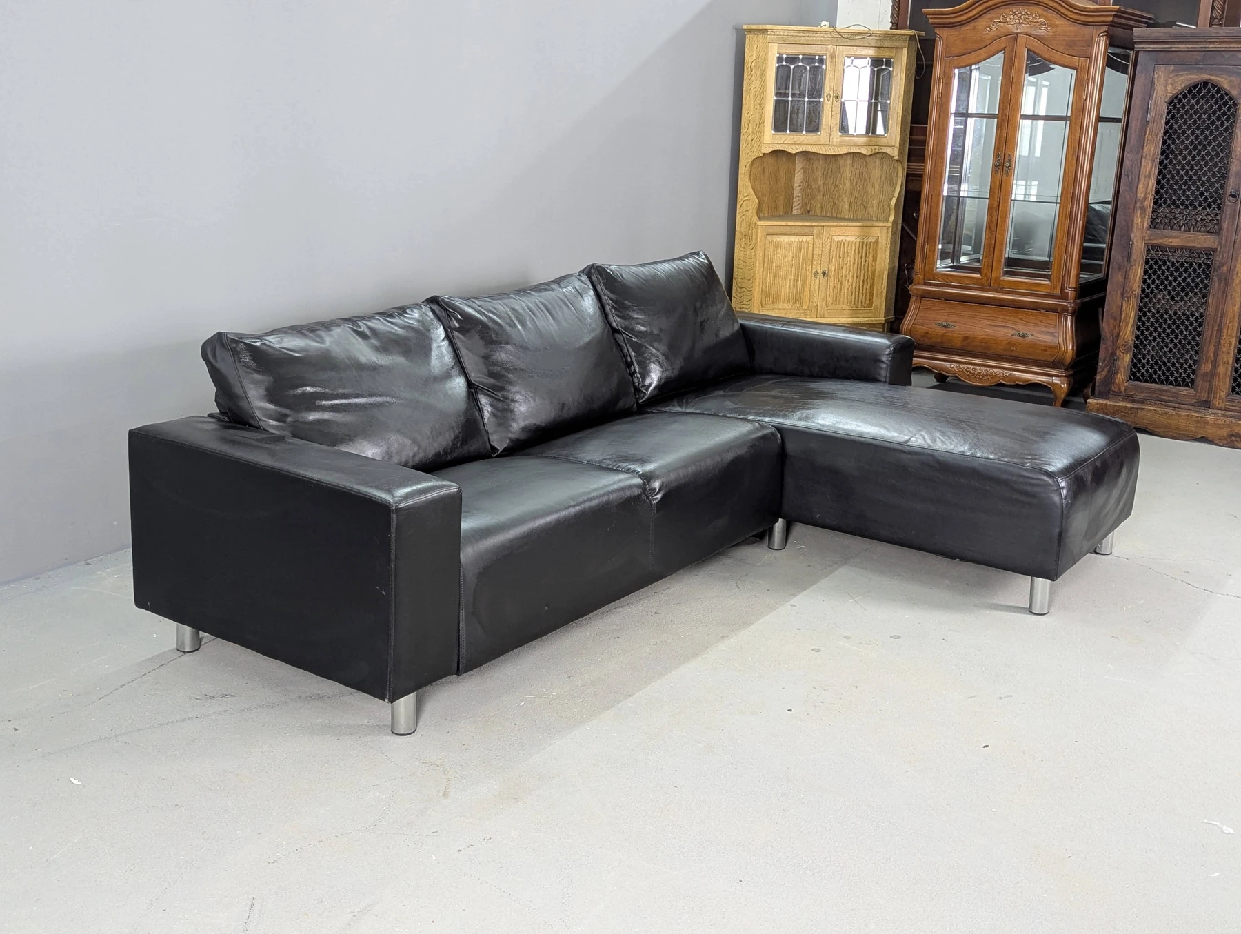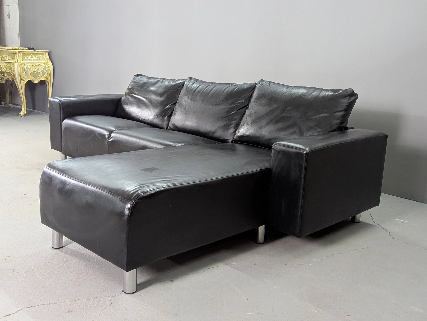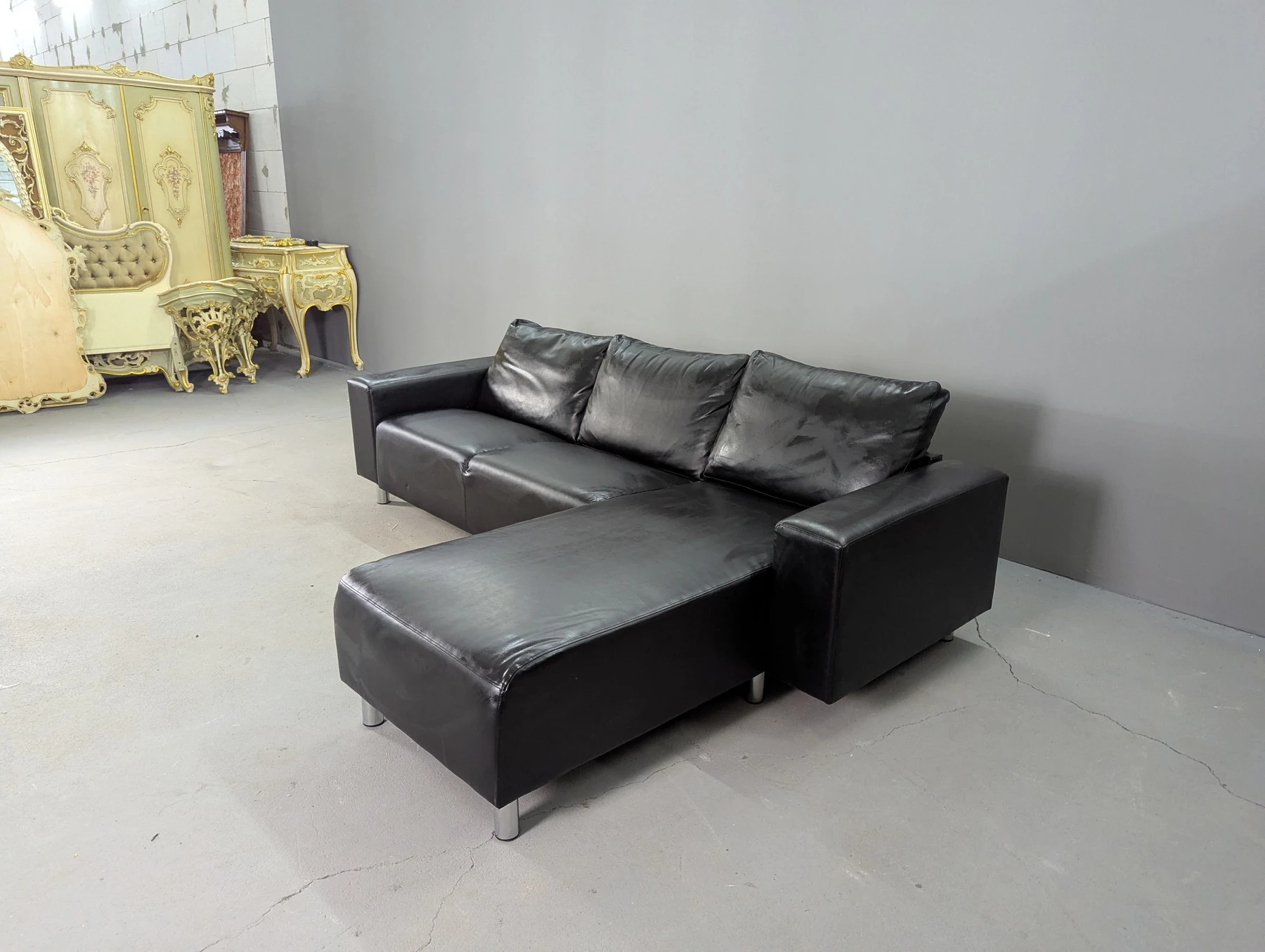 Juoda kampinė sofa – paprasto silueto, šiuolaikiško dizaino baldas. Metalinės kojelės, platūs porankiai ir minkšti atlošai kuria patogią bei estetišką poilsio zoną. Puikiai tinka moderniam ar industriniam interjerui, svetainei, studijai ar poilsio erdvei.