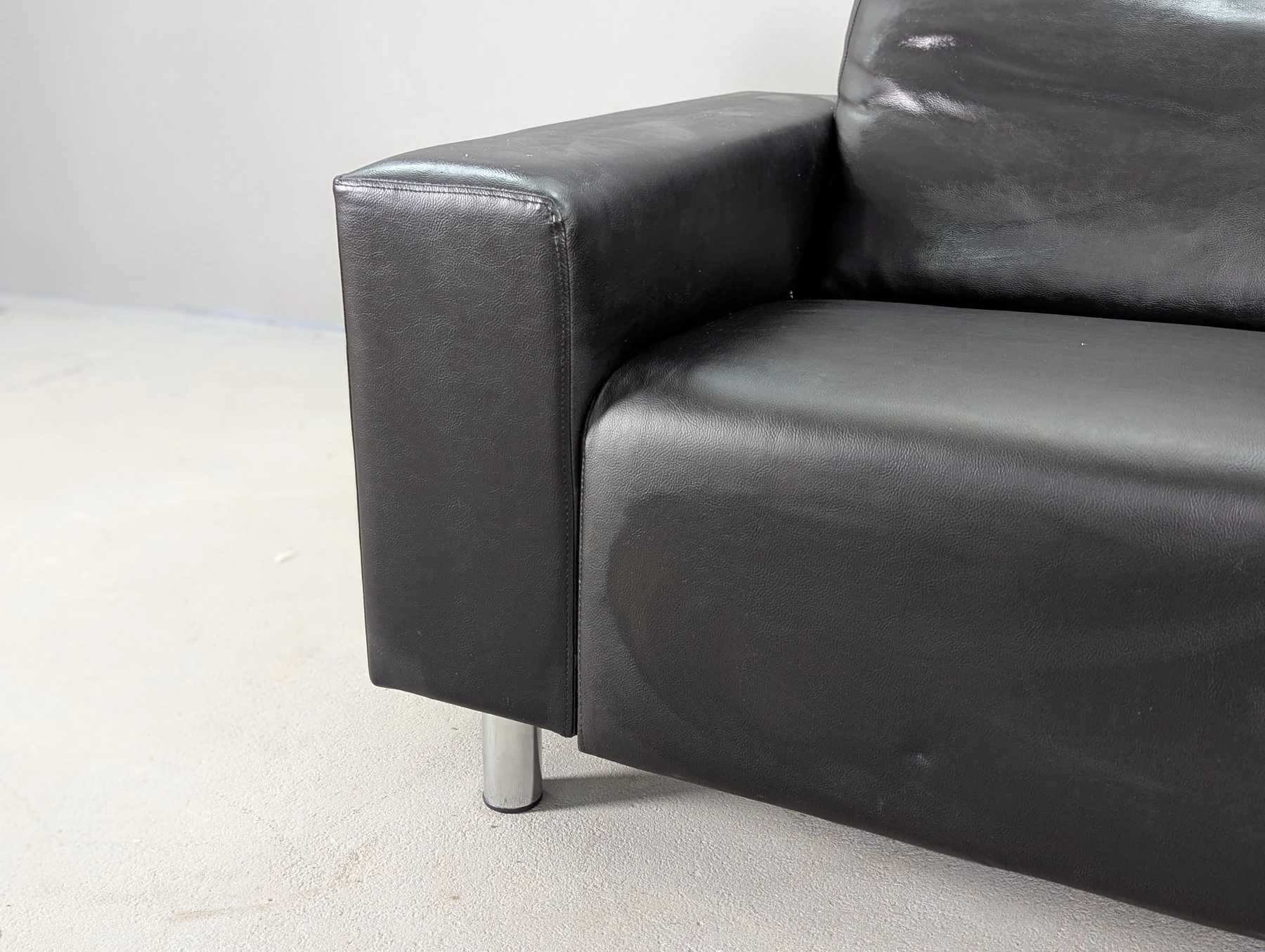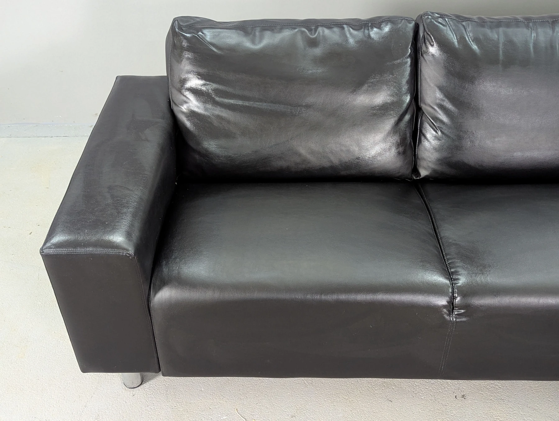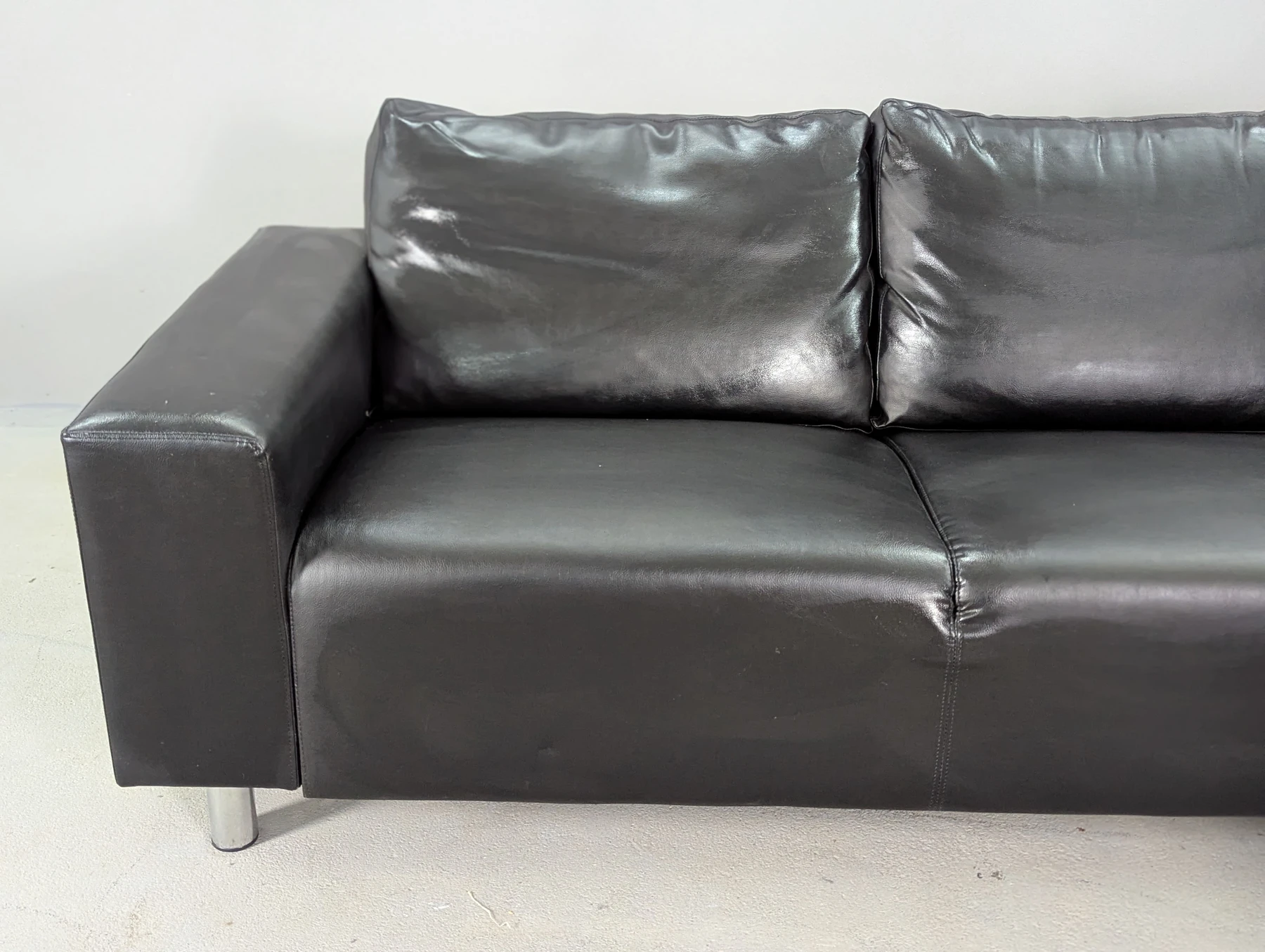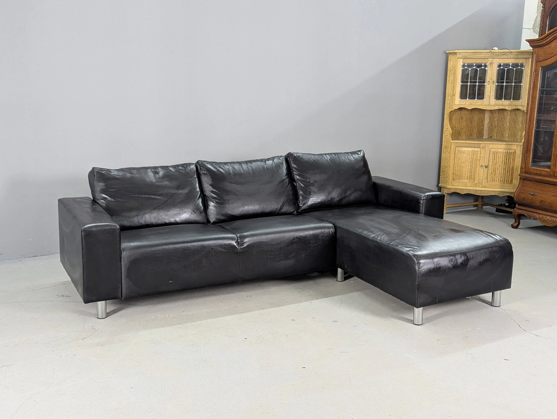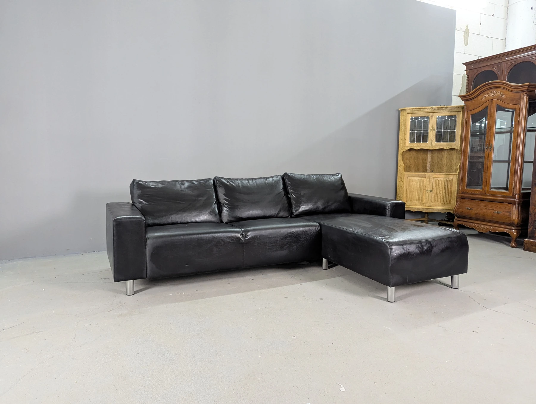 Juoda kampinė sofa – paprasto silueto, šiuolaikiško dizaino baldas. Metalinės kojelės, platūs porankiai ir minkšti atlošai kuria patogią bei estetišką poilsio zoną. Puikiai tinka moderniam ar industriniam interjerui, svetainei, studijai ar poilsio erdvei.