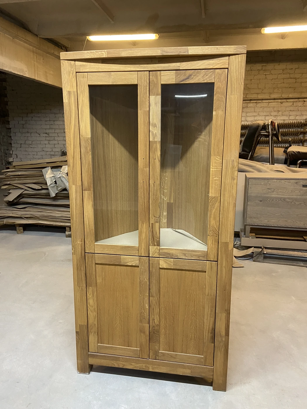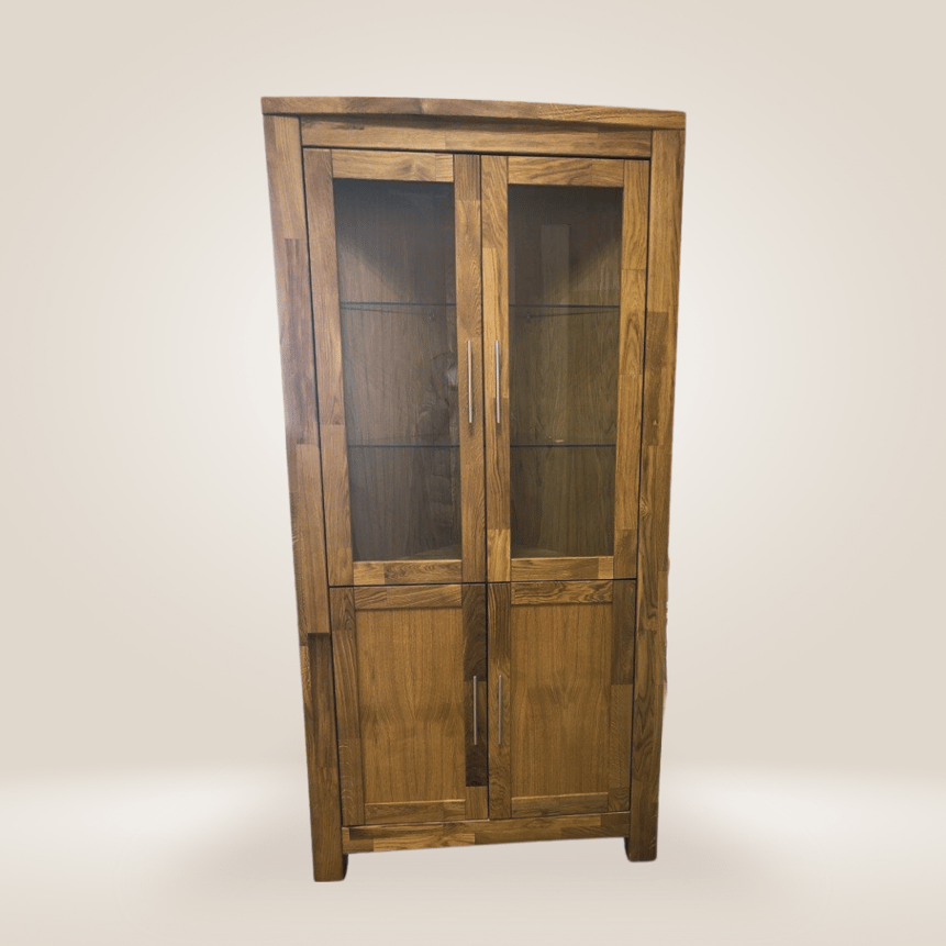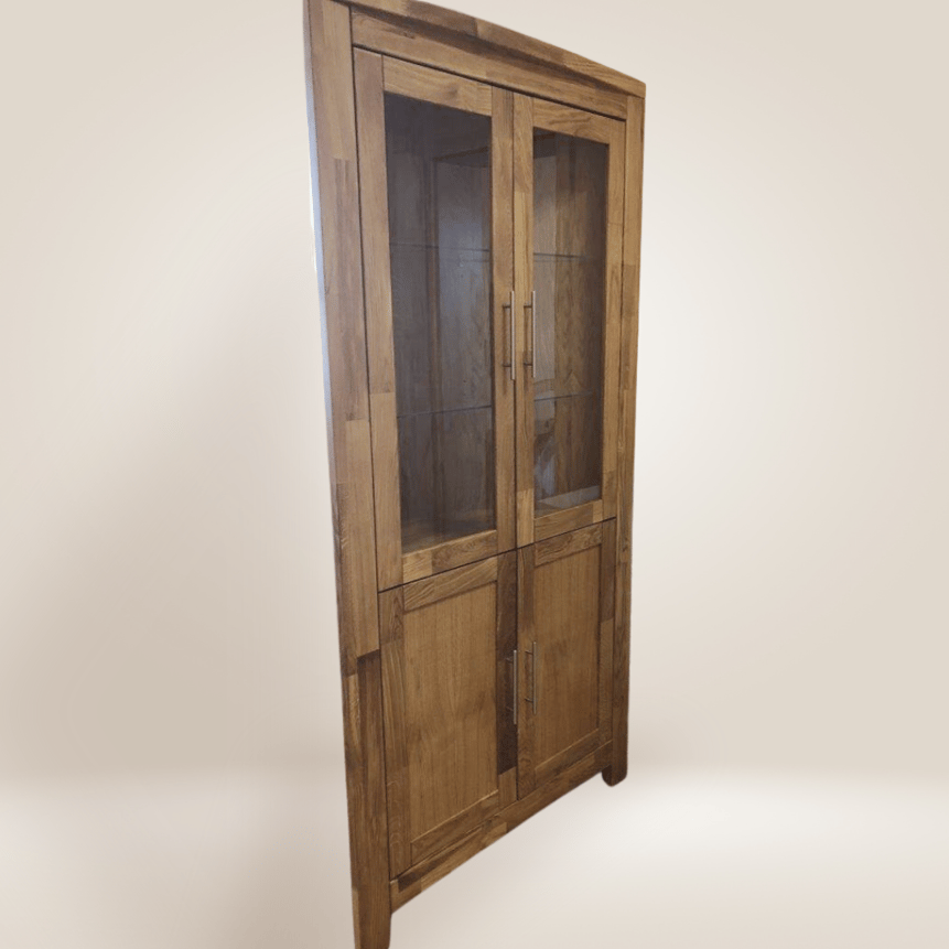 Kampinė indauja OMEGA yra trikampės prizmės formos, puikiai tinkanti skandinaviškam namų dizainui. Baldas pagamintas iš ąžuolo medžio masyvo ir faneruotės. Vitrinos viduje esti LED lempos.